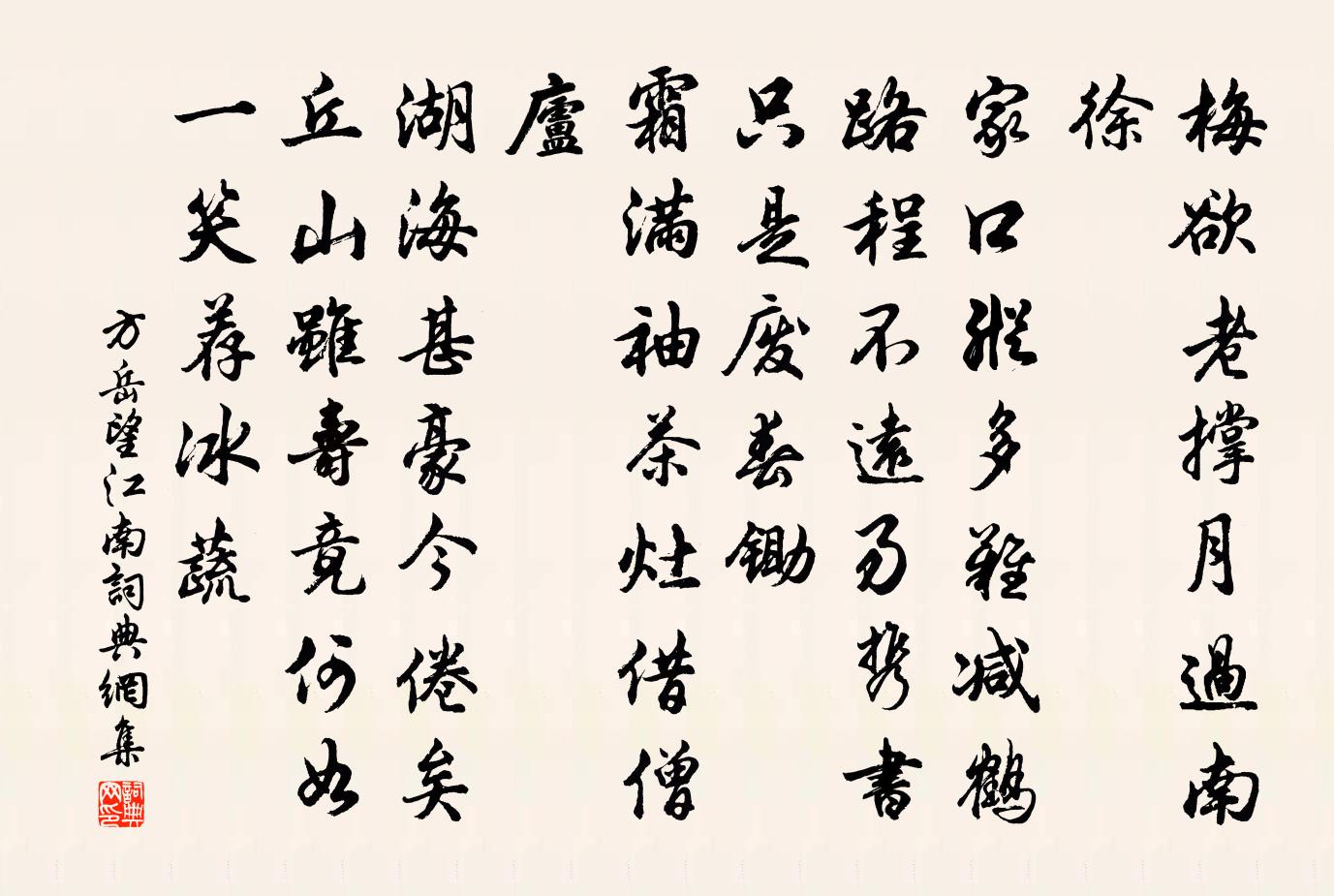 詩詞名句歷史字典書法欣賞書法字典國語詞典說文解字康熙字典古漢語字典標 題 作 者 詩 句 望江南/憶江南作者:方岳 朝代:宋代望江南/憶江南原文梅欲老,撐月過南徐。家口縱多難減鶴,路程不遠易攜書。只是廢春鋤。霜滿袖,茶灶借僧廬。湖海甚豪今倦矣,丘山雖壽竟何如。一笑薦冰蔬。詩詞問答問:望江南/憶江南的作者是誰?答:方岳問:望江南/憶江南寫於哪個朝代?答:宋代問:望江南/憶江南是什麼體裁?答:詞方岳望江南/憶江南書法欣賞望江南/憶江南書法作品詩詞推薦雪夜陸游〔宋代〕瓦疏雪墮檐,窗破風吹燭。短裘不及骭,手腳盡皸瘃。猶勝南鄰叟,一褐竟未贖。薄酒城中來,清夜聊相屬。相和歌辭。董逃行元稹〔唐代〕董逃董逃董卓逃,揩鏗戈甲聲勞嘈。剜剜深臍脂焰焰,人皆數嘆曰,爾獨不憶年年取我身上膏。膏銷骨盡煙火死,百舌真山民〔宋代〕花間報曉晴,巧弄百般聲。未可嫌饒舌,猶勝雁不鳴。減字木蘭花(贈孫興宗侍兒四首)王之道〔宋代〕修眉山遠。嬌抹烏雲秋水畔。酒里花前。坐擁斯人怎得寒。醁醽浮滿。須索空缸仍覆盞。正恐相妨。歸去如聞笑語和鄭戶部寶集丈室二首陳師道〔宋代〕遠遊游則遠,安心心已安。茅茨更何事,一坐五年寬。客來問法要,示以無所還。勿雲空生默,聽者不勝言。釣台二首繆瑜〔宋代〕王陽在位貢公喜,何況故人作天子。掉頭不肯從渠游,地把絲竿釣江水。欲將此意問遺靈,寂寞江山喚不應。至今漁家傲(與趙康靖公)歐陽修〔宋代〕四紀才名天下重。三朝構廈為梁棟。定冊功成身退勇。辭榮寵。歸來白首笙歌擁。顧我薄才無可用。君恩近許歸田詠史上項羽陳普〔宋代〕牧羊義帝實妨賢,猶有三綱共畏天。樹楚擊秦宜奮發,惡名何事苦爭先。卜運算元·贈樂婉杭妓施酒監〔宋代〕相逢情便深,恨不相逢早。識盡千千萬萬人,終不似、伊家好。別你登長道。轉更添煩惱。樓外朱樓獨倚闌,滿目平郴蠻楊冠卿〔宋代〕孽狐鬼嘯篁竹,紅綃帕首郴江曲。萬牛臠炙瓮行酒,黨伍穰穰萃林藪。牙璋夜半起兵符,雲旗驛騎爭馳驅。搜原剔送程左史以右撰知夔州分韻得重字魏了翁〔宋代〕菸草暝江湖,霜風纈郊壟。黎明北門道,雜遝冠蓋擁。程侯倦左墄,引去何太勇。滬江春信回,書殿星極捧。帝念偈頌八十五首釋妙倫〔宋代〕轉身動腳,開口露牙。明明是我,的的非它。衲僧不肯向省要處受用,甘自區區於道途之上。真可惜,誠可嗟。瑞龍湫瀑戴栩〔宋代〕石壁百尋高,噀空飛雪濤。鳥窺翻進退,龍住本雄豪。長嘯勢隨壯,細聽聲忽逃。沫霏侵佛像,境淨絕溪毛。峻頂候使登石頭驛樓作張九齡〔唐代〕山檻憑南望,川途眇北流。遠林天翠合,前浦日華浮。萬井緣津渚,千艘咽渡頭。漁商多末事,耕稼少良疇。自守師伯渾自通義來且出詩一軸為之喜甚奉簡短作晁公溯〔宋代〕通義固多賢,我昔守此邦。不肯入城府,私獨敬老龐。今誰念我去,帳空列麾幢。感子能遠來,香醪發春缸。共登山隱竣事海棠正花二首錢時〔宋代〕春風亭館久生埃,不見花開知幾回。日日登山君莫笑,山翁不為海棠來。賦虛谷黃子羽所藏吳山西墨蘭三章陳著〔宋代〕虛谷兮委蛇,雲英英兮日遲遲。繁陰兮土滋,蘭之生兮彼桃李其安知。長孺幼安作西湖之游不以告某與元受明日二公王灼〔宋代〕滿城撲面戰黃塵,蠟屐故尋湖上春。千頃煙波初弄日,四年魚鳥恰知人。有時覽勝緣搜句,無術驅愁但飲醇。可笑解連環(留別姜石帚)吳文英〔宋代〕思和雲結。斷江樓望睫,雁飛無極。正岸柳、衰不堪攀,忍持贈故人,送秋行色。歲晚來時,暗香亂、石橋南北。二十四詩品司空圖〔唐代〕畸人乘真,手把芙蓉,泛彼浩劫,窅然空縱。月出東□,好風相從,太華夜碧,人聞清鍾。虛佇神素,脫然畦封,名句推薦論山水,則循聲而得貌;言節侯,則披文而見時。劉勰《文心雕龍·辨騷》 瑤草一何碧,春入武陵溪。黃庭堅《水調歌頭·遊覽》 碧水驚秋,黃雲凝暮,敗葉零亂空階。秦觀《滿庭芳·碧水驚秋》 笑綠鬟鄰女,倚窗猶唱,夕陽西下。蔣捷《女冠子·元夕》 假令風歇時下來,猶能簸卻滄溟水李白《上李邕》 昨夜笙歌容易散,酒醒添得愁無限馮延巳《鵲踏枝·梅落繁枝千萬片》 莫失莫忘,仙壽恆昌。曹雪芹《紅樓夢·第八回》 玉樹猶難伸,壓倒千竿竹。環山樵《薛寶釵·雪竹》 稚子金盆脫曉冰,彩絲穿取當銀鉦。楊萬里《稚子弄冰》 惻隱之心,人皆有之孟子《孟子·告子章句上·第六節》