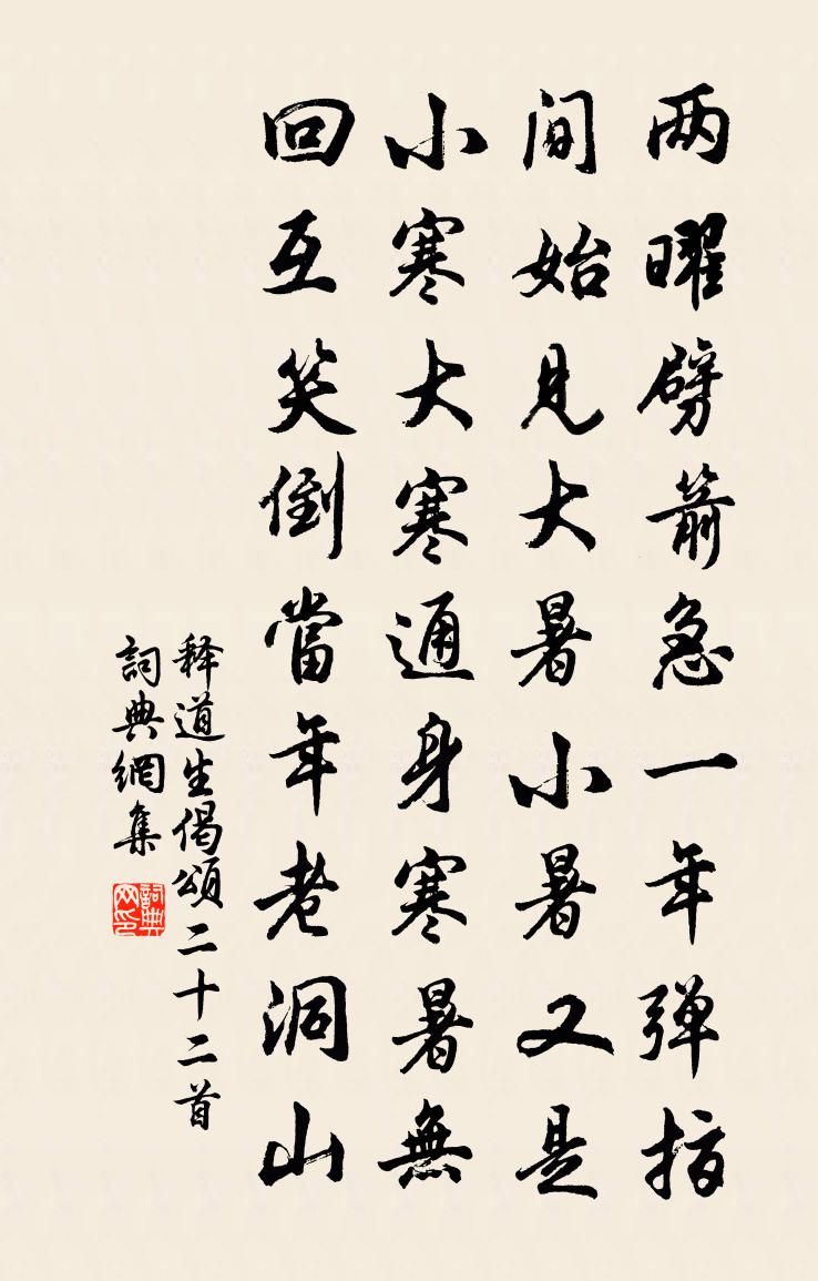詩詞名句歷史字典書法欣賞書法字典國語詞典說文解字康熙字典古漢語字典標 題 作 者 詩 句 偈頌二十二首作者:釋道生 朝代:宋代偈頌二十二首原文兩曜劈箭急,一年彈指間。始見大暑小暑,又是小寒大寒。通身寒暑無回互,笑倒當年老洞山。詩詞問答問:偈頌二十二首的作者是誰?答:釋道生問:偈頌二十二首寫於哪個朝代?答:宋代釋道生偈頌二十二首書法欣賞偈頌二十二首書法作品詩詞推薦傷靡草雍陶〔唐代〕靡草似客心,年年亦先死。無由伴花落,暫得因風起。學舍直歸晚霽三首宋祁〔宋代〕聚雨挫炎威,歸軒廣陌西。渠聲流作瀑,日腳側成霓。換錦龍媒埒,淹花燕子泥。比來巾角墊,李郭定相攜。喜雪朱翌〔宋代〕嘉瑞真成一旦逢,寄箋天下托鵬風。分無侑坐歌眉綠,全有挑蔬凍指紅。畫史莫傳飛舞熱,詩人俱盡琢磨工。此間勝勝慢/聲聲慢李商英〔宋代〕香浮椒柏,暖入酴酥,非煙曉生簾幕。絳闕真仙,來自五雲樓閣。青霽路岐游遍,排冠歸、水晶城郭。蕭散處,有燈下讀魏彥成諸公詩因次其韻呈曾子修諸君王之道〔宋代〕距春尚旬月,春信已回柳。時來芝與菌,往往出糞朽。流俗不自重,困窮變操守。貴賤等人耳,未易遽薄厚。桃李將之天長題新亭壁二首張耒〔宋代〕新亭登眺解征鞍,飛鳥悠揚雲意閒。誰謂塵埃無野興,故乘風雨看秋山。嘗桃楊萬里〔宋代〕金桃兩飣照銀杯,一是栽來一買來。香味比嘗無兩樣,人情畢竟愛親栽。送張升卿宰新滏岑參〔唐代〕官柳葉尚小,長安春未濃。送君潯陽宰,把酒青門鍾。水驛楚雲冷,山城江樹重。遙知南湖上,只對香爐峰。送廉村宗人薛庭芝薛如晦還里薛嵎〔宋代〕老我儒冠誤,憐君亦固窮。山川居壤異,友愛所天同。江渡乘潮闊,霜林逐曉空。永懷楸壠敬,淹泊志難通。刺賈似道大學生〔宋代〕昨夜江頭長碧波,滿船都載相公蟺醝。雖知要作調羹用,未必調羹用許多。謝查元吉借示傃軒今是齋巢室三書項安世〔宋代〕堂堂傃軒翁,學古無不探。詁訓尊六經,文章妙瞿曇。大兒號今是,思若春波涵。最長作千百,時用經訓參。猶子五郊樂章。雍和魏徵〔唐代〕昭昭丹陸,帟帟炎方。禮陳牲幣,樂備篪簧。瓊羞溢俎,玉z0浮觴。恭惟正直,歆此馨香。陳了翁祠釋道璨〔宋代〕一窗南日照芳祠,憂國空存兩鬢絲。更化早知成紹述,平舟悔不用元龜。刳腸龜齊己〔唐代〕爾既能於靈,應久存其生。爾既能於瑞,胡得迷其死。刳腸徒自屠,曳尾復何累。可憐濮水流,一葉泛莊子。茱萸菊史鑄〔宋代〕品出陶家花品外,名存吳地藥名中。若將泛人重陽酒,不用分香摘兩叢。祗答洛台資政房春卿侍郎宋祁〔宋代〕青綾補罷歇徐薰,精吏多年嘆不文。病合避賢拋內署,老堪為帥忝中軍。聲名已愧空如餅,富貴原知薄似雲。多謝謝馮貫道惠小舟馮時行〔宋代〕先生憐我欲歸休,為我添錢買小舟。老去尚余州縣業,見來便起江湖秋。有名如合稱聱叟,無夢焉能賣直鉤。他日悼亡九首張耒〔宋代〕菊花還似去年黃,一寸愁心萬事傷。獨立高樓對殘日,秋風吹得淚千行。寶泉寺送李益端公歸邠寧幕盧綸〔唐代〕參差岩障東,雲日晃龍宮。石淨非因雨,松涼不為風。戀泉將鶴並,偷果與猿同。眼界塵雖染,心源蔽已通。蓮花舟行英德江上和許季如詩戴復古〔宋代〕趺坐篷窗底,客身無事時。閒觀曲江帖,因和許渾詩。舟楫聊乘興,溪山若獻奇。數峰英石美,天巧豈人為。名句推薦碧山學士焚銀魚,白馬卻走深岩居杜甫《柏學士茅屋》 楊花榆莢無才思,惟解漫天作雪飛。韓愈《晚春》 寒禽與衰草,處處伴愁顏。司空曙《賊平後送人北歸》 老去悲秋強自寬,興來今日盡君歡。杜甫《九日藍田崔氏莊》 但願人長久,千里共嬋娟。蘇軾《水調歌頭·丙辰中秋》 子不能治子之身,惡能治國政。墨子《墨子·48章 公孟》 黎明即起,灑掃庭除,要內外整潔;既昏便息,關鎖門戶,必親自檢點。朱柏廬《朱子家訓·全文》 心既托聲於言,言亦寄形於字劉勰《文心雕龍·練字》 歲暮百草零,疾風高岡裂。杜甫《自京赴奉先縣詠懷五百字 / 自京赴奉先詠懷五百字》 流水不腐,戶樞不蠹呂不韋《呂氏春秋·紀·季春紀》