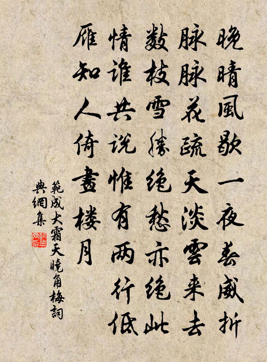 起首二句先寫天氣轉變之佳:傍晚,天晴了,風歇了 ,春寒料峭的威力,有所折損。用一“折”字,益見原來春寒之厲,現在春暖之和。緊接“晚晴風歇”,展示了一幅用淡墨素彩勾畫的絕妙畫面。脈脈,是含情的樣子;“花疏”,點出梅花之開。以“脈脈”加諸“花疏天淡”之上,就使人感到不僅那脈脈含情的梅花,就連安詳淡遠天空也仿佛在向人致意呢。“天淡”是靜態,接“雲來去”成為動態 ,更見“晚晴風歇”之後 ,氣清雲閒之美。“花疏”與“天淡”相諧,既描寫了“天”之“淡”,所以末一句“數枝雪”,又形象地勾畫了“梅”之“ 疏”。如此精心點筆。生動景物立於眼前了“脈脈”二,也就不是泛泛而說了。顯然,詞人綴字的針線是十分細密的;而其妙處在天然渾成,能夠運密入疏。