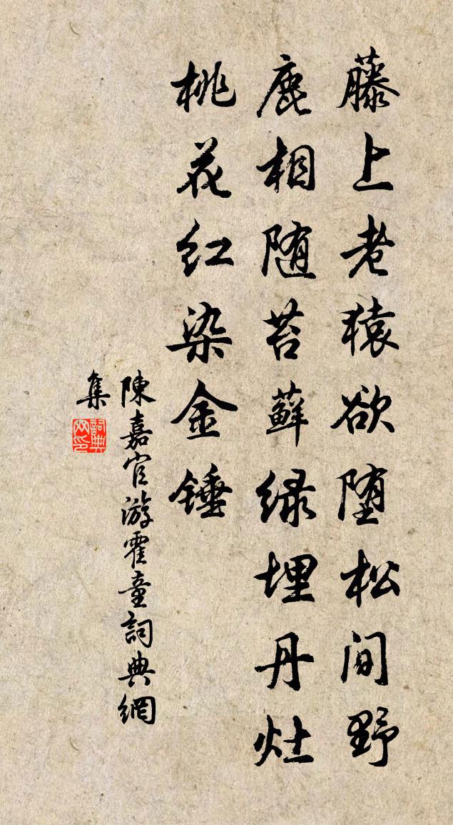 詩詞名句歷史字典書法欣賞書法字典國語詞典說文解字康熙字典古漢語字典標 題 作 者 詩 句 游霍童作者:陳嘉官 朝代:宋代游霍童原文藤上老猿欲墮,松間野鹿相隨。苔蘚綠埋丹灶,桃花紅染金錘。詩詞問答問:游霍童的作者是誰?答:陳嘉官問:游霍童寫於哪個朝代?答:宋代陳嘉官游霍童書法欣賞游霍童書法作品詩詞推薦瑞泉庵蘇欽〔宋代〕當年正覺此韜藏,岩穴於今尚有光。特特捫蘿訪遺蹟,龍神何事報支郎。偈頌八十五首釋妙倫〔宋代〕峰頭異角靈毛,澗底錦鱗赬尾。各各性命一條,都在山僧手裡。今日放開線路,也不妨自馳自驟,自飛淘沙得金,宿贊公房(京中大雲寺主謫此安置)杜甫〔唐代〕杖錫何來此,秋風已颯然。雨荒深院菊,霜倒半池蓮。放逐寧違性,虛空不離禪。相逢成夜宿,隴月向人圓。踏莎行沈注〔宋代〕竹閣雲深,巢虛人闃。幾年湖上音塵寂。風流今有使君家,月明夜夜聞雙笛。隱潭郟修輔〔宋代〕在昔知何人,鑿破青山骨。飛泉直下來,千尺瀉倏忽。兩壁蒼翠間,一陣風雷突。傍無塵埃蹤,中有蛟龍窟。寒氣酹江月/念奴嬌林式之〔宋代〕桐皋東去,又依然、煙際雲邊柔櫓。賴有雙台知己耳,牢落孤懷欲吐。小倚雲根,細商心事,提起千年語。九天飛天香唐藝孫〔宋代〕螺甲磨星,犀株杵月,蕤英嫩壓拖水。海蜃樓高,仙蛾鈿小,縹緲結成心字。麝煤候暖,載一朵、輕雲不起。銀葉游三游洞游洞之日有亭吏乞詩既為留三絕句於蘇軾〔宋代〕一徑繞山翠,縈紆去似蛇。忽驚溪水急,爭看洞門呀。滑磴攀秋蔓,飛橋踏古槎。三扉迎北吹,一穴向西斜。嘆息袞繡球花方回〔宋代〕舞姬初試薄羅衣,趁蝶隨蜂玩午暉。各折一枝入深院,歡聲贏得繡球歸。致政少卿邵公輓辭三首蘇頌〔宋代〕屢試循良政,兼推乾裕才。惠和綏列郡,風績振行台。始見彤襜去,遄驚畫翣回。甘棠猶蔽芾,高隴已崔嵬。病中寄武公望二首廖行之〔宋代〕輕去千金若棄遺,高情勇決固應稀。端來共我茅一把,不肯折君腰十圍。世事彈棋無定局,人情蒙穽有深機。生涯贈楊子中陳允平〔宋代〕鳳梧鸞竹郁青蔥,文氣沖沖五色虹。囊里短歌唐李賀,酒邊奇字漢揚雄。銅鋪雨後芭蕉綠,石井霜前薜荔紅。茶灶絕句二首孫發〔宋代〕山家一尺瀟湘石,掃盡雲腴齒頰清。警破午窗箕潁夢,轉為風外小松聲。浣溪沙蔡伸〔宋代〕苹末風輕入夜涼。飛橋畫閣跨方塘。月移花影上迴廊。粲枕隨釵雲鬢亂,紅綿撲粉玉肌香。起來攜手看鴛鴦。句蔡雍〔宋代〕滿前青嶂千屏列,直下澄江一帶橫。金剛隨機無盡頌無法可得分第二十二釋印肅〔宋代〕迦葉金欄外,多少人不會。應以色求我,不妨淪劫背。春晚獨游沂公園宋庠〔宋代〕幾曲鳴溪抱嘯台,陰陰野氣壓浮埃。林間幽鳥自相語,水上落花何處來。逃相故畦無廢汲,封侯修竹是元栽。三川偈頌一百二十三首釋祖欽〔宋代〕一切法離分別相,依前諸相自如如。春風影里乾坤大,無限江山開畫圖。元夕病中方岳〔宋代〕家貧近市常喧啾,燈夕無燈冷於水。罷參法喜深炷香,示疾維摩低隱几。梅花相親不余負,酒盞成疏竟誰使。一生頌古一百首釋智愚〔宋代〕煙暖土膏民氣動,一犁新雨破春耕。效原眇眇青無際,野草閒花次第生。名句推薦攜壺酌流霞,搴菊泛寒榮。李白《九日》 少年射虎名豪,等閒赤羽千夫膳元好問《水龍吟·從商帥國器獵於南陽同仲澤鼎玉賦此》 庶人莫與官爭,貴人不結人怨。來俊臣《羅織經·保身卷第七》 數年來往鹹京道,殘杯冷炙謾消魂晏殊《山亭柳·贈歌者》 有理言自壯,負屈聲必高。馮夢龍《警世通言·卷十五》 竹疏虛檻靜,松密醮壇陰。張泌《女冠子·露花菸草》 眾鳥高飛盡,孤雲獨去閒。李白《獨坐敬亭山》 歌泣不成天已暮,悲風日夜起江生。魏禧《登雨花台》 秋光一片,問蒼蒼桂影,其中何物?趙秉文《大江東去·用東坡先生韻》 昔孟母,擇鄰處。子不學,斷機杼。王應麟《三字經·全文》