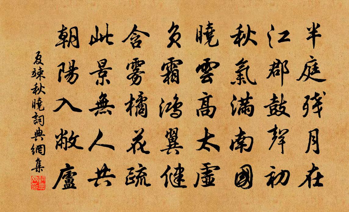 詩詞名句歷史字典書法欣賞書法字典國語詞典說文解字康熙字典古漢語字典標 題 作 者 詩 句 秋曉作者:夏竦 朝代:宋代秋曉原文半庭殘月在,江郡鼓聲初。秋氣滿南國,曉雲高太虛。負霜鴻翼健,含霧橘花疏。此景無人共,朝陽入敝廬。詩詞問答問:秋曉的作者是誰?答:夏竦問:秋曉寫於哪個朝代?答:宋代夏竦秋曉書法欣賞秋曉書法作品詩詞推薦承議郎王東起輓辭二首晁說之〔宋代〕洛下書生譽,秦川公子豪。飄零諸老恨,骯髒此生勞。病臥分丹劑,魂游問室皋。當時蠻紙在,絮酒共蕭騷。慈母岩亮長老頌黃庭堅〔宋代〕敕書改律為禪,意在無力宗空,人慾破禪作律,群兒更助之攻。莫恨塞翁失馬,會取楚人亡弓。老夫亦不掩耳,我秦世謠佚名〔先秦〕秦始皇。何彊梁。開吾戶。據吾床。飲吾酒。唾吾漿。飧吾飯。以為糧。張吾弓。射東牆。前至沙丘當滅亡。一半兒查德卿〔元代〕自調花露染霜毫,一種春心無處托。欲寫又停三四遭。絮叨叨,一半兒連真一半兒草。早春郭知運〔宋代〕年來飄泊任西東,解組論文意自雄。臘盡竺溪漁唱晚,杏花溪上又春風。新樓詩二十首南庭竹李紳〔唐代〕東南舊美凌霜操,五月凝陰入坐寒。煙惹翠梢含玉露,粉開春籜聳琅玕。莫令戲馬童兒見,試引為龍道士看。知爾浣溪沙(賦春雪追和東坡韻四首)王之道〔宋代〕陽氣初升土脈蘇。東郊人散欲回車。一時春雪十年無。魚枕蕉深浮酒蟻,鹿胎冠子粲歌珠。題詩不覺燭然須。秦樓月/憶秦娥黎廷瑞〔宋代〕花孤冷。海棠聘與花應肯。花應肯。海棠只是,無香堪恨。香無卻有仙風韻。能爭幾日芳期近。芳期近。東風何事祀風師迎神曲李中〔唐代〕太皞御氣,勾芒肇功。蒼龍青旗,爰候祥風。律以和應,□以感通。鼎俎修蠁,時惟禮崇。大夫松徐夤〔唐代〕五樹旌封許歲寒,挽柯攀葉也無端。爭如澗底凌霜節,不受秦皇亂世官。太清舞史浩〔宋代〕我今來訪煙霞侶。沸華堂簫鼓。疑是奏鈞天,宴瑤池金母。卻將桃種散階除,俾華實、須看三度。方記古人言,信菩薩蠻王安中〔宋代〕浦煙迷處回蓮步。步蓮回處 * 浦。羅綺媚橫波。波橫媚綺羅。細眉雙拂翠。翠拂雙眉細。歌意任情多。多情任意早梅柳宗元〔唐代〕早梅發高樹,迥映楚天碧。朔吹飄夜香,繁霜滋曉白。欲為萬里贈,杳杳山水隔。寒英坐銷落,何用慰遠客。贈李翱舒元輿〔唐代〕湘江舞罷忽成悲,便脫蠻靴出絳帷。誰是蔡邕琴酒客,魏公懷舊嫁文姬。滿路花譚處端〔元代〕因師超苦海,舍俗探幽玄。頓居歡喜地、認貧閒。是非人我,豈論與愚賢。步步清涼路,信任遨遊,兀誰知恁恬然數日前夢一僧出二鏡求詩僧以鏡置日中其影甚蘇軾〔宋代〕君家有二鏡,光景如湛盧。或長如芭蕉,或圓如芙蕖。飛電著子壁,明月入我廬。月下合三壁,日月跳明珠。問子戊申年七夕五絕錢惟演〔宋代〕驪阜凌雲對玉鉤,千門高切絳河秋。欲聞天語猶嫌遠,更結三層乞巧樓。與友人過山寺戴叔倫〔唐代〕共有春山興,幽尋此日同。談詩訪靈徹,入社愧陶公。竹暗閒房雨,茶香別院風。誰知塵境外,路與白雲通。西岩翠屏閣陸游〔宋代〕把酒孤亭半日留,西岩獨擅鶴山秋。也知絕境終難賦,且喜閒身得縱游。鶻起危巢時磔磔,鹿鳴深澗暮呦呦。人生和綿州於中丞登越王樓作李汶儒〔唐代〕珍重巴西守,殷勤寄遠情。劍峰當戶碧,詩韻滿樓清。日照涪川闊,煙籠雪嶠明。徵黃看即及,莫嘆滯江城。名句推薦知者不惑,仁者不憂,勇者不懼。孔子弟子《論語·子罕篇》 醉不成歡慘將別,別時茫茫江浸月。白居易《琵琶行 / 琵琶引》 賤禮義而貴勇力,貧則為盜,富則為賊。荀子《荀子·樂論》 翹思慕遠人,願欲托遺音。曹植《雜詩六首·其一》 春水碧於天,畫船聽雨眠。韋莊《菩薩蠻·人人盡說江南好》 昨夜笙歌容易散,酒醒添得愁無限馮延巳《鵲踏枝·梅落繁枝千萬片》 佳人相對泣,淚下羅衣濕。李師中《菩薩蠻·子規啼破城樓月》 君子遺人以財,不若善言。佚名《孔子家語·六本》 今宵剩把銀釭照,猶恐相逢是夢中。晏幾道《鷓鴣天·彩袖殷勤捧玉鍾》 和平處事,勿矯俗為高;正直居心,勿設機以為智。王永彬《圍爐夜話·第六五則》