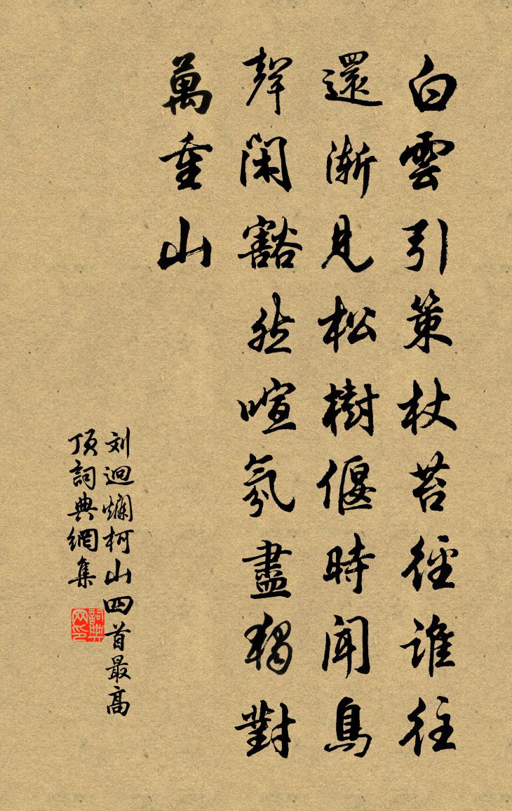 詩詞名句歷史字典書法欣賞書法字典國語詞典說文解字康熙字典古漢語字典標 題 作 者 詩 句 爛柯山四首。最高頂作者:劉迥 朝代:唐代爛柯山四首。最高頂原文白雲引策杖,苔徑誰往還。漸見松樹偃,時聞鳥聲閒。豁然喧氛盡,獨對萬重山。詩詞問答問:爛柯山四首。最高頂的作者是誰?答:劉迥問:爛柯山四首。最高頂寫於哪個朝代?答:唐代問:爛柯山四首。最高頂是什麼體裁?答:五古劉迥爛柯山四首。最高頂書法欣賞爛柯山四首。最高頂書法作品詩詞推薦山園小梅得疏影橫斜水清淺暗香浮動月黃十四趙時韶〔宋代〕前山日落已棲鴉,老樹差牙竹半遮。沙岸寒雪迷晚眺,祗疑金 * 中花。仙岩二首王貞白〔唐代〕白煙晝起丹灶,紅葉秋書篆文。二十四岩天上,一雞啼破晴雲。風呼山鬼服役,月照衡薇結花。江暖客尋瑤草,洞王性之自揚州迂路相訪于海陵荷其意厚非平日晁說之〔宋代〕九死性命存,乃到海陵倉。每陵何所有,麋鹿畫成行。多倉多麋鹿,今也恨難忘。爰從本朝來,人物上國光。容我生查子晏幾道〔宋代〕紅塵陌上游,碧柳堤邊住。才趁彩雲來,又逐飛花去。深深美酒家,曲曲幽香路。風月有情時,總是相思處。後園老格為園丁斧而薪之有所存者直乾危梢耳戴栩〔宋代〕爾梅生不辰,失身蔬茹圃。雖沾灌溉力,卻受穢濁侮。未能同臭味,只得共甘苦。青隨菜甲肥,翠引蒿芽吐。與時寄僧尚顏裴說〔唐代〕曾居五老峰,所得共誰同。才大天全與,吟精楚欲空。客來庭減日,鳥過竹生風。早晚搖輕拂,重歸瀑布中。送歸篇釋文珦〔宋代〕秋老木葉乾,露冷蟲聲死。征人未授衣,鄉心日千里。揮手睇雲帆,頃刻限煙水。他時慰相思,遠寄書一紙。浣溪沙·半踏長裾宛約行孫光憲〔唐代〕半踏長裾宛約行,晚簾疏處見分明,此時堪恨昧平生。早是銷魂殘燭影,更愁聞著品弦聲,杳無訊息若為情。蘭陵王(涵碧)曹冠〔宋代〕晚雲碧。松巘飛泉翠滴。雙魚畔、疑是永和,曲水流觴舊風物。波光映山色。時見輕鷗出沒。壺天邃,修竹翠陰,和李僕射雨中寄盧、嚴二給事張籍〔唐代〕郊原飛雨至,城闕濕雲埋。迸點時穿牖,浮漚欲上階。偏滋解籜竹,並灑落花槐。晚潤生琴匣,新涼滿藥齋。從容贈眼科舒醫士陶夢桂〔宋代〕此老年來醫有靈,病眸才洗便增明。教儂還盡讀書債,頭白依然對短檠。安福界上遠山之巔樵者頗眾而山色如墨蓋燒余趙蕃〔宋代〕日上野燒沒,雲端樵路分。猿猱同矯矯,斤斧競紛紛。有婦能供餉,攜籃更采芹。田桑雖未動,爾事亦云勤。湖塘晚眺陸游〔宋代〕綠樹暗村墟,青山繞草廬。奉祠神禹舊,馳道暴秦余。浦色沉煙網,畦聲入雨鉏。清秋又如許,幽憤若為攄?未展芭蕉錢〔唐代〕冷燭無煙綠蠟乾,芳心猶卷 * 。一緘書札藏何事,會被東風暗拆看。書懷四首胡宏〔宋代〕含笑花開洲上,忘憂草發台邊。底事當憂莫忘,忘時便是無天。武關西逢配流吐番(謫潮州時途中作)韓愈〔唐代〕嗟爾戎人莫慘然,湖南地近保生全。我今罪重無歸望,直去長安路八千。解首座職事書記相招以偈力辭釋正覺〔宋代〕原鴒能作歸呼音,暮風墮葉秋在林。路沙漠漠水潏潏,夜色冉冉山陰陰。坐冠多士自省短,挽袂乃友相知深。乞與賢者之孝二百四十首妹土小子林同〔宋代〕勤耕藝黍稷,遠賈服車牛。奔走何為者,心乎教養憂。洛浦善先長老贈詩自方無本惠勤答詩二首劉克莊〔宋代〕入佛名無本,歸儒字浪仙。韓公雖稍黠,不曉句參禪。答客宋祁〔宋代〕賤子空虛甚,何煩跪自陳。摧藏不鳴雁,排迮後來薪。櫛短三秋發,途奔四海塵。安能得所欲,況是數奇人。名句推薦此際閒愁郎不共,月移窗罅春寒重。王士禎《蝶戀花·和漱玉詞》 顛狂柳絮隨風去,輕薄桃花逐水流。杜甫《絕句漫興九首·其五》 漳水出焉,東流注於河。佚名《精衛填海》 我閉南樓看道書,幽簾清寂在仙居。李白《早秋單父南樓酬竇公衡》 風蕭蕭而異響,雲漫漫而奇色。江淹《別賦》 諫爭輔拂之人,社稷之臣也,國君之寶也,明君之所尊厚也荀子《荀子·臣道》 金陵子弟來相送,欲行不行各盡觴。李白《金陵酒肆留別》 學不精勤,不如不學 。令狐德棻《周書·列傳·卷二十五》 雪霜凌厲而見殺,來歲不改其性也黃庭堅《書幽芳亭記》 形影忽不見,翩翩傷我心。曹植《雜詩六首·其一》