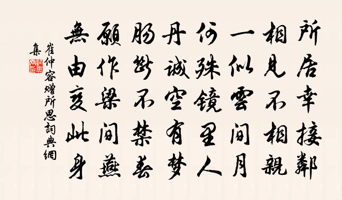 詩詞名句歷史字典書法欣賞書法字典國語詞典說文解字康熙字典古漢語字典標 題 作 者 詩 句 贈所思作者:崔仲容 朝代:唐代贈所思原文所居幸接鄰,相見不相親。一似雲間月,何殊鏡里人。丹誠空有夢,腸斷不禁春。願作梁間燕,無由變此身。詩詞問答問:贈所思的作者是誰?答:崔仲容問:贈所思寫於哪個朝代?答:唐代問:贈所思是什麼體裁?答:五律崔仲容贈所思書法欣賞贈所思書法作品注釋全唐詩:卷801-17詩詞推薦虔州八境圖八首(〔原無引,據它本補。〕)蘇軾〔宋代〕《南康八境圖》者,太守孔君之所作也,君既作石城,即其城上樓觀台榭之所見而作是圖也。東望七閩,南望五嶺迎春樂方千里〔宋代〕參差鳳鐸鳴高屋。漸驚覺、清眠熟。看夕陽倒影花陰速。雙燕子、歸來宿。幾曲危腸愁易束。問雪鬢、何時重綠。和何伯溫見寄二首洪咨夔〔宋代〕問字無人過草堂,昨非今日兩俱忘。鶴何骯髒寒方警,梅許淒涼靜更香。萬古江山窮太白,一簾風月老張蒼。多君三堂早春韋莊〔唐代〕獨倚危樓四望遙,杏花春陌馬聲驕。池邊冰刃暖初落,山上雪棱寒未銷。溪送綠波穿郡宅,日移紅影度村橋。主人鷓鴣天(戲贈黃醫)趙必〔宋代〕湖海相逢盡賞音。囊中粒劑值千金。單傳扁鵲盧醫術,不用楊高郭玉針。三斛火,一壺冰。藍橋搗熟隔雲深。無方上宣州沈大夫朱慶餘〔唐代〕科名繼世古來稀,高步何年下紫微。帝命幾曾移重鎮,時清猶望領春闈。登朝舊友常思見,開幕賢人並望歸。今日孟津詩曹丕〔魏晉〕良辰啟初節。高會構歡娛。通天拂景雲。俯臨四達衢。羽爵浮象樽。珍膳盈豆區。清歌發妙曲。樂正奏笙竽。曜靈禪人並化主寫真求贊釋正覺〔宋代〕雲無心而不羈,谷有應而相宜。寂住通感,圓明了知。性汪洋而海有受,氣突兀而山不移。百年身後所須物,問取頌古三十一首釋玿〔宋代〕隔,穿耳胡僧眼睛黑。東院西邊是趙州,觀音院裹安彌勒。吟社遞至詩卷足十四韻以答之為梅水村發也趙必象〔宋代〕無贄謁梅花,一詩我破戒。春風如打勘,具有案卷在。次韻樂先生吳中見寄八首范成大〔宋代〕墓林棲鳥各深枝,燕子知巢觸幔飛。倘有三椽今已去,不關五斗解忘歸。游安樂次句龍元應韻李流謙〔宋代〕得友何妨並轡行,眼明木末數峰橫。真游與世寥寥隔,滯念逢僧稍稍平。不復定身懷故宅,空餘遺像閟荒坑。莫教陳山龍君祠迎享送神曲龔頤正〔宋代〕吹洞簫兮望極浦,君之歸雲在下土。十風兮五雨,佑我海邦兮污萊斥鹵。君不來兮使吾心苦,千秋萬歲兮為民所怙瓊花行樓鎌〔宋代〕瓊花未信無雙無,特與翔鶴游江都。炷香展敬下古殿,相羊盤礴亭南隅。我欲歌之詞,我欲聲之詩。龍蛇滿四壁,縣齋十詠藏書閣寧參〔宋代〕洞闢前軒峻,危梯趣若何。綠苔生未遍,縹帙聚還多。曉幌吞清旭,秋欄拂靜柯。猶憐鉛筆在,公外獨頻過。句陳延〔宋代〕水泛榴花來洞口,鹿迎樵客到仙家。吹柳絮(鷓鴣詞)賀鑄〔宋代〕月痕依約到西廂。曾羨花枝拂短牆。初未識愁那得淚,每渾疑夢奈餘香。歌逢裊處眉先嫵,酒半酣時眼更狂。閒倚寄遠人杜牧〔唐代〕終日求人卜,回回道好音。那時離別後,入夢到如今。上藍和尚晉漢二代讖佚名〔唐代〕石榴花發石榴開。望花有感王令〔宋代〕春來幾時余不知,但怪日日柳梢好。我嗟無地自種花,常恐東風只生草。誰家有園不可入,時時縱慾信自到。寒梅名句推薦朝為越溪女,暮作吳宮妃。王維《西施詠》 宮女如花滿春殿,只今惟有鷓鴣飛。李白《越中覽古》 留春不住,費盡鶯兒語。王安國《清平樂·春晚》 桃花春水淥,水上鴛鴦浴。韋莊《菩薩蠻》 白髮三千丈,緣愁似個長。李白《秋浦歌十七首》 春日游,杏花吹滿頭。韋莊《思帝鄉·春日游》 從此信音稀,嶺南無雁飛。李師中《菩薩蠻·子規啼破城樓月》 寂寂柴門村落里,也教插柳記年華。趙鼎《寒食》 東風且伴薔薇住,到薔薇、春已堪憐。張炎《高陽台·西湖春感》 美人梳洗時,滿頭間珠翠。鄭遨《富貴曲》