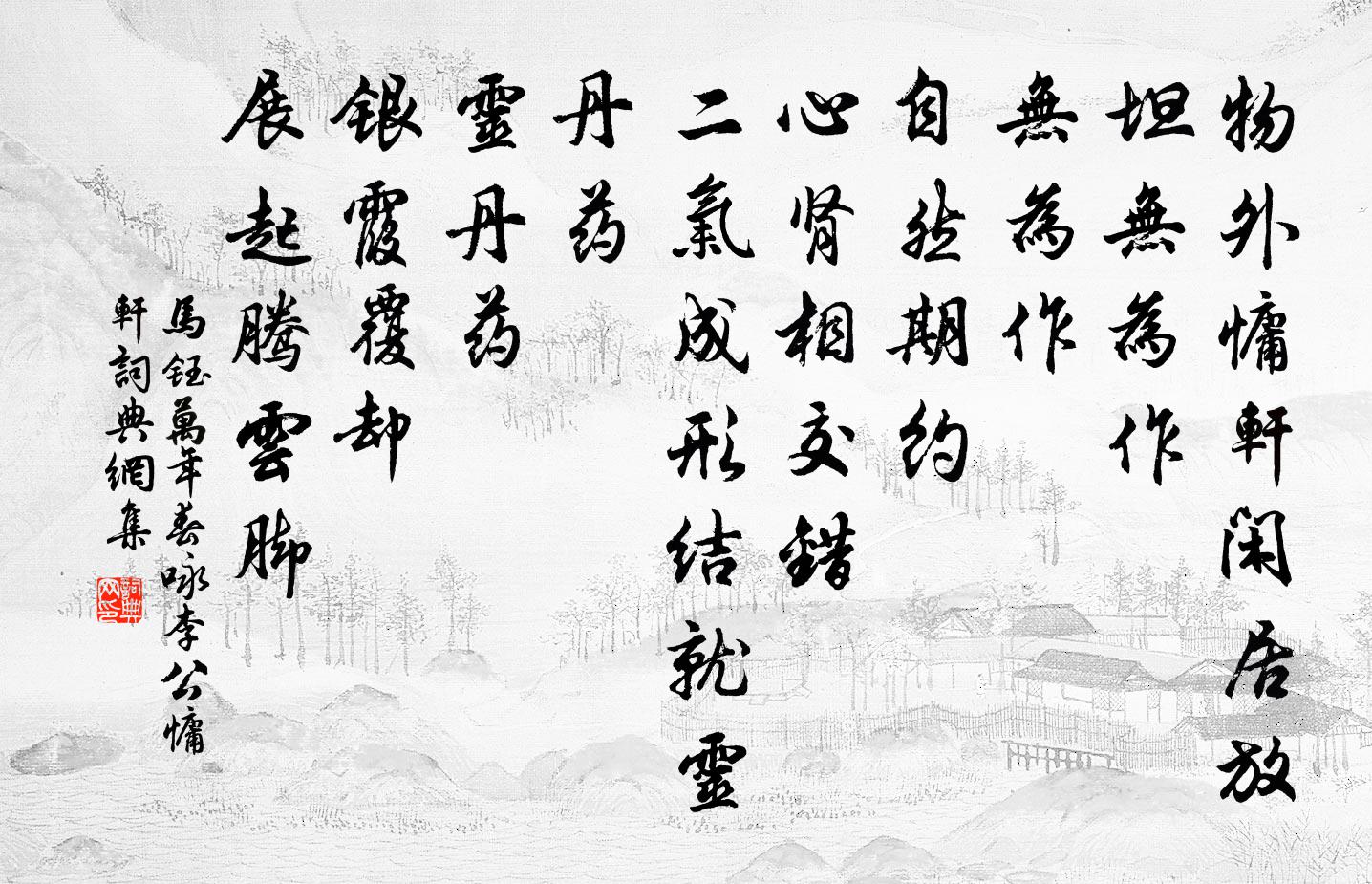 詩詞名句歷史字典書法欣賞書法字典國語詞典說文解字康熙字典古漢語字典標 題 作 者 詩 句 萬年春 詠李公慵軒作者:馬鈺 朝代:元代萬年春 詠李公慵軒原文物外慵軒,閒居放坦無為作。無為作。自然期約。心腎相交錯。二氣成形,結就靈丹藥。靈丹藥。銀霞覆卻。展起騰雲腳。詩詞問答問:萬年春 詠李公慵軒的作者是誰?答:馬鈺問:萬年春 詠李公慵軒寫於哪個朝代?答:元代問:萬年春 詠李公慵軒是什麼體裁?答:詞馬鈺萬年春 詠李公慵軒書法欣賞萬年春 詠李公慵軒書法作品詩詞推薦句齊唐〔宋代〕楩柟非給燎,鱮魴必施罛。蠟梅尤袤〔宋代〕破臘驚春意,凌寒試曉妝。應嫌脂粉白,故染麴塵黃。綴樹蜂懸室,排箏雁著行。團酥與凝蠟,難學是生香。答謝諮議謝靈運〔南北朝〕齊仲善交。在久彌敬。自我之遘。一遇而定。於穆謝生。以和繕性。有言屬耳。有文在詠。終南別業 / 初至山中 / 入山寄城中故人王維〔唐代〕中歲頗好道,晚家南山陲。興來每獨往,勝事空自知。行到水窮處,坐看雲起時。偶然值林叟,談笑無還期。牡丹方乾〔唐代〕不逢盛暑不沖寒,種子成叢用法難。醉眼若為拋去得,狂心更擬折來看。凌霜烈火吹無艷,裛 * 霞曬不乾。莫道呈丘運使三首趙蕃〔宋代〕奔逸聞千里,飛騰見九遷。禁途才咫尺,玉節屢迴旋。看即自天下,催歸夜席前。如憐落鳶外,為遣反驅邊。題老融猿釋紹曇〔宋代〕危坐禪枝冷,機含毒果深。直饒捫摸著,未必死偷心。五音曲 商引沈約〔南北朝〕司秋紀兌。奏西音。激揚鍾石。和瑟琴。風流福被。樂愔愔。法曲-美列聖,正華聲也白居易〔唐代〕法曲法曲歌大定,積德重熙有餘慶。永徽之人舞而詠,法曲法曲舞霓裳。政和世理音洋洋,開元之人樂且康。法曲晚立陳師道〔宋代〕遶舍苔衣積,倚牆梨頰紅。地平宜落日,野曠自多風。禹跡千年後,家山一顧中。未休嗤土偶,已復逐飄蓬。初冬夜坐憶桐城山行梅堯臣〔宋代〕我昔吏桐鄉,窮山使屢躡。路險獨後來,心危常自怯。下顧雲容容,前溪未可涉。半崖風颯然,驚鳥爭墮葉。修蔓曹嘉禾百詠使君祠張堯同〔宋代〕一笑淮兵卻,功成未易論。豈慚顏刺史,詩酒在平原。破屋嘆陸游〔宋代〕我年四十時,築舍受一廛;歲月不貸人,殆將五十年。初非楩柟材,既久理豈全。慘澹窘風雨,亦復補破穿。竹椽老人峰陳岩〔宋代〕佝僂形容古貌渾,旁連眾嶺似兒孫。荒山太古萬萬古,眼見遊人來幾番。無題舒岳祥〔宋代〕江山有恨非吾土,花鳥相逢故惱翁。百歲唯餘二十五,一春強半又成空。嘉定六年皇后閣春貼子詞五首真德秀〔宋代〕聖德天同大,熙然萬物春。誰知□載厚,發育輔深仁。歸鄉二首姜特立〔宋代〕憶昔東坡老,曾吟陌上花。我今歸故里,卉木正光華。初春遣興陸游〔宋代〕閒愁長與病相依,晨起梳頭感發稀。春事鼎來風更惡,晨光已滿雪猶飛。江梅有恨論年別,旅雁無情計日歸。剩欲訴衷情(和韻)吳潛〔宋代〕今宵分破鶻淪秋,孤客興何悠。要向雲中邀月,真箇是呆頭。風陣緊,電光流。雨聲颼。嫦娥應道,未卜明年,是偈釋顯嵩〔宋代〕昨日羅剎心,今朝菩薩面。羅剎與菩薩,不隔一條線。名句推薦洊雷,震;君子以恐懼修省。佚名《易傳·象傳下·震》 欲加之罪,其無辭乎?左丘明《左傳·僖公·僖公十年》 昨夢西湖,老扁舟身世。吳文英《拜星月慢·林鐘羽姜石帚以盆蓮數十置中庭宴客其中》 借人物,及時還。後有急,借不難。李毓秀《弟子規·謹》 揚人惡,即是惡。疾之甚,禍且作。李毓秀《弟子規·泛愛眾》 停車數行日,勸酒問回期。王建《送人游塞》 卻愁宴罷青娥散,揚子江頭月半斜。韋莊《陪金陵府相中堂夜宴》 歲暮百草零,疾風高岡裂。杜甫《自京赴奉先縣詠懷五百字 / 自京赴奉先詠懷五百字》 正其末者端其本,善其後者慎其先。房玄齡《晉書·列傳·第二十五章》 歸去來兮,吾歸何處?蘇軾《滿庭芳·歸去來兮》