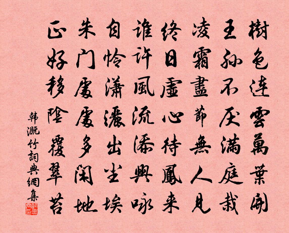 詩詞名句歷史字典書法欣賞書法字典國語詞典說文解字康熙字典古漢語字典標 題 作 者 詩 句 竹作者:韓溉 朝代:唐代竹原文樹色連雲萬葉開,王孫不厭滿庭栽。凌霜盡節無人見,終日虛心待鳳來。誰許風流添興詠,自憐瀟灑出塵埃。朱門處處多閒地,正好移陰覆翠苔。詩詞問答問:竹的作者是誰?答:韓溉問:竹寫於哪個朝代?答:唐代問:竹是什麼體裁?答:七律韓溉竹書法欣賞竹書法作品注釋全唐詩:卷768-32詩詞推薦摸魚兒徐一初〔宋代〕對茱萸、一年一度。龍山今在何處。參軍莫道無勳業,消得從容尊俎。君看取。便破帽飄零,也博名千古。當年幕魯望戲題書印囊奉和次韻皮日休〔唐代〕金篆方圓一寸余,可憐銀艾未思渠。不知夫子將心印,印破人間萬卷書。江城子劉秉忠〔元代〕松蒼竹翠歲寒天。雁山前。鳳城邊。回首燕南,一別又三年。長愛故人心似月,人不見,月還圓。小窗寂寂鎖凝煙戲聯回文體白玉蟾〔宋代〕水連天渺渺,山映月亭亭。尾櫂依鳧渚,頭船過蓼汀。鬼神號暝壑,煙霧靄疎欞。美醖浮觴玉,輕衣拂劍星。霜天曉角(子慶母八十)劉子寰〔宋代〕滿前兒女。今日都歡聚。今也阿彌八十,兒也五十五。瓷甌並瓦注。山歌和社舞。但管年年強健,妝成個、西王母張元帥謂予國已亡矣殺身以忠誰復書之予謂商文天祥〔宋代〕高人名若浼,烈士死如歸。智滅猶吞炭,商亡正採薇。豈因徼後福,其肯蹈危機。萬古春秋義,悠悠雙淚揮。孫季章無愧鄭季奕徐斯遠以仆留智門載酒見過趙蕃〔宋代〕出山已與曉寒沖,下馬頻欣束緼逢。已見南山行更鈍,到時山寺已昏鍾。山行董嗣杲〔宋代〕山路本無雨,霧滃 * 濕。腳滑幾欲縮,舉步真如縶。剉過萬千山,雲磴莫計級。更多仙泉甘,潭深絕綆汲。力疲四色詩范雲〔南北朝〕素鱗揚北渚。白水杜南宛。獻環潤玉塞。歸珠照瓊轅。游城南十六首賽神韓愈〔唐代〕白布長衫紫領巾,差科未動是閒人。麥苗含穟桑生葚,共向田頭樂社神。清心鏡丘處機〔元代〕鬼神擒,鞭撻跪。愁開眼,強欲思量巧計。當頭把業鏡高懸,那冤家怎諱。拔舌剜心酬快意。全不似舊日,馨香美題譚氏榮壽堂曾豐〔宋代〕少年大抵不分老,往往頭白常諱早。千齡一際慶壽恩,白之早者尤其好。廬陵太守以名聞,君家堂前翁若□。緼之秋思陸游〔宋代〕老懷不慣著閒愁,信腳時為野外游。過雁未驚殘月曉,片雲先借一天秋。村醅似粥家家醉,社肉如林處處留。七十挽吳尚書三首吳芾〔宋代〕晚歲登台省,頻年侍殿墀。從容如素宦,卓犖冠明時。人冀終圖任,天胡不憗遺。流芳知未艾,家有寧馨兒。春晚戲題姜特立〔宋代〕歲月飛騰不可回,紅顏去盡老相催。自憐皺面無光彩,賴得春負為熨開。次韻仲秉木犀馮伯規〔宋代〕金借顏色月借光,作團稼綠綴深黃。合令范曄添成傳,曾向維摩飯此香。尚憶□□披御賜,頗疑妙舞簇霓裳。當陪奉酬王宗丞用宿大木寺韻見贈喻良能〔宋代〕譽處千鈞重,文章一世雄。詩工穿月脅,檄好愈頭風。北嶽關山碧,南州荔子紅。使君今北海,還許一樽同。廟之神元稹〔唐代〕我馬煩兮釋我車,神之廟兮山之阿。予一拜而一祝,祝予心之無涯。涕汍瀾而零落,神寂默而無嘩。神兮神兮,奈又送族侄式顏高適〔唐代〕惜君才未遇,愛君才若此。世上五百年,君家一千里。俱游帝城下,忽在梁園裡。我今行山東,離憂不能已。題研六言四首劉克莊〔宋代〕其面固已晬然,其背貴不可言。寧捧以供李白,勿舉以擲鄭畋。名句推薦俱懷逸興壯思飛,欲上青天攬明月。李白《宣州謝朓樓餞別校書叔雲》 春日宴,綠酒一杯歌一遍。馮延巳《長命女·春日宴》 晚歲登門最不才,蕭蕭華發映金罍蘇洵《九日和韓魏公》 記得年時,相見畫屏中。謝逸《江神子·杏花村館酒旗風》 人間夢隔西風,算天上、年華一瞬。吳文英《惜秋華·七夕》 煙柳畫橋,風簾翠幕,參差十萬人家。柳永《望海潮·東南形勝》 萬里平湖秋色冷,星辰垂影參然。牛希濟《臨江仙·洞庭波浪颭晴天》 古來存老馬,不必取長途。杜甫《江漢》 石澗凍波聲,雞叫清寒晨。李賀《自昌谷到洛後門》 同是天涯淪落人,相逢何必曾相識!白居易《琵琶行 / 琵琶引》