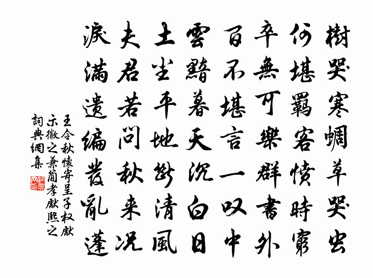 詩詞名句歷史字典書法欣賞書法字典國語詞典說文解字康熙字典古漢語字典標 題 作 者 詩 句 秋懷寄呈子權先示徽之兼簡孝先熙之作者:王令 朝代:宋代原文樹哭寒蜩草哭蟲,何堪羈客憤時窮。卒無可樂群書外,百不堪言一嘆中。雲黯暮天沉白日,土塵平地斷清風。夫君若問秋來況,淚滿遺編髮亂蓬。詩詞問答問:《秋懷寄呈子權先示徽之兼簡孝先熙之》的作者是誰?答:王令問:該詩寫於哪個朝代?答:宋代書法欣賞秋懷寄呈子權先示徽之兼簡孝先熙之書法作品詩詞推薦白鷳魏野〔宋代〕李白詩中聞未識,謝莊賦里見長思。今朝得爾心雖喜,致謝慚無吐鳳詩。喜遷鶯馮延巳〔唐代〕霧濛濛,風淅淅,楊柳帶疏煙。飄飄輕絮滿南園,牆下草芊眠。燕初飛,鶯已老,拂面春風長好。相逢攜手且高歌梅花七絕陳師道〔宋代〕月落霜嚴自靚妝,北風工為發清香。晚英數點辭林去,幽獨無人為斷腸。滿江紅 己酉九日,雨中家居,憶夏士安、頤邵亨貞〔元代〕弘昆季六人,皆常年同萸菊者,一載之間,俱罹患,各天一方,信筆紀懷風雨重陽,憑誰問、故人訊息。記當日、偶興羅隱〔唐代〕逐隊隨行二十春,曲江池畔避車塵。如今贏得將衰老,閒看人間得意人。試月中桂張喬〔唐代〕與月轉洪濛,扶疏萬古同。根非生下土,葉不墜秋風。每以圓時足,還隨缺處空。影高群木外,香滿一輪中。未種陝西戲成二絕鄭剛中〔宋代〕邊城土俗自隨宜,物色人情浩不齊。略有江鄉相似處,午煙林下一聲雞。和錢安道寄惠建茶蘇軾〔宋代〕我官於南今幾時,嘗盡溪茶與山茗。胸中似記故人面,口不能言心自省。為君細說我未暇,試評其略差可聽。建溪爇心香王哲〔元代〕這個王風。自小胎風。大來後、變做心風。遍行遊歷,正是狂風。每閒閒處,詩曲作,似長風。謁馬儒風。說與仁宿銅陵寺題壁張耒〔宋代〕僧房秋夜月明天,下馬擁裘人悄然。老僧何事亦晨起,清磬一聲驚客眠。次韻李士衡失解送公衍赴調二首項安世〔宋代〕世事從來亦偶然,何妨濁酒且中賢。諸天入定憑誰問,五色迷人自古傅。謝客堂中勞夢草,謫仙市上且開船。飛鳴七夕一絕句王炎〔宋代〕輕雲卷箔月鉤垂,正是青樓乞巧時。牛女相望隔河漢,浪傳天上有佳期。次韻夢得見示之什洪邁〔宋代〕居楚求齊音,美惡不同土。諠豗俗物華,鮮復有佳處。時從玉璧人,商略窮萬古。詩如粟牛戲,誤得摩頂許。望道醉蓬萊李曾伯〔宋代〕倚欄酒干一笑,酒舊日琵琶酒,何處尋酒覓。獨立東風,吹未醒狂客。沙外青歸,柳邊黃淺,依舊自春色。極目長題潤州金山寺張祜〔唐代〕一宿金山寺,超然離世群。僧歸夜船月,龍出曉堂雲。樹色中流見,鐘聲兩岸聞。翻思在朝市,終日醉醺醺。田舍即事十首劉克莊〔宋代〕閩土資生少,農家作苦多。尚能蓋牛屋,未肯入雞窠。社裡戴花舞,原頭拾穗歌。設令生漢代,堪冠力田科。【中呂】醉中天黃公望〔元代〕李嵩髑髏紈扇沒半點皮和肉.有一擔苦和愁。傀儡兒還將絲線抽,尋一個小樣子把冤家逗。識破個羞那不羞?呆兀送楊渭夫歸省陳傅良〔宋代〕應侯氣蓋百粵小,朱侯誼與灕江長。兩侯愛士早成癖,怪甚渭夫懷故鄉。士窮萬事一不就,就得一事窮何傷。渭夫臨江仙晏殊〔宋代〕資善堂中三十載,舊人多是凋零。與君相見最傷情。一尊如舊,聊且話平生。此別要知須強飲,雪殘風細長亭。待竹{左鼠右留}王禹偁〔宋代〕商嶺多修篁,蒼翠連山谷。有鼠生其中,薦食無厭足。春筍齧生犀,秋筠折寒玉。飫飽致肥腯,優遊恣蕃育。林密名句推薦地下千年骨,誰為輔佐臣。戎昱《詠史 / 和蕃》 閨中風暖,陌上草薰江淹《別賦》 物是人非事事休,欲語淚先流。李清照《武陵春·春晚》 採蓮時,小娘紅粉對寒浪。溫庭筠《荷葉杯·鏡水夜來秋月》 為君持酒勸斜陽,且向花間留晚照。宋祁《玉樓春·春景》 蓄疑敗謀,怠忽荒政佚名《尚書·周書·周官》 智者不危眾以舉事,仁者不違義以要功。范曄《後漢書·列傳·竇融列傳》 鼓吹助清賞,鴻雁起汀洲。蘇轍《水調歌頭·徐州中秋》 做弄得、酒醒天寒,空對一庭香雪。張炎《疏影·梅影》 雁聲遠過瀟湘去,十二樓中月自明。溫庭筠《瑤瑟怨》