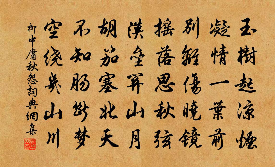 詩詞名句歷史字典書法欣賞書法字典國語詞典說文解字康熙字典古漢語字典標 題 作 者 詩 句 秋怨作者:柳中庸 朝代:唐代秋怨原文玉樹起涼煙,凝情一葉前。別離傷曉鏡,搖落思秋弦。漢壘關山月,胡笳塞北天。不知腸斷夢,空繞幾山川。詩詞問答問:秋怨的作者是誰?答:柳中庸問:秋怨寫於哪個朝代?答:唐代問:秋怨是什麼體裁?答:五律柳中庸秋怨書法欣賞秋怨書法作品注釋全唐詩:卷257_8詩詞推薦上廉訪分司官黃庚〔宋代〕行部巡荒察吏奸,皇皇使節古刑官。聲搖天上星辰動,清逼雲間風露寒。肅政嚴持三尺法,恤民特放一分寬。香名瘦張嵲〔宋代〕駑馬固多肉,玄鶴原骨輕。以彼棧豆意,方此雲霄情。汩汩世紛遠,蕭蕭中慮盈。將尋包道士,一問升天行。慧山寺肄業送懷坦上人李騭〔唐代〕流水何山分,浮雲空中遇。我生無根株,聚散亦難固。憶昨鬥龍春,岩棲侶高步。清懷去羈束,幽境無滓污。日落寄宋使君貫休〔唐代〕寺倚烏龍腹,窗中見碧棱。空廊人畫祖,古殿鶴窺燈。風吼深松雪,爐寒一鼎冰。唯應謝內史,知此道心澄。野次喜雪李隆基〔唐代〕拂曙辟行宮,寒皋野望通。每雲低遠岫,飛雪舞長空。賦象恆依物,縈迴屢逐風。為知勤恤意,先此示年豐。菩薩蠻(坐中賦櫻桃)辛棄疾〔宋代〕香浮乳酪玻璃碗。年年醉里嘗新慣。何物比春風。歌唇一點紅。江湖清夢斷。翠籠明光殿。萬顆寫輕勻。低頭愧野春雨漫興袁易〔元代〕日日春陰只欲眠,強尋南陌復東阡。猶殘碧樹花多少,莫惜金尊酒十千。象管烏絲題往事,玉簫錦瑟負華年。愁來戲作盆池四於和青堂曾幾〔宋代〕陂湖春盡水茫茫,收拾波濤入小塘。睡起微涼馥荷氣,雨餘斜日麗萍光。聊為堂下龜魚主,少退階前雁鶩行。只欠八月十王日夜宿南園懷群貺司馬光〔宋代〕昔公在少師,未嘗棄嘉節。今宵秋半分,空羨西園月。天色湛澄清,風聲冷騷屑。笑言不可親,引領望金闕。賴有訪顏氏讀書岩呂願中〔宋代〕洞口微雲恣卷舒,石岩相對一蘧廬。賦才晉宋多夷曠,好景古今難貯儲。茗碗已驚浮雪浪,齋廚俄聽響鯨魚。子云句薛紹彭〔宋代〕去意已輕千里陌,深杯難醉九迴腸。灞陵葉落秋風裡,忍對霜天數雁行。滿江紅佚名〔宋代〕一葉知秋,正玉律、新砍夷則。遲三日、雙星齊會,又逢七夕。先送天孫來乞巧,姓氏已在長生籍。喜華堂、今日賞心亭曹組〔宋代〕白鷺洲邊蘆葉黃,石頭城下水茫茫。江山不管事興廢,今古坐令人感傷。六代豪華空處所,千秋城闕委荒涼。空餘訪寒梅(江梅引·四之二)洪皓〔宋代〕春還訊息訪寒梅。賞初開。夢吟來。映雪銜霜、清絕繞風台。可怕長洲桃李妒,度香遠,驚愁眼,欲媚誰。曾動詩秋懹陸游〔宋代〕昨者風雨過,浩然天地秋。年光雙雪鬢,生計一漁舟。賣藥來查浦,聽猿到沃洲。平生畏暑毒,八月記初游。題趙子昂疊岫圖戴表元〔宋代〕白石青林底處無,侵雲亦有小屠蘇。桔花飛盡不歸去,揮汗江城看畫圖。韓季默主簿聽雨齋葛紹體〔宋代〕一片雲陰帶日長,落花飛處燕泥香。耕畦桑塢年年事,萬點春聲夜對床。錢塘遇沈時仲匆匆索別李洪〔宋代〕三年啄腐共吞腥,乍解南冠覲舜廷。新貴論交頭漫白,吾曹相遇眼終青。休嗔輕薄紛紛雨,還恨分攜落落星。歲晚送陳糧料葉適〔宋代〕萬里渥窪出,行天絕比倫。能參天關鍵,莫用小精神。鐘鼎身雖貴,簡瓢道未貧。梅情兼雪意,留住恰芳春。贈彭花翁牡丹障姚勉〔宋代〕洛之花圖歐公詩,驚怪天巧呈新枝。自言當時記者數十種,姚魏後有潛溪緋。蜀之花圖景仁句,香雪蕊金藏不露。名句推薦昔時賢文,誨汝諄諄。佚名《增廣賢文·上集》 小娃撐小艇,偷采白蓮回。白居易《池上》 莫莫高山,深谷逶迤佚名《紫芝歌》 笑十三楊柳女兒腰,東風舞。岳珂《滿江紅·小院深深》 窮則變,變則通,通則久。佚名《易傳·繫辭傳下·第二章》 漫江碧透,百舸爭流。 * 《沁園春·長沙》 寄言儔侶,莫負廣寒沈醉。文徵明《念奴嬌·中秋對月》 冬無愆陽,夏無伏陰,春無淒風,秋無苦雨左丘明《左傳·昭公·昭公四年》 相思記取,愁絕西窗夜雨。韓元吉《薄倖·送安伯弟》 送君如昨日,檐前露已團。江淹《古離別》