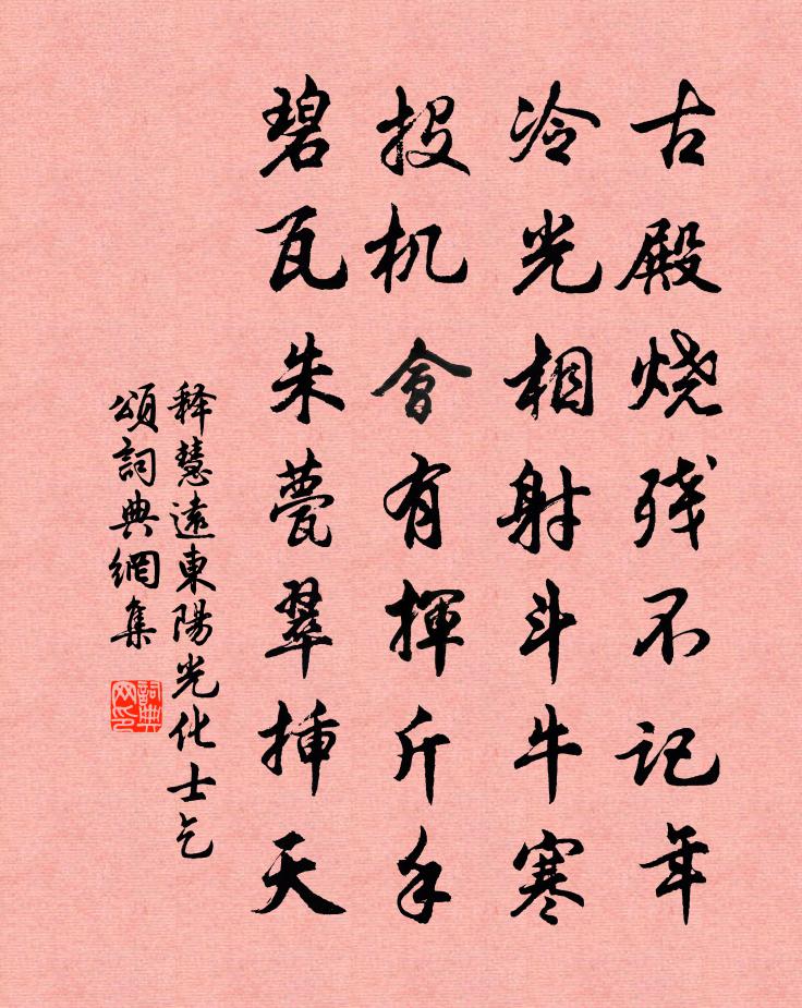 詩詞名句歷史字典書法欣賞書法字典國語詞典說文解字康熙字典古漢語字典標 題 作 者 詩 句 東陽光化士乞頌作者:釋慧遠 朝代:宋代東陽光化士乞頌原文古殿燒殘不記年,冷光相射鬥牛寒。投機會有揮斤手,碧瓦朱甍翠插天。詩詞問答問:東陽光化士乞頌的作者是誰?答:釋慧遠問:東陽光化士乞頌寫於哪個朝代?答:宋代釋慧遠東陽光化士乞頌書法欣賞東陽光化士乞頌書法作品詩詞推薦卜居白居易〔唐代〕遊宦京都二十春,貧中無處可安貧。長羨蝸牛猶有舍,不如碩鼠解藏身。且求容立錐頭地,免似漂流木偶人。但道和游房公舊竹亭聞琴絕句劉禹錫〔唐代〕尚有竹間路,永無綦下塵。一聞流水曲,重憶餐霞人。雪後寄謝濟公、材翁聯騎來訪,進退格楊萬里〔宋代〕封胡連璧雨中來,目送皈鞍悵獨回。隱几讀書寒入骨,開門落雪皓平階。急尋火閣溫雙手,自喚兒郎共一杯。念汝香爐峰下新卜山居草堂初成偶題東壁五首白居易〔唐代〕五架三間新草堂,石階桂柱竹編牆。南檐納日冬天暖,北戶迎風夏月涼。灑砌飛泉才有點,拂窗斜竹不成行。來春五洩龍井釋文珦〔宋代〕五吉蜿蜒宅,幽深父老言。傍溪唯見瀑,度嶺始知源。夾欲斜暉隱,空林夕電翻。屢聞當旱歲,噀雨出松門。酬僧吳融〔唐代〕玉堂全不限常朝,臥待重城宿霧銷。翻憶故山深雪裡,滿爐枯柏帶煙燒。夏景呂徽之〔宋代〕竹几藤床石硯屏,薰風簾幕篆煙清。空齋數點黃梅雨,添得芭蕉綠滿庭。春晚舒邦佐〔宋代〕桑柘枝頭一一空,林巒放出畫屏風。鷺鷥驚晚歸飛急,零亂昏煙一抹中。別近呈明叔趙蕃〔宋代〕靖節甘忤俗,子云空解嘲。紛紛多面友,了了獨心交。四海嘆浮梗,三年嗟系匏。語離無幾日,梅蕊況江郊。題悟公禪堂陸暢〔唐代〕臨壇付法十三春,家本長城若下人。芸閣少年應不識,南山鈔主是前身。和徐思叔謝向大夫惠柑四首彭龜年〔宋代〕作詩渾似譚經載,奪盡從頭席幾重。文木一經題品後,虛名不數大夫封。題潮陽石塔寺黃公度〔宋代〕投檄真成出瘴鄉,籃輿漸喜到僧坊。長風解事吹江雨,乞與行人五月涼。第一百六十五文天祥〔宋代〕風煙渺吳蜀,雲帆轉遼海。喪亂紛嗷嗷,尚愧微軀在。送清會上人游京皎然〔唐代〕佳游限衰疾,一笑向西風。思見青門外,曾臨素滻東。峰明雲際寺,日出露寒宮。行道禪長在,香塵不染空。句佚名〔宋代〕從鳥不喜亦不悲,又復別尋高樹枝。題敬愛寺樓杜牧〔唐代〕暮景千山雪,春寒百尺樓。獨登還獨下,誰會我悠悠?題梅山張景端〔宋代〕作尉南昌日,投書北闕頻。忠言不悟主,直節恥為臣。漢室多災異,吳門念隱淪。掛冠忘寵辱,蒙袂出埃塵。虹屈閒坐看書貽諸少年白居易〔唐代〕雨砌長寒蕪,風庭落秋果。窗間有閒叟,盡日看書坐。書中見往事,歷歷知福禍。多取終厚亡,疾驅必先墜。勸君探春令(景龍燈)韓淲〔宋代〕暗塵明月小桃枝,舊家時情味。問而今、風轉蛾兒底。有誰把、春衫試。景龍燈火昇平世。動長安歌吹。這山城、八聲甘州(壬子餞帥機沈好問)李曾伯〔宋代〕正蓴鱸佳夢繞吳鄉,牙檣忍輕離。向仲宣樓上,憑高舉酒,幾共燈棋。曾記少陵留詠,出幕合持麾。飛蓋長安去,名句推薦末俗以繁華相尚,終覺冷淡處趣味彌長。王永彬《圍爐夜話·第 * 則》 浮雲不系名居易,造化無為字樂天李忱《吊白居易》 手弄生綃白團扇,扇手一時似玉。蘇軾《賀新郎·夏景》 來歲花前。又是今年憶去年。呂本中《減字木蘭花·去年今夜》 拆桐花爛熳,乍疏雨、洗清明。柳永《木蘭花慢·拆桐花爛熳》 隨風潛入夜,潤物細無聲。杜甫《春夜喜雨》 狗馬飾雕文,土木被緹繡。范曄《後漢書·列傳·宦者列傳》 人不博覽者,不聞古今,不見事類,不知然否,猶目盲、耳聾、鼻癰者也。王充《論衡·卷十三·別通篇》 不管煙波與風雨,載將離恨過江南。鄭文寶《柳枝詞》 薄衾小枕涼天氣,乍覺別離滋味。柳永《憶帝京·薄衾小枕涼天氣》