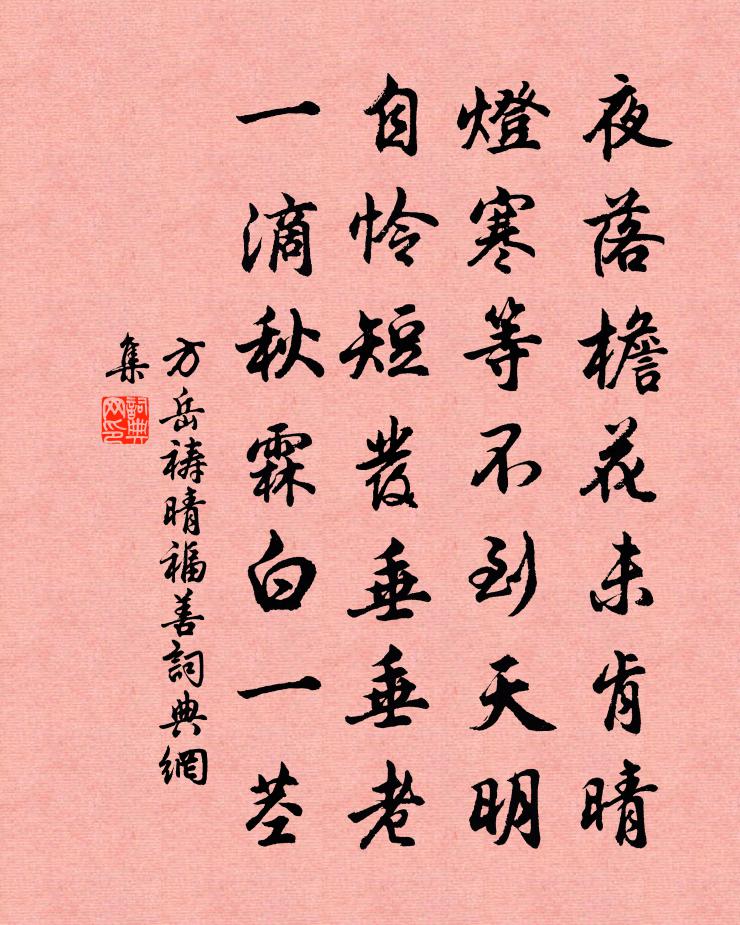 詩詞名句歷史字典書法欣賞書法字典國語詞典說文解字康熙字典古漢語字典標 題 作 者 詩 句 禱晴福善作者:方岳 朝代:宋代禱晴福善原文夜落檐花未肯晴,燈寒等不到天明。自憐短髮垂垂老,一滴秋霖白一莖。詩詞問答問:禱晴福善的作者是誰?答:方岳問:禱晴福善寫於哪個朝代?答:宋代方岳禱晴福善書法欣賞禱晴福善書法作品詩詞推薦丙午新正書懷十首范成大〔宋代〕俗情如絮已泥沾,因病偷閒意屬厭。鵬鷃相安無可笑,熊魚自古不容兼。灰藏榾柮多時暖,雪壓蔓菁滿意甜。溫飽次李提舉桂花韻楊冠卿〔宋代〕綠帷深護黃金粟,嫵媚似嫌紅粉妝。年來不作廣寒夢,喜對孤標時踞床。大雨行 開成三年,宣州開元寺作。杜牧〔唐代〕東垠黑風駕海水,海底卷上天中央。三吳六月忽悽慘,晚後點滴來蒼茫。錚棧雷車軸轍壯,矯躍蛟龍爪尾長。神鞭賢者之孝二百四十首袁君正林同〔宋代〕家人勸我睡,共說不眠難。官既未得差,眠時自不安。國學試風化下薛能〔唐代〕霽闕露穹崇,含生仰聖聰。英明高比日,聲教下如風。靜發宸居內,低來品物中。南薰歌自溥,北極響皆通。蘋末寄老山張鵬飛御史方回〔宋代〕通袖風霜手,揮毫雅頌音。柄臣曾見憚,素士許同吟。包括滄溟淺,蜚騰歲月深。一朝夢惟肖,槁草仰商霖。南鄉一剪梅·招熊少府虞集〔元代〕南阜小亭台,薄有山花取次開。寄語多情熊少府;晴也須來,雨也須來。隨意且銜杯,莫惜春衣坐綠苔。若待明朝李周彈箏歌(淮南韋太尉席上贈)吳融〔唐代〕古人云,絲不如竹,竹不如肉。乃知此語未必然,李周彈箏聽不足。聞君七歲八歲時,五音六律皆生知。就中十三重九與堅大師登墳庵新閣因憶癸已歲此日同在陶夢桂〔宋代〕茱萸笑把登高閣,菊蕊才堪薦一觴。卻憶當年關表路,無花無酒更淒涼。賀陳仲思鄧深〔宋代〕中鵠知誰好,烹魚始認名。報公勤有子,似我懶無甥。何日親相見,因風且寄聲。泥金聞喜處,樽酒俗同傾。吳門柳(遊仙詠·二之二)賀鑄〔宋代〕嘯度萬松千步嶺。錢湖門外非塵境。見底碧漪如眼淨。嵐光映。鏡屏百曲新磨瑩。好月為人重破瞑。雲頭艷艷開金下沱張西叔牡丹號奇品以詩寄花因用韻謝陽枋〔宋代〕天香吹落五雲來,滿眼浮花只浪開。國色不關朝得酒,妝檯漫飲紫金杯。留山間即事王炎〔宋代〕暫留野次倦征行,差覺山林氣味清。日釀梅酸新雨過,山連空翠淡煙橫。東皋水滿起農事,南國草青回雁程。撥置滿江紅(京口鳳凰池和蘆川“春水連天”韻。池,蘇魏公舊遊也。)吳潛〔宋代〕借問如何,春能好、客懷偏惡。消遣底、閒言閒語,近都慵作。歲月從今休點檢,江湖自古多流落。倚危亭、目斷次韻樂先生吳中見寄八首其范成大〔宋代〕幾多螻蟻與王侯,往古來今共一丘。遮莫功名掀宇宙,百年兩角寄蝸牛。題子陵釣台圖三絕釋寶曇〔宋代〕帝已龍飛我故魚,乾坤等是一蘧廬。夕陽曬卻蓑衣了,試問妻孥有酒無。寄焦山成老高郵滋老晁說之〔宋代〕他鄉臥病白頭翁,孤憤猶存涕淚中。竹葉有陰唯待月,蓮花自殞不須風。明朝白帝行商令,何日黃麾入漢宮。一死釣台王貞白〔唐代〕異代有巢許,方知嚴子情。舊交雖建國,高臥不求榮。溪鳥寒來浴,汀蘭暖重生。何顏吟過此,辛苦得浮名。答曼叔見寄韓維〔宋代〕日君同里閭,杖履數相過。靡為不吾咨,有唱必君和。春風南陌游,炎月北窗臥。貪從德義樂,不覺歲月破。而君憑欄人張可久〔元代〕江水澄澄江月明,江上何人掐[1]玉箏?隔江和淚聽,滿江長嘆聲。名句推薦遠路應悲春晼晚,殘霄猶得夢依稀。李商隱《春雨》 日中則昃,月盈則食佚名《易傳·彖傳下·豐》 青楓江上秋帆遠,白帝城邊古木疏。高適《送李少府貶峽中王少府貶長沙》 見碧水丹山,黃蘆苦竹。宋江《滿江紅·喜遇重陽》 虛空落泉千仞直,雷奔入江不暫息。徐凝《廬山瀑布》 蛛絲暗鎖紅樓,燕子穿簾處。吳文英《荔枝香近·七夕》 春去也,飛紅萬點愁如海。秦觀《千秋歲·水邊沙外》 離愁不管人飄泊。年年孤負黃花約。黃機《憶秦娥·秋蕭索》 存亡在虛實,不在於眾寡。韓非及後人《韓非子·安危》 慘慘時節盡,蘭葉復凋零。徐幹《室思》