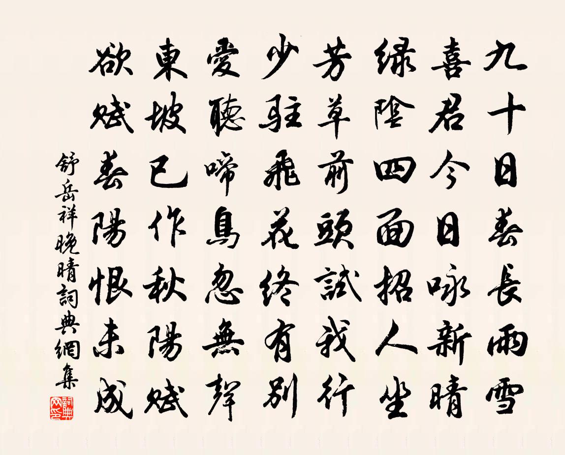 詩詞名句歷史字典書法欣賞書法字典國語詞典說文解字康熙字典古漢語字典標 題 作 者 詩 句 晚晴作者:舒岳祥 朝代:宋代晚晴原文九十日春長雨雪,喜君今日詠新晴。綠陰四面招人坐,芳草前頭試我行。少駐飛花終有別,愛聽啼鳥忽無聲。東坡已作秋陽賦,欲賦春陽恨未成。詩詞問答問:晚晴的作者是誰?答:舒岳祥問:晚晴寫於哪個朝代?答:宋代舒岳祥晚晴書法欣賞晚晴書法作品詩詞推薦大人生朝代諸兒五首以春風花草香為韻項安世〔宋代〕何物堪為壽,南華有大椿。根株天地遠,枝葉歲時新。十倍大彭國,百分清渭濱。周星八千度,才是一番春。六州歌頭(寄孫竹湖)劉過〔宋代〕問訊竹湖,竹如之何,如何未歸。道吳山越水,無非佳處,來無定止,去亦何之。莫是秋來,未能忘耳,心與孤雲句許庚〔宋代〕頓超捷進脫,故習肩前修。十月二十日馬廷鸞〔宋代〕太乙宮前戎馬鄉,思成門外野蒿場。山中一瓣心香在,獨遣孤臣病著床。水調歌頭張惠言〔清代〕疏簾卷春曉,胡蝶忽飛來。遊絲飛絮無緒,亂點碧雲釵。腸斷江南春思,黏著天涯殘夢,剩有首重回。銀蒜且深押句黃輔〔宋代〕許國一心如鐵勁,闔門百口等毛輕。移禁司刑沈佺期〔唐代〕疇昔參鄉賦,中年忝吏途。丹唇曾學史,白首不成儒。天子開昌籙,群生偶大爐。散材仍葺廈,弱羽遽摶扶。寵邁涌金門外施樞〔宋代〕柳絲舞困起炊煙,羅綺相催欲上船。貴冶亦知春有夜,暖沙還付白鷗眠。呻吟齋睡起五首呈世弼黃庭堅〔宋代〕牆下蓬蒿地,兒童課翦除。蔓萵隨分種,杞菊未須鉏。河水傳烽火,交州報捷書。無能落閒處,慙媿飽春蔬。郴江百詠並序靈湫阮閱〔宋代〕老蛟力斗死池中,山下流泉暗谷通。風雨年年常十五,休將涓滴強邀功。郊廟歌辭。漢宗廟樂舞辭。章慶舞佚名〔唐代〕罘罳曉唱雞人,三牲八簋斯陳。霧集瑤階瑣闥,香生綺席華茵。珠佩貂璫熠爚,羽旄乾戚紛綸。酌鬯既終三獻,凝送楊山人歸嵩山李白〔唐代〕我有萬古宅,嵩陽玉女峰。長留一片月,掛在東溪松。爾去掇仙草,菖蒲花紫茸。歲晚或相訪,青天騎白龍。偈二十二首釋洵〔宋代〕有佛處,不得住,藕絲孔里行官路。無佛處,急走過,十字街頭相對坐。江城子 水仙邵亨貞〔元代〕凌風翠*興飄然。步躚躚。*忘言。淨洗明妝,不與世爭妍。玉質金相清韻絕,端可擬、月中仙。天寒日暮水雲邊虞美人·宜州見梅作黃庭堅〔宋代〕天涯也有江南信。梅破知春近。夜闌風細得香遲。不道曉來開遍、向南枝。 玉台弄粉花應妒。飄到眉心住。平生北齋陸游〔宋代〕質衣葺北齋,欹壤略撐拄。窗扉則虛名,聊足度寒暑。獨學無與論,推核實勞苦。審觀古人意,十亦得四五。無功題束季博山園二十首梅岩牟巘五〔宋代〕幽人讀書處,皎皎霜月爛。香影不可掇,高花在岩畔。送十五弟侍御使蜀杜甫〔唐代〕喜弟文章進,添余別興牽。數杯巫峽酒,百丈內江船。未息豺狼斗,空催犬馬年。歸朝多便道,搏擊望秋天。坐睡洪邁〔宋代〕坐久睡屢兀,手失未了書。清風脫然至,心醒得我娛。起看孤隙光,了不移錙銖。云何短夢中,萬境生須臾。嗟彼濰縣署中畫竹呈年伯包大丞括 / 墨竹圖題詩鄭燮〔清代〕衙齋臥聽蕭蕭竹,疑是民間疾苦聲。些小吾曹州縣史,一枝一葉總關情。名句推薦更無花態度,全有雪精神。辛棄疾《臨江仙·探梅》 遠送從此別,青山空復情。杜甫《奉濟驛重送嚴公四韻》 十二闌乾,故國三千里。王庭筠《鳳棲梧·衰柳疏疏苔滿地》 善歌者,使人繼其聲;善教者,使人繼其志。戴聖《禮記·學記》 紅粉當壚弱柳垂,金花臘酒解酴醿。賈至《春思二首》 穿天透地不辭勞,到底方知出處高。馮雲山《詠瀑布》 玉碗冰寒滴露華,粉融香雪透輕紗。晏殊《浣溪沙·玉碗冰寒滴露華》 羌管悠悠霜滿地,人不寐,將軍白髮征夫淚。范仲淹《漁家傲·秋思》 驚起卻回頭,有恨無人省。蘇軾《卜運算元·黃州定慧院寓居作》 人攀明月不可得,月行卻與人相隨。李白《把酒問月·故人賈淳令予問之》