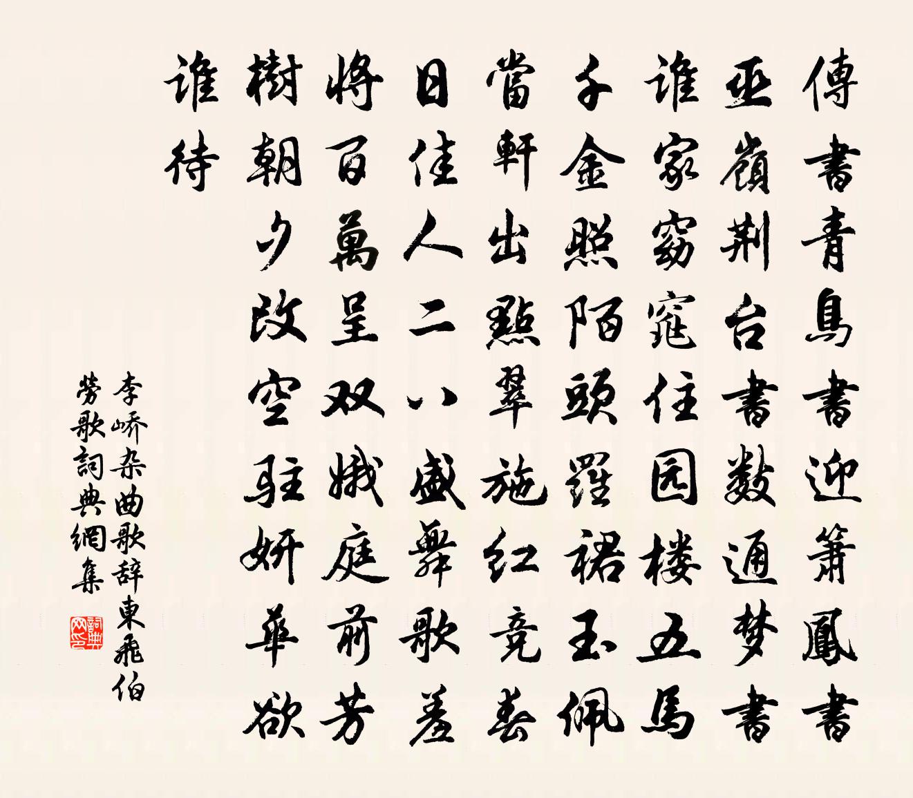 詩詞名句歷史字典書法欣賞書法字典國語詞典說文解字康熙字典古漢語字典標 題 作 者 詩 句 雜曲歌辭東飛伯勞歌作者:李嶠 朝代:唐代雜曲歌辭東飛伯勞歌原文傳書青鳥書迎簫鳳,書巫嶺荊台書數通夢。書誰家窈窕住園樓,五馬千金照陌頭。羅裙玉佩當軒出,點翠施紅競春日。佳人二八盛舞歌,羞將百萬呈雙娥。庭前芳樹朝夕改,空駐妍華欲誰待。詩詞問答問:雜曲歌辭東飛伯勞歌的作者是誰?答:李嶠問:雜曲歌辭東飛伯勞歌寫於哪個朝代?答:唐代問:雜曲歌辭東飛伯勞歌是什麼體裁?答:樂府李嶠雜曲歌辭東飛伯勞歌書法欣賞雜曲歌辭東飛伯勞歌書法作品注釋全唐詩:卷25_24全唐詩:卷57_11詩詞推薦自建康路中見梅次前韻吳芾〔宋代〕行盡山岡喜見梅,停驂深欲少徘徊。那知急雨連天暗,更有狂風捲地來。無計略臨花下坐,卻嗟空向眼前開。行人釋奠詩應令江總〔隋代〕年灰迭起。星管環周。春凋樹色。日藻川流。雪花遲舞。雲葉雙抽。霧開金堨。冰銷石溝。減字木蘭花(水仙花)韋驤〔宋代〕雕闌香砌。紅紫妖韶何足計。爭似幽芳。幾朵先春蘸碧塘。玉盤金盞。誰謂花神情有限。綽約仙姿。仿佛江皋解佩頌十玄談祖意釋印肅〔宋代〕回途石馬出紗籠,嘶起寰中雨後風。吹散暮運孤月朗,危巒煙寺一聲鍾。減字木蘭花韋驤〔宋代〕帝城春媚。綠柳參天花照地。共樂昇平。處處樓台歌板聲。香輪玉鐙。馳驟芳郊爭選勝。妙舞輕謳。擾亂春風卒未勘書孫僅〔宋代〕儒家無外事,招客勘青編。筆墨東西置,朱黃次第研。頻憂傷點竄,細恐誤流傳。改易文辭正,增加字數全。目因寄唐稟正字齊己〔唐代〕疏野還如舊,何曾稱在城。水邊無伴立,天際有山橫。落日雲霞赤,高窗筆硯明。鮑昭多所得,時憶寄湯生。寄題洪州慈濟師西軒梅堯臣〔宋代〕西軒無落暉,所賴西庭竹。竹間有古葉,竹上有繁綠。夜雨一洗梢,朝陽似曦沐。焚香愛此心,自不同諸俗。句林喬〔宋代〕斗州無頓閒身處,時向梅花走一遭。招戴道士彈琴黃庭堅〔宋代〕春愁如發不勝梳,酒病綿綿困未蘇。欲聽淳音消妄想,抱琴端為一來無。湖山即景次尹綠波王鎡〔宋代〕湖山掩映雁潭秋,今古詩人說勝游。綠柳影分騎馬路,赤楓葉落釣魚舟。前坡風送歸樵笛,別墅雲藏賣酒樓。長記謝朱推梅栽胡寅〔宋代〕南國雖雲有學堂,了無松菊徑徒荒。瘴痕元愛冰花洗,衰鬢聊依玉樹芳。便覺小池招秀影,更令寒月映新妝。從今挽董瀾溪二首王珪〔唐代〕嗜學嘗忘味,說詩堪解頤。竹林雖晚會,濠上獨深知。蘭畹無留馥,鳳巢空舊枝。停雲正愁望,橫笛未休吹。勸農出郊三絕王炎〔宋代〕邊頭萬馬似雲屯,準備秋風壓戰塵。何日將軍收虎帳,道旁築屋免勤民。好事近(次韻葉夢錫陳天予南園作。)毛並〔宋代〕飛蓋滿南園,想見八仙遙集。幾樹海棠開遍,正新晴天色。休辭一醉任扶還,衣上酒痕濕。便恐歲華催去,聽秋蟲鷓鴣天劉一止〔宋代〕岩下清陰引興長。坐中初識令君香。攬將風月歸詩藪,乞得溪山作醉鄉。憐我老,與傳觴。吳霜點鬢又何妨。只應閒卿遽然雲別因書二十八言奉送強至〔宋代〕禪翁為我出岩扉,坐席才溫便拂衣。又道孤雲無定所,如何卻傍舊山歸。樂府雜曲鼓吹曲辭臨高台王勃〔唐代〕臨高台,高台迢遞絕浮埃,瑤軒綺構何崔嵬,鸞歌鳳吹清且哀。俯瞰長安道,萋萋御溝草,斜對甘泉路,蒼蒼茂陵望行人曹勛〔宋代〕西北有高樓,窈窱入空碧。徙倚遍欄乾,楊花滿行跡。不見行人歸,但有楊花白。披襟向春風,為我傳訊息。春風留興國宮懷城中友人董嗣杲〔宋代〕拜章壇下桂花清,客子看山眼更醒。萬竹梳風涼透碧,亂峰收雨曉爭青。城中佳客還相憶,月下幽泉政好聽。誰肯名句推薦一曲高歌一樽酒,一人獨釣一江秋。王士禎《題秋江獨釣圖》 誰家玉笛暗飛聲,散入春風滿洛城。李白《春夜洛城聞笛 / 春夜洛陽城聞笛》 曉雞驚樹雪,寒鶩守冰池。李商隱《幽居冬暮》 霜雪兮漼溰,冰凍兮洛澤。王逸《九思》 天明登前途,獨與老翁別。杜甫《石壕吏》 漢臣曾此作縲囚,茹血衣毛十九秋。汪遵《詠北海》 類同相召,氣同則合,聲比則應。呂不韋《呂氏春秋·覽·恃君覽》 審知四度,可以定天下,可安一國。佚名《黃帝四經·經法·四度》 莫驚鷗鷺,四橋儘是,老子經行處。蘇軾《青玉案·送伯固歸吳中》 越鳥巢乾後,歸飛體更輕。李商隱《晚晴》