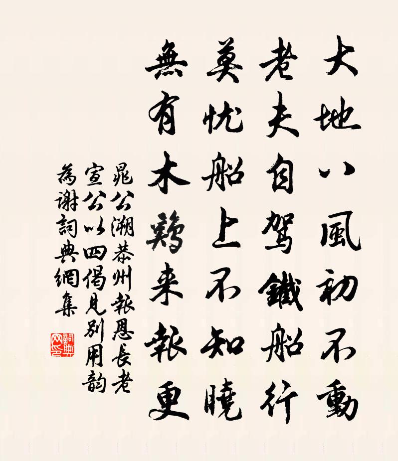 詩詞名句歷史字典書法欣賞書法字典國語詞典說文解字康熙字典古漢語字典標 題 作 者 詩 句 恭州報恩長老宣公以四偈見別用韻為謝作者:晁公溯 朝代:宋代原文大地八風初不動,老夫自駕鐵船行。莫憂船上不知曉,無有木雞來報更。詩詞問答問:《恭州報恩長老宣公以四偈見別用韻為謝》的作者是誰?答:晁公溯問:該詩寫於哪個朝代?答:宋代書法欣賞恭州報恩長老宣公以四偈見別用韻為謝書法作品詩詞推薦山居王建〔唐代〕屋在瀑泉西,茅檐下有溪。閉門留野鹿,分食養山雞。桂熟長收子,蘭生不作畦。初開洞中路,深處轉松梯。秋興三首張耒〔宋代〕八月禾黍熟,登高望川原。山河豁清霽,風日開明鮮。晴光散草木,余爽厲淵泉。飄飄孤飛鶻,擊搏無留拳。幽獨句諶祜〔宋代〕潮回海北風偏壯,秋滿江南客未歸。遣興鄧允端〔宋代〕得志心偏壯,謀生事轉疏。雨蓑春種藥,月案夜抄書。窮達雖同道,功名不定居。憑誰報訊息,為問近何如。黃鶴洞中仙 繼重陽韻馬鈺〔元代〕火院須當遠。塵事難為染。因遇風仙棄冤親,做個投真馬,得得超彼岸。即達逍遙岸。鍊氣如素練。專下工夫分假題賈伯用大龍阡魏了翁〔宋代〕積薪寢火漢公卿,爛額焦頭城郭臣。新沔精神開白日,三泉血淚濕初春。舊聞撇難須男子,誰識先機有婦人。添入瑞鶴仙姚勉〔宋代〕燕歸簾半卷。正漏約瓊斗,笙調玉琯。蛾眉畫來淺。甚春衫懶試,夜燈慵翦。香溫夢暖。訴芳心、芭蕉未展。渺雙頌古十三首釋德光〔宋代〕出得山來早是遲,卻於世上討便宜。直饒一念超三界,好與拳頭劈面椎。六叔母生朝項安世〔宋代〕香梅細柳競芳辰,預報新年兩日春。未得犀盤傅菜縷,且看玉盞泛松仁。東風袞袞添孫竹,南極雙雙照壽椿。正是橫吹曲辭。入塞曲沈彬〔唐代〕欲為皇王服遠戎,萬人金甲鼓鼙中。陣雲暗塞三邊黑,兵血愁天一片紅。半夜翻營旗攪月,深秋防戍劍磨風。謗書入紫石硤曾豐〔宋代〕一櫂從來十五年,眼中仿佛舊山川。硯材猶伏岩深處,已吐鵝溪素上煙。喜天游二十一兄至毫社時同叔夏十六兄作曾幾〔宋代〕登高望南都,雉堞疑可數。城中人不見,百里等燕楚。我無簡書畏,自笑誰縛汝。東風送兄來,下馬逼三鼓。迎門聞蟬釋智圓〔宋代〕江天涼雨霽,嘒嘒出疏林。清極殘陽里,愁生遠客心。離亭秋草碧,荒塹暮煙深。不忍多時聽,吟髭雪暗侵。次南陽陳與義〔宋代〕今日東北雲,景氣何佳哉。我馬且忽驅,當有吉語來。春寒欺客子,滿意旗下杯。百年耳頻熱,萬事首不回。臥龍憶浮家洞林亦之〔宋代〕萬竹蒼蒼烏鳥啼,一江渺渺薜蘿西。幽懷動處蘭初長,好句來時月已低。年歲卻從為客盡,家書長是倩人題。疎鍾石倅宗卿輓詩王炎〔宋代〕潔白心如玉,寬和氣似春。索居當晚歲,取友得斯人。婺女書難再,泉南跡已陳。天高不可問,反袂獨傷神。次韻沈仲叟見訪之什陳深〔宋代〕臥疾蕭齋冷,門深一逕苔。空庭小雨過,瘦馬故人來。把酒悲新事,論詩畏逸才。未能親往謝,病眼怕風埃。秘閣王校理知柳州楊億〔宋代〕南越尉佗國,羅池子厚神。桂林驅傳遠,芸閣解嘲頻。行橐黃金滿,歸程皂蓋新。一麾愁度嶺,五彩喜寧親。薏苡鷓鴣天 場州平山堂,今為八哈師所居李齊賢〔元代〕樂府曾知有此堂。路人猶解說歐陽。堂前楊柳經搖落,壁上龍蛇逸杳茫。雲澹濘,月荒涼。感今懷古欲沾裳。胡僧應百里李天益來求作奉川十詠似之廣莫軒陳著〔宋代〕高山處處著虛軒,來此憑闌便欲仙。下視浮雲隔黃霧,平迎行日上青天。名句推薦人法地,地法天,天法道,道法自然。老子《老子·道經·第二十五章》 望章台路杳,金鞍遊蕩,有盈盈淚。章楶《水龍吟·燕忙鶯懶芳殘》 綠竹含新粉,紅蓮落故衣。王維《山居即事》 燒痕慘澹帶昏鴉,數盡寒梅未見花。陳孚《詠永州》 居安思危。思則有備,有備無患左丘明《左傳·襄公·襄公十一年》 為山九仞,功虧一簣。佚名《尚書·周書·旅獒》 何當擊凡鳥,毛血灑平蕪。杜甫《畫鷹》 風嗥雨嘯,昏見晨趨。鮑照《蕪城賦》 瞻彼洛城郭,微子為哀傷。曹操《薤露行》 天涯海角悲涼地,記得當年全盛時。趙鼎《鷓鴣天·建康上元作》