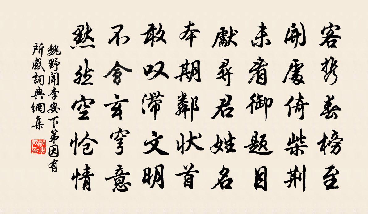 詩詞名句歷史字典書法欣賞書法字典國語詞典說文解字康熙字典古漢語字典標 題 作 者 詩 句 聞李安下第因有所感作者:魏野 朝代:宋代聞李安下第因有所感原文客攜春榜至,開處倚柴荊。未看御題目,先尋君姓名。本期鄰狀首,敢嘆滯文明。不會玄穹意,默然空愴情。詩詞問答問:聞李安下第因有所感的作者是誰?答:魏野問:聞李安下第因有所感寫於哪個朝代?答:宋代魏野聞李安下第因有所感書法欣賞聞李安下第因有所感書法作品詩詞推薦送惠思歸杭州鄭獬〔宋代〕湖上秋風滿,歸懷豈易寬。身隨秦樹老,夢入浙江寒。為客久應厭,到家貧亦安。石房舊書在,重拂綠塵看。次韻奉酬覺之王安石〔宋代〕久知乘傳入西州,雞黍從容本不謀。戶外驚塵尺書至,眼中飛浪片帆收。山林病骨煩三顧,湖海離腸欲萬周。尚有偈頌二十二首釋道生〔宋代〕古帆高掛入曹源,雷動風行海岳昏。三十二峰親坐斷,一毛頭上定乾坤。陳思王植徐鈞〔宋代〕任性何能勝矯情,奪儲切勿怨無成。阿丕縱享為君樂,得似文章千載名。登太山郭賁〔宋代〕雙屐沖煙上泰台,欲將老眼傍天開。春深疊嶂晴看雪,雨後飛泉夜聽雷。玉節攢蒼煙浩渺,群山裂翠壁崔嵬。目前送裴闡(得歸字)皇甫冉〔唐代〕道向毗陵豈是歸,客中誰與換春衣。今夜孤舟行近遠,子荊零雨正霏霏。念奴嬌(賀陳新淥再娶)趙必〔宋代〕燒燈過也,倩東風、又翦芙蕖千朵。翠陣珠圍依然是,舊日笙歌社火。一曲乘鶯,萬錢騎鶴,仙子來蓬島。金尊滿杭州送蕭寶校書朱慶餘〔唐代〕馬識青山路,人隨白浪船。別君猶有淚,學道謾經年。歲杪道中王銍〔宋代〕岩風號萬木,天意自悲傷。野店逢殘歲,危峰半夕陽。吾生猶道路,此恨付杯觴。正是淒涼極,寒梅逗晚香。元夕醉梅山弟家陳著〔宋代〕行年八十病餘身,梅塢留連率見真。花到詩家方吐氣,酒無菜飣不成春。世情風雨妨婦路,古道山林有主人。珍重賀新郎史達祖〔宋代〕綠障南城樹。有高樓銜城,樓下芰荷無數。客自倚闌魚亦避,恐是持竿伴侶。對別浦、扁舟容與。楊柳影間風不到虞美人趙長卿〔宋代〕燈前忍見啼紅面。別酒頻斟勸。愁蛾斂翠不勝情。報導看看天色、待平明。殷勤重把陽關唱。休要教人望。出門猶龜山之孫楊子順肇慶一見相投隨至德慶謀館寓曾豐〔宋代〕誰續寂寥洙泗弦,濂溪一轉至伊川。只今洛派從頭數,之子龜山第二傳。他道已融歸正道,後正猶辦入先天。十年春日汎舟南湖因遍游近港坐間書客所攜四扇張鎡〔宋代〕遠近高低錦樹明,直疑春教蝶多情。人間萬事思量盡,只好園居過此生。至尉氏張說〔唐代〕夕次阮公台,嘯歌臨爽塏。高名安足賴,故物今皆改。吾兄昔茲邑,遺愛稱賢宰。桑中雉未飛,屋上烏猶在。途逢次韻謝張德粹主簿晁公溯〔宋代〕久知經籍總皆通,萬卷縱橫在腹中。占雨正當求管輅,藏冰更欲問申豐。每慚列爵來分土,未辦通商與惠工。君自句劉承弼〔宋代〕境靜人亦寂,觴至壺自傾。林子中知府輓詩虞儔〔宋代〕彩棒初行志,華途蚤策勛。旋聞鳧舄召,徑有虎符分。嘆息誰為黨,推求誤到君。天公還憒憒,玉石竟俱焚。天津感事二十六首邵雍〔宋代〕雲輕日淡天津暮,風急林疏洛水秋。獨步獨吟人莫會,時時鷗鷺下汀洲。呈吳門王治中元俞都中參政伯大孫先人同榜方回〔宋代〕君家兩參預,漢代韋平民。留耕而耕存,惟有是以似。乃祖忠文公,補天扶國是。乃父敬愍侯,浮海將使指。直諫名句推薦少年射虎名豪,等閒赤羽千夫膳元好問《水龍吟·從商帥國器獵於南陽同仲澤鼎玉賦此》 傷心秦漢,生民塗炭,讀書人一聲長嘆。張可久《賣花聲·懷古》 南北山頭多墓田,清明祭掃各紛然。高翥《清明日對酒》 高或入於虛,華或入於浮,而虛浮之士,究難指為高華。王永彬《圍爐夜話·第一一O則》 驚風飄白日,忽然歸西山曹植《贈徐幹詩》 何似當筵虎士,揮手弦聲響處,雙雁落遙空。葉夢得《水調歌頭·九月望日與客習射西園余偶病不能射》 願妾身為紅菡萏。年年生在秋江上。歐陽修《漁家傲·近日門前溪水漲》 海內風塵諸弟隔,天涯涕淚一身遙。杜甫《野望》 凡與敵戰,若有形勢便利之處,宜爭先據之,以戰則勝。佚名《百戰奇略·第四卷·爭戰》 相思記取,愁絕西窗夜雨。韓元吉《薄倖·送安伯弟》