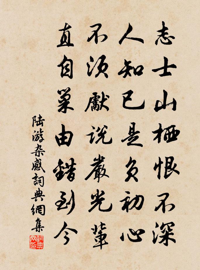 詩詞名句歷史字典書法欣賞書法字典國語詞典說文解字康熙字典古漢語字典標 題 作 者 詩 句 雜感作者:陸游 朝代:宋代雜感原文志士山棲恨不深,人知已是負初心。不須先說嚴光輩,直自巢由錯到今。詩詞問答問:雜感的作者是誰?答:陸游問:雜感寫於哪個朝代?答:宋代問:陸游的名句有哪些?答:陸游名句大全陸游雜感書法欣賞雜感書法作品詩詞推薦顏杲卿徐鈞〔宋代〕一曲霓裳失太平,漁陽鼙鼓暗風塵。君王只識楊丞相,不識平原老守臣。西省荼蘼架上殘雪可愛紅呈諸友人林一龍〔宋代〕酴醾花底當年事,夜雪模糊照石闌。北省今朝枝上雪,還揩病眼作花看。江西李君千能能和墨及畫梅艮齋許以三奇而詩樓鑰〔宋代〕遊藝無小大,要皆知本原。後人率意作,終當愧前賢。老潘妙對膠,法從玉局傳。或假季心名,空掃千鐙煙。補之別洞庭維諒上人皎然〔唐代〕白雲關我不關他,此物留君情最多。情著春風生橘樹,歸心不怕洞庭波。夏日草堂作齊己〔唐代〕沙泉帶草堂,紙帳卷空床。靜是真訊息,吟非俗肺腸。園林坐清影,梅杏嚼紅香。誰住原西寺,鐘聲送夕陽。戊早年七夕五絕張秉〔宋代〕紅渠爛熳碧池香,羅綺三千侍漢皇。阿母暫來成底事,茂陵宮桂已蒼蒼。和公辟轉運江西王安石〔宋代〕江西一節鑄黃金,最慰章濱父老心。長孺向來真強予,次公今不異重臨。餘風尚有歡謠在,陳跡非無勝事尋。豫想青溪王維〔唐代〕〔一作過青溪水作〕言入黃花川。每逐青溪水。隨山將萬轉。趣途無百里。聲喧亂石中。色靜深松里。漾(一作演送顏□之清漳六言三首劉克莊〔宋代〕昔有華陽真逸,今惟員嶠老仙。懸弧小余□歲,拈花先我兩年。一鷺先立池中,有雙鷺自外來。先立者逐之,楊萬里〔宋代〕鷺鶿各自有食邑,長恐諸侯客子來。一鷺忽追雙鷺去,窮追盡處始飛回。寄遠人杜牧〔唐代〕終日求人卜,回回道好音。那時離別後,入夢到如今。齊安食蔞蒿根菊茁張耒〔宋代〕故園蔬甲又逢春,想見雕盤巧斗新。強掘蔞根盤郁屈,故挑菊茁嚼芳辛。春來小疾妨杯切,老去懷鄉役夢頻。堪笑用前韻酬魏倅王炎〔宋代〕手把一麾來霅水,身似痿人方暫起。此行本為貧所驅,非戀吳中風土美。浩蕩煙波隔白鷗,間關道路勞黃耳。幸而元夕留城外袁甫〔宋代〕三市香塵隘綺羅,遊人無奈月明何。吾儂分得寬間外,地闊天高得月多。贊此庵元和尚二首釋曇華〔宋代〕佛祖生冤家,人天不喜見。忒殺聱頭,卻通一線。劈胸拳下破牢關,大用機輪轆轆轉。再和張秋山杭州孤山二首何夢桂〔宋代〕歌舞錢塘厭說兵,悠悠往事竟何成。錢鏐鐵箭千年在,伍子鴟夷一死輕。湖上園亭春代謝,江頭潮汐月虧盈。相逢句陳堯佐〔宋代〕相逢吟未足。答林康民見和梅花詩洪邁〔宋代〕寒崦人家碧豀尾,一樹江梅臥清泚。仙姿態不受白眼污,風斂天香瘴煙里。向來休沐偶無事,惟我亦遊藝機二三子送和北虜使馬戴〔唐代〕路始陰山北,迢迢雨雪天。長城人過少,沙磧馬難前。日入流沙際,陰生瀚海邊。刀環向月動,旌纛冒霜懸。逐獸高宗郊祀前廟朝享太廟三十首真宗〔宋代〕昭哉皇祖,源深流長。雕戈圭瓚,休有烈光。天祐潛德,繼世其昌。永懷積累,嘉訝令芳。名句推薦黃河萬里觸山動,盤渦轂轉秦地雷。李白《西嶽雲台歌送丹丘子》 金剛則折,革剛則裂。劉向《說苑·敬慎》 獨倚危欄,神遊無際,天地猶嫌隘。朱栴《念奴嬌·雪霽夜月中登樓望賀蘭山作》 鷺窺蘆箔水,鳥啄紙錢風。范成大《寒食郊行書事》 誰料同心結不成,翻就相思結。夏完淳《卜運算元·秋色到空閨》 舊苑荒台楊柳新,菱歌清唱不勝春。李白《蘇台覽古》 上交不諂,下交不瀆佚名《易傳·繫辭傳下·第五章》 秋晚蓴鱸江上,夜深兒女燈前。辛棄疾《木蘭花慢·滁州送范倅》 北山白雲里,隱者自怡悅孟浩然《秋登萬山寄張五/九月九日峴山寄張子容》 塞花飄客淚,邊柳掛鄉愁。岑參《武威春暮聞宇文判官西使還已到晉昌》