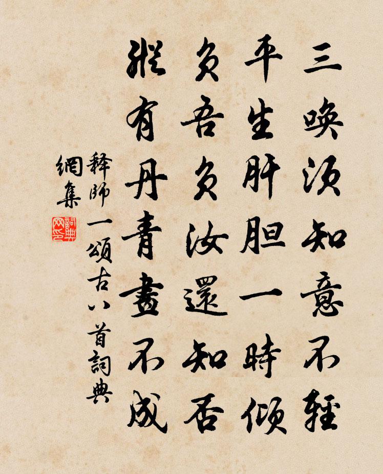 詩詞名句歷史字典書法欣賞書法字典國語詞典說文解字康熙字典古漢語字典標 題 作 者 詩 句 頌古八首作者:釋師一 朝代:宋代頌古八首原文三喚須知意不輕,平生肝膽一時傾。負吾負汝還知否,縱有丹青畫不成。詩詞問答問:頌古八首的作者是誰?答:釋師一問:頌古八首寫於哪個朝代?答:宋代釋師一頌古八首書法欣賞頌古八首書法作品詩詞推薦苦熱和袁應祥用韋蘇州喬木生夏涼流雲吐華月郭印〔宋代〕旱魃難除遣,南箕未可招。安能颺雙舄,飛去學王喬。蘇幕遮 勸迷途王處一〔元代〕嘆迷人,如大醉。敢使機謀,爭眼謾天地。殺盜邪淫咒神理。一向無知,不顧臨時罪。氣歸空,形委廢。性識區區和清江韓伯善王義山〔宋代〕厥初是理與俱生,一點靈扃透處明。誰肯枉身徇時好,從來造物忌文名。雌黃一任傍人說,暴白只依天理行。輸與泛舟觀桃花陸游〔宋代〕鄰曲一生花里活,村翁疑是古遺民。初來自被春留住,枉道當時為避秦。題徐氏金湖書院楊徵〔宋代〕君家仙館帶林塘,氣象清新志趣長。千里客來如海若,一樓詩靜透文光。門閭旌表芝蘭貴,科第聯芳桂籍香。帝里遣懷魚玄機〔唐代〕閒散身無事,風光獨自游。斷雲江上月,解纜海中舟。琴弄蕭梁寺,詩吟庾亮樓。叢篁堪作伴,片石好為儔。燕雀暑夕有懷白玉蟾〔宋代〕幽人避暑海城西,西北浮屠盡得棲。更漏有無風逆順,紙窗明暗月高低。石泉未到秋先冷,野虎偏從夜即嘶。記得寄杜仲觀賀鑄〔宋代〕中春雨收霽,與子登叢台。形勝宛然在,太行西北來。無情百尺土,千載未摧頹。四顧發悲嘯,淒風振頤頦。淩高句彭克〔宋代〕一溪煙月無人共,吹落梨花曉夢初。晚晴四首趙蕃〔宋代〕殘風落日蟬亂鳴,細履小園欣晚晴。投林倦鳥分螟色,滿地落葉無秋聲。衛尉一錢曾不直,阮郎幾屐畢此生。三十贈僧皎然顏真卿〔唐代〕秋意西山多,別岑縈左次。繕亭歷三癸,趾趾鄰什寺。元化隱靈蹤,始君啟高致。誅榛養翹楚,鞭草理芳穗。俯砌游象罔亭偶成二絕韓維〔宋代〕泛盡溪流數曲清,竹陰開處見新亭。山翁不會題牌意,猶守枯支看道經。荷花胡寅〔宋代〕夢到南塘翠蓋稠,奼然得意斂然羞。驚鴻遠映朝霞色,白鷺先窺霽雨秋。裊裊芳馨煩折贈,霏霏涼吹想追游。天花減字木蘭花戴復古〔宋代〕阻風中酒。流落江湖成白首。歷盡艱關。贏得虛名在世間。浩然歸去。憶著石屏茅屋趣。想見山村。樹有交柯犢有已亥雜詩 28龔自珍〔清代〕不是逢人苦譽君,亦狂亦俠亦溫文。照人膽似秦時月,送我情如嶺上雲。送馮中允使蜀徐鉉〔唐代〕莫笑皤然一病翁,百年交分兩家同。今朝倒{上屍下徒}迎王粲,舊日清談賞阿戎。玉壘無辭軺傳送,金閨初喜姓夜宿鎮城寺王遂〔宋代〕風挾潮頭上,雷將雨腳俱。天應念民物,地得限江湖。鑿堰流平未,頹堤浪入無。不眠頻問曉,白欲上人須。一字至七字詩·茶元稹〔唐代〕茶。 香葉,嫩芽。 慕詩客,愛僧家。碾雕白玉,羅織紅紗。 銚煎黃蕊色,碗轉麴塵哭菊廬舅氏劉黻〔宋代〕舅甥三十年,生別且潸然。書落雁來處,病深秋到邊。故人傷遠道,孤子伴歸船。定有焚黃日,西山松樹阡。和李子儀韻四首吳芾〔宋代〕夜向茅茨宿,晨興矯首看。遠山俱有雪,小店更多寒。客路雖雲惡,兒曹幸已安。不妨頻小憩,時引一杯乾。名句推薦悲歡離合總無情。一任階前、點滴到天明。蔣捷《虞美人·聽雨》 一別都門三改火,天涯踏盡紅塵。蘇軾《臨江仙·送錢穆父》 九日悲秋不到心。鳳城歌管有新音。晏幾道《鷓鴣天·九日悲秋不到心》 長安一片月,萬戶搗衣聲。李白《子夜吳歌·秋歌》 聚如丘山,散如風雨,迅如雷電,捷如鷹鶻宋濂、王褘《元史·列傳·卷四十四》 詩成自寫紅葉,和恨寄東流。晏幾道《訴衷情·憑觴靜憶去年秋》 秀色掩今古,荷花羞玉顏。李白《西施 / 詠薴蘿山》 手攜稚子夜歸院,月冷空房不見人。白居易《為薛台悼亡》 武公不但歌淇澳,賢女猶能唁衛侯。姜塘《摘星樓九日登臨》 何似當筵虎士,揮手弦聲響處,雙雁落遙空。葉夢得《水調歌頭·九月望日與客習射西園余偶病不能射》