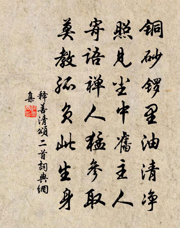 詩詞名句歷史字典書法欣賞書法字典國語詞典說文解字康熙字典古漢語字典標 題 作 者 詩 句 頌二首作者:釋善清 朝代:宋代頌二首原文銅砂鑼里油清淨,照見塵中舊主人。寄語禪人猛參取,莫教孤負此生身。詩詞問答問:頌二首的作者是誰?答:釋善清問:頌二首寫於哪個朝代?答:宋代釋善清頌二首書法欣賞頌二首書法作品詩詞推薦魯港之遁第十四文天祥〔宋代〕出師亦多門,水陸迷畏途。蹭蹬麒麟老,危檣逐夜烏。題花十絕句程公許〔宋代〕飢腸可忍麥登場,寒索衣裘蠶飫桑。莫為花殘恨風雨,深恩何以答東皇。張道士山房次程南仲韻楊公遠〔宋代〕丹房蕭灑絕纖埃,石逕縈紆闢草萊。窗外果從猿摘去,山中芝藉鶴銜回。一甌白雪湯輕注,三尺青蛇匣不開。如許春日雜興王同祖〔宋代〕迢迢清夜靜無嘩,月色千門噪亂鴉。坐久忽驚寒力重,不知殘雪在梅花。秋日送河北從事裴說〔唐代〕北風沙漠地,吾子遠從軍。官路雖非遠,詩名要且聞。蟬悲欲落日,雕下擬陰雲。此去難相戀,前山摻袂分。暮春遊西湖北山楊載〔元代〕愁耳偏工著雨聲,好懷常恐負山行。未辭花事駸駸盛,正喜湖光淡淡晴。倦憩客猶勤訪寺,幽棲吾欲厭歸城。綠疇黃蜀葵薛能〔唐代〕嬌黃新嫩欲題詩,盡日含毫有所思。記得玉人初病起,道家妝束厭禳時。雜體詩 魏文帝曹丕游宴江淹〔南北朝〕置酒坐飛閣。逍遙臨華池。神飈自遠至。左右芙蓉披。綠竹夾清水。秋蘭被組崖。月出照園中。冠佩相追隨。客從銅柱辭李宏皋〔唐代〕招靈鑄柱垂英烈,手執干戈征百越。誕今鑄柱庇黔黎,指畫風雷開五溪。五溪之險不足恃,我旅爭登若平地。五溪詠智門佛殿前凌霄花與斯遠同作趙蕃〔宋代〕桂栽初得地,藤附亦凌霄。層葉圓如葆,高花艷若燒。故能開續續,殊愈落飄飄。有木方思種,從僧會乞苗。六州佚名〔宋代〕雙鳳落,佳氣藹龍山。澄江左,清湖右,日夜海潮翻。因吉地、卜築圜壇。宏基隆陛級,神位周環。邊陲靜、掛起登總持寺閣張九齡〔唐代〕香閣起崔嵬,高高沙版開。攀躋千仞上,紛詭萬形來。草間商君陌,雲重漢後台。山從函谷斷,川向斗城回。林里浣溪沙張元乾〔宋代〕雲氣吞江卷夕陽。白頭波上電飛忙。奔雷驚雨濺胡床。玉節故人同壯觀,錦囊公子更平章。榕陰歸夢十分涼。示智弼禮混源塔釋崇岳〔宋代〕相逢不相識,去後空相憶,靈骨撒長江。清風有何極極識,滔滔浪里休尋覓。與黨侍御元結〔唐代〕眾坐吾獨歡,或問歡為誰。高人黨茂宗,復來官憲司。昔吾順元和,與世行自遺。茂宗正作吏,日有趨走疲。及吾菩薩蠻·水晶簾外娟娟楊基〔明代〕水晶簾外娟娟月,梨花枝上層層雪。花月兩模糊,隔窗看欲無。 月華今夜黑,全見梨花白。花也笑姮娥,讓他鳳州柳曾極〔宋代〕蜀主函封遣使時,芳根元自鳳州移。柔荑醽醁今安在,唯有青絲拂地垂。菩薩蠻蔡伸〔宋代〕朝來一陣狂風雨。春光已作堂堂去。茂綠滿繁枝。青梅結子時。攀枝驚晼晚。樂事孤心眼。正是惜春歸。那堪怨別懷忠襄文天祥〔宋代〕平生王佐心,世運蹈衰末。齊虜誰復封,楚囚詎當脫。金陵雖懷古,尚友在風烈。褒忠侈遺廟,夫子我先達。臨江仙山主〔元代〕冷淡更闌交二鼓,蛩吟聲亂忙忙。紛紛黃葉落階場。萬林失色,雨露變銀霜。追念前秦並漢魏,英雄文武金璋。限名句推薦天迥雲垂草,江空雪覆沙劉基《古戍》 士雖有學,而行為本焉。墨子《墨子·02章 修身》 落月滿屋樑,猶疑照顏色。杜甫《夢李白二首·其一》 海上眾鳥不敢飛,中有鯉魚長且肥。岑參《熱海行送崔侍御還京》 傷心故人去後,冷落新詩。晁沖之《漢宮春·梅》 自是人生長恨水長東。李煜《相見歡·林花謝了春紅》 好問則裕,自用則小佚名《尚書·商書·仲虺之誥》 先到為君,後到為臣。佚名《增廣賢文·上集》 芝蘭生於深林,不以無人而不芳,君子修道立德,不謂窮困而改節。佚名《孔子家語·在厄》 紅豆生南國,春來發幾枝。王維《相思》