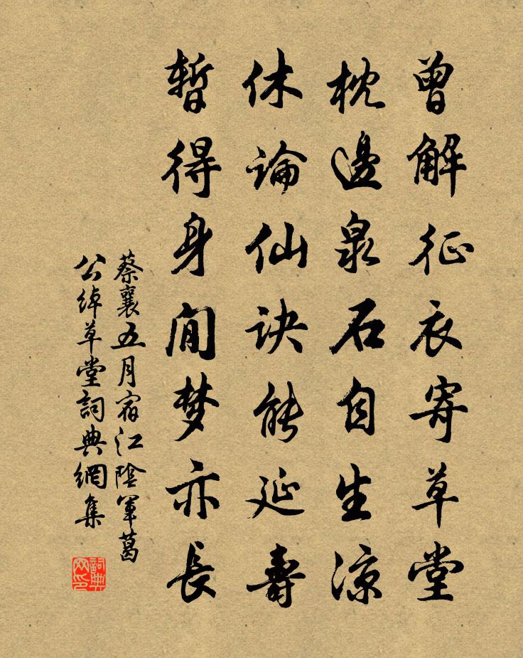 詩詞名句歷史字典書法欣賞書法字典國語詞典說文解字康熙字典古漢語字典標 題 作 者 詩 句 五月宿江陰軍葛公綽草堂作者:蔡襄 朝代:宋代五月宿江陰軍葛公綽草堂原文曾解征衣寄草堂,枕邊泉石自生涼。休論仙訣能延壽,暫得身閒夢亦長。詩詞問答問:五月宿江陰軍葛公綽草堂的作者是誰?答:蔡襄問:五月宿江陰軍葛公綽草堂寫於哪個朝代?答:宋代蔡襄五月宿江陰軍葛公綽草堂書法欣賞五月宿江陰軍葛公綽草堂書法作品詩詞推薦已亥雜詩 263龔自珍〔清代〕道蘊談鋒不落詮,耳根何福受清圓。自知語乏煙霞氣,枉負才名三十年。別庾七入蜀詩庾信〔南北朝〕峻岭拂陽烏。長城連蜀都。石銘懸劍壁。沙洲聚陣圖。山長半股斷。樹古半心枯。由來兄弟別。共念一荊株。十疊劉克莊〔宋代〕江左風流屬謝家,諸郎如玉女尤佳。如何雪裡同聯句,不比梅花比柳花。靜坐對茶花偶作曹彥約〔宋代〕菊後侮前冷落時,剪檀雕蠟酷為肌。人從老處親平淡,花向無中補闕虧。地暖不憂春近遠,窗空惟映月參差。病夫解佩令晏幾道〔宋代〕玉階秋感,年華暗去。掩深宮、團扇無緒。記得當時,自剪下、機中輕素。點丹青、畫成秦女。涼襟猶在,朱弦未次韻答劉涇蘇軾〔宋代〕吟詩面莫作秋蟲面聲,天公怪汝鉤物情,使汝未老華發生。芝蘭得雨蔚青青,何用自燔以出馨。細面千紙雜真行,【南呂】一枝花 遠歸奧敦周卿〔元代〕年深馬骨高,塵慘貂裘敝。夜長鴛夢短,天闊雁書遲。急覓歸期,不索尋名利。歸心緊歸去疾,恨不得裊斷鞭梢,郊廟歌辭。漢宗廟樂舞辭。觀德舞佚名〔唐代〕高廟明靈再啟圖,金根玉輅幸神都。巢阿丹鳳銜書命,入昴飛星獻寶符。正換熏弦娛赤子,忽登仙駕泣蒼梧。薦櫻美李頤老易趙汝騰〔宋代〕易之廣大,無方無體。何圖授羲,斯文天啟。爰畫以象,是陳八物。演六十四,闔辟伸屈。文系繇辭,二千爻旨。在兗州餞宋五之問駱賓王〔唐代〕淮沂泗水地,梁甫汶陽東。別路青驪遠,離尊綠蟻空。柳寒凋密翠,棠晚落疏紅。別後相思曲,淒斷入琴風。玉真公主歌高適〔唐代〕常言龍德本天仙,誰謂仙人每學仙。更道玄元指李日,多於王母種桃年。仙宮仙府有真仙,天寶天仙秘莫傳。為問自安仁至豫章途中雜興十九首趙蕃〔宋代〕草樹蔥蘢山有衣,稻身刺水綠生漪。眼中風物方人境,犬吠雞帝間扊扅。戲贈閿鄉秦少公短歌杜甫〔唐代〕去年行宮當太白,朝回君是同舍客。同心不減骨肉親,每語見許文章伯。今日時清兩京道,相逢苦覺人情好。昨夜禪人並化主寫真求贊釋正覺〔宋代〕白髮半山雪,青瞳兩眼秋,的的環中意,綿綿方外游。虛空說法何須口,萬像森羅自點頭。【越調】憑闌人_風燭功名魚佚名〔元代〕風燭功名魚上竿,石火光陰船下灘。萬鍾奪命舟,得全忠孝難! 休笑孫龐惡戰憨,且論蘇張能劇談。片言封相郊廟歌辭。享太廟樂章。升和佚名〔唐代〕顧惟菲薄,纂歷應期。中外同軌,夷狄來思。樂用崇德,禮以陳詞。夕惕若厲,欽奉弘基。題南台寺張栻〔宋代〕相望幾蘭若,勝處是南台。閣迥規摹穩,門空晝夜開。迴風時浩蕩,高嶺更崔嵬。謾說石頭滑,支筇得往來。和顏長官百詠城市朱繼芳〔宋代〕村翁生長在柴門,身有丁男犢有孫。為了官租才出市,歸家誇說與鄉村。浪淘沙·五嶺麥秋殘歐陽修〔宋代〕五嶺麥秋殘。荔子初丹。絳紗囊里水晶丸。可惜天教生處遠,不近長安。往事憶開元。妃子偏憐。一從魂散馬嵬關贈李彥深黃庭堅〔宋代〕瓊枝雖療渴,萱草忘人憂。李君氣蕭蕭,翠竹搖清秋。步竹來過門,日色在簾鉤。開雲睹白雉,臨水對虛舟。言少名句推薦玉在山而草木潤,淵生珠而崖不枯。荀子《荀子·勸學》 天覆吾,地載吾,天地生吾有意無。李泌《長歌行》 善惡到頭終有報,只盼來早與來遲。佚名《增廣賢文·上集》 八年十二月,五日雪紛紛。白居易《村居苦寒》 冷艷全欺雪,余香乍入衣。丘為《左掖梨花》 可憐今夜月,不肯下西廂。王庭筠《絕句·竹影和詩瘦》 殊方日落玄猿哭,舊國霜前白雁來。杜甫《九日五首·其一》 父之讎,弗與共戴天。兄弟之讎不反兵。交遊之讎不同國。戴聖《禮記·曲禮上》 見善則遷,有過則改。佚名《易傳·象傳下·益》 露葉翻風驚鵲墜。暗落青林紅子。陳師道《清平樂·秋光燭地》