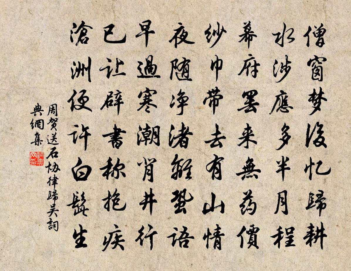 詩詞名句歷史字典書法欣賞書法字典國語詞典說文解字康熙字典古漢語字典標 題 作 者 詩 句 送石協律歸吳作者:周賀 朝代:唐代送石協律歸吳原文僧窗夢後憶歸耕,水涉應多半月程。幕府罷來無藥價,紗巾帶去有山情。夜隨淨渚離蛩語,早過寒潮背井行。已讓辟書稱抱疾,滄洲便許白髭生。詩詞問答問:送石協律歸吳的作者是誰?答:周賀問:送石協律歸吳寫於哪個朝代?答:唐代問:送石協律歸吳是什麼體裁?答:七律周賀送石協律歸吳書法欣賞送石協律歸吳書法作品注釋全唐詩:卷503-76詩詞推薦蝶戀花向子諲〔宋代〕推上百花如錦繡。水滿池塘,更作濺濺溜。斷送風光惟有酒。苦吟不怕因詩瘦。尋壑經丘長是久。晚晚歸來,稚子花月吟效連珠體十一首 10唐寅〔明代〕一庭花月正春宵, 花氣芬芳月正饒; 風動花枝探月影, 天開月鏡照花妖。 月中漫擊催花鼓, 花下輕傳弄題資福院平綠軒二首陳炳〔宋代〕水屋圍春綠,雲岑送曉青。無心向朝市,信步到禪扃。野境連天遠,疏鍾隔岸聽。杯行莫辭醉,檐月笑人醒。憩南屏釋紹嵩〔宋代〕窈窕階除天一方,隔簾時有芰荷香。老僧瀹茗供清興,不負西湖五月涼。放舟戲書釋紹嵩〔宋代〕放纜山溪一葉輕,樹頭半落半猶青。竹問飛下雙鸂鶒,天作人間小畫屏。上巳日陪齊相公花樓宴盧綸〔唐代〕鍾陵暮春月,飛觀延群英。晨霞耀中軒,滿席羅金瓊。持杯凝遠睇,觸物結幽情。樹色參差綠,湖光瀲灩明。禮卑寄題寶應無斁鳧舄堂二首一晁補之〔宋代〕賓戲令晁子,名堂無乃迂。何為仍負弩,秪合便飛鳧。彭澤且市隱,太丘猶世儒。解嘲吾亦倦,系雁一相娛。忝役湘州與宣城吏民別詩謝朓〔南北朝〕羽齡倦簪履。薄晚忝華奧。閒沃盡地區。山泉諧所好。幸遇昌化穆。惇俗罕驚暴。四時從偃息。三省無侵冒。下車送友人歸江南張喬〔唐代〕辛勤同失意,迢遞獨還家。落日江邊笛,殘春島上花。親安誠可喜,道在亦何嗟。誰伴高吟處,晴天望九華。江南別友人張喬〔唐代〕勞生故白頭,頭白未應休。闕下難孤立,天涯尚旅遊。聽猿吟島寺,待月上江樓。醉別醒惆悵,雲帆滿亂流。狂言示諸侄白居易〔唐代〕世欺不識字,我忝攻文筆。世欺不得官,我忝居班秩。人老多病苦,我今幸無疾。人老多憂累,我今婚嫁畢。心安轉運少卿生日朱長文〔唐代〕昔在章聖朝,先君為名臣。入陪儒林老,出擁使者輪。忠漠與休烈,萬世永不泯。惜哉未大任,天意昌後人。公生擬玉台體七首其二攜手曲梅堯臣〔宋代〕攜手出中閨,殷勤克密期。密期雖不遠,回顧步遲遲。元夕題燈龕四首程公許〔宋代〕圍棘侵天催速戰,土膏行雨要興耕。儒風鼎盛田多稼,早願三邊洗甲兵。湘陰陳隆之〔宋代〕瀟湘天下景,絕勝是湖山。水國三千界,煙光十二鬟。乾坤水鑒里,樓閣畫屏間。有路憑風馭,心隨倦鳥還。感傷文天祥〔宋代〕地維傾渤澥,天柱折崑崙。清夜為揮淚,白雲空斷魂。死生蘇子節,貴賤翟公門。高廟神靈在,乾坤付不言。句釋曇穎〔宋代〕天地尚空秦日月,山河不見漢君臣。艾如張陸游〔宋代〕錦膺繡羽名山雞,清泉可飲林可棲;稻粱滿野棄不啄,雖有奇禍無階梯。東村西村煙雨晚,蕭艾離離林薄淺;翩然【正宮】塞鴻秋鄭光祖〔元代〕門前五柳江侵路,莊兒緊靠白苹渡。除彭澤縣令無心做,淵明老子達時務。頻將濁酒沽,識破興亡數,醉時節笑捻句陶弼〔宋代〕五十溪州五寨城,廣宣恩詔諭蠻情。名句推薦午醉醒來愁未醒。送春春去幾時回。張先《天仙子·水調數聲持酒聽》 秦中花鳥已應闌,塞外風沙猶自寒。王翰《涼州詞二首》 一番荷芰生池沼,檻前風送馨香。尹鶚《臨江仙·一番荷芰生池沼》 山明水淨夜來霜,數樹深紅出淺黃。劉禹錫《秋詞二首》 瘦影自臨春水照,卿須憐我我憐卿。馮小青《怨》 雪裡溫柔,水邊明秀,不借春工力。辛棄疾《念奴嬌·梅》 騁望因高雲外盡,鄉關回首愧煙蘿。石茂華《九月九日登長城關》 飛鳥沒何處,青山空向人。劉長卿《餞別王十一南遊》 莫笑賤貧夸富貴,共成枯骨兩何如?白居易《放言五首·其四》 精誠所加,金石為開。范曄《後漢書·列傳·光武十王列傳》