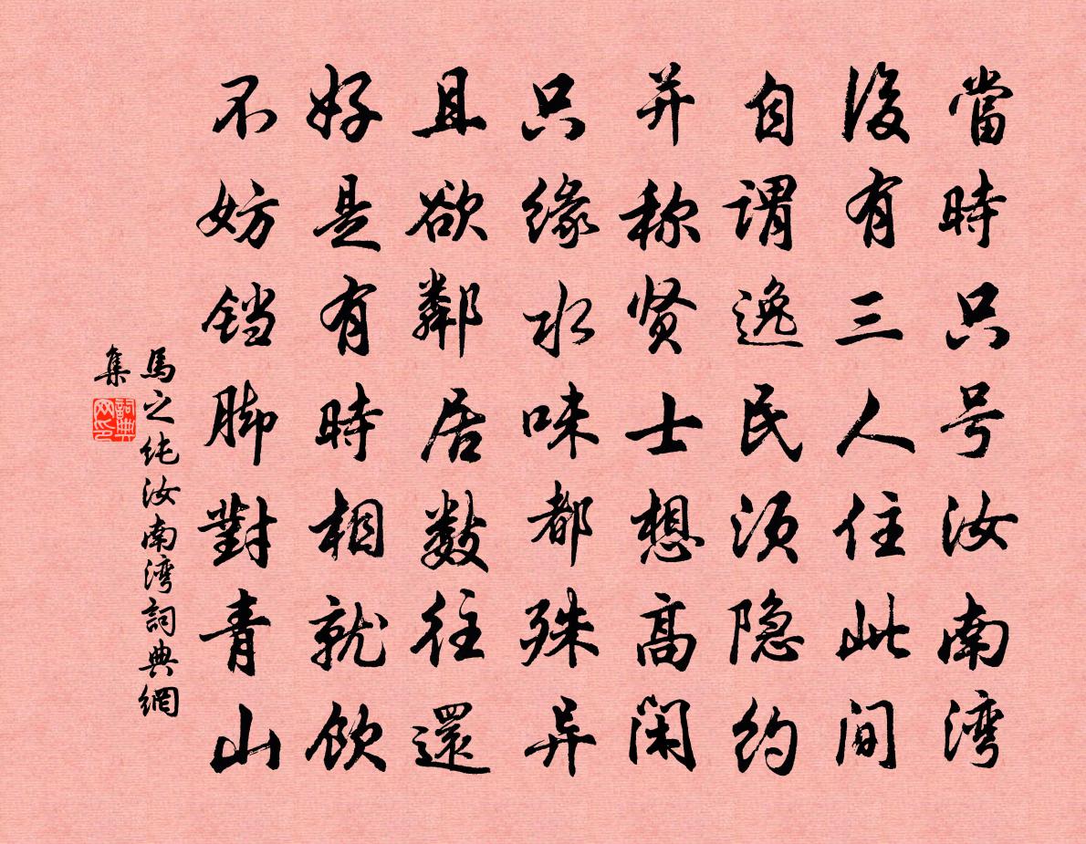 詩詞名句歷史字典書法欣賞書法字典國語詞典說文解字康熙字典古漢語字典標 題 作 者 詩 句 汝南灣作者:馬之純 朝代:宋代汝南灣原文當時只號汝南灣,後有三人住此間。自謂逸民須隱約,並稱賢士想高閒。只緣水味都殊異,且欲鄰居數往還。好是有時相就飲,不妨鐺腳對青山。詩詞問答問:汝南灣的作者是誰?答:馬之純問:汝南灣寫於哪個朝代?答:宋代馬之純汝南灣書法欣賞汝南灣書法作品詩詞推薦章仙姑葉適〔宋代〕柏水為糧處療飢,春江千里正逶迤。應知偃鼠歸休地,不在神龍起蟄時。題太和樓壁佚名〔宋代〕太和酒樓三百間,大槽晝夜聲潺潺。千夫承糟萬夫甕,有酒如海糟如山。銅鍋熔盡龍山雪,金波湧出西湖月。星宮初成遺老齋待月軒藏書室三首其二待月軒蘇轍〔宋代〕軒前無物但長空,孤月忽來東海東。圓滿定從何處得,清明許與眾人同。憐渠生死未能免,顧我盈虧略己通。夜久應王中丞思遠詠月詩沈約〔南北朝〕月華臨靜夜。夜靜滅氛埃。方暉竟戶入。圓影隙中來。高樓切思婦。西園游上才。網軒映珠綴。應門別錄苔。洞房哭林艾軒陳俊卿〔宋代〕出為嶺嶠澄清使,歸作甘泉侍從臣。百擔有書行李重,千金無產橐中貧。錢文季少卿以蜀中織成山谷廬山高為壽次韻樓鑰〔宋代〕七十衰翁年愈高,意氣銷盡湖海豪。平生萬事不翅足,但欲乞身歸故巢。幾番掛冠不容去,歸夢屢涉滄浪濤。縱使次韻分寧胡宰贈行王炎〔宋代〕別駕無才堪展驥,解印來歸私自喜。意欲息肩猶未能,政坐文窮巧為崇。鳧仙傾蓋如舊知,冰玉清言心可洗。況逢木蘭花慢 丙戌歲,游永安故宮,遍覽太液池耶律鑄〔元代〕客,感而賦此。花枝臨太液,□解語、入溫柔。*桂窟低迷,天香飄蕩,倒影遲留。須知畫圖難足,更青山環抱帝六月八日夜步西湖即事王志道〔宋代〕步繞西湖路,荷盤送晚香。歸舟初裊纜,斜月已侵廊。水外鐘聲杳,風膠曲韻長。剨然思遠舉,逸興渺難量。答范祖禹蘇軾〔宋代〕吾州下邑生劉季,誰數區區張與李。(來詩有張僕射、李臨淮之句。)重瞳遺⻊亦已塵埃,惟有黃夜遊宮馬鈺〔元代〕識破塵勞苦。苦樂清閒,恣情歌舞。有似孤雲來又去。沒牽纏,得逍遙,內自補。日夜調龍虎。時時奼嬰相聚。養戲十九兄二首杜范〔宋代〕君曾夷視北山巔,險阻誰知在眼前。亟欲問君無恙否,小春催到探梅天。送嚴上舍並寄諸公十首寄趙景安府判陳造〔宋代〕已種河陽柳,將題晉客輿。論交記曩昔,因使問何如。擁燼就多暇,援毫不一書。詩成當屬我,拜賜袞褒餘。譏元載詩高亭〔唐代〕上元官吏務剝削,江淮之人皆白著。壬子勸駕李曾伯〔宋代〕人物從來盛楚南,新元詔士奉芝函。身逢熙運千之一,名占巍科十有三。好趁驛格催騎策,歸來官柳映袍藍。池邊宿小寺觀主僧升座劉克莊〔宋代〕靜處尤宜策睡勛,徑投禪榻炷爐熏。恰為胡蝶春遊美,忽吼華鯨曙色分。僧袒右肩方說法,我聾左耳若無聞。平生禪人並化主寫真求贊釋正覺〔宋代〕坐曲木床,握烏藤杖。鑄佛祖之楷模,活叢林之氣象。你莫來虎口撩須,誰更敢蛇頭揩癢。送謝景思從辟督府二首曹勛〔宋代〕乘傳逆知懷抱開,壁門春晚靜塵埃。萱明子舍雖雲樂,檄愈頭風得屢催。橫槊便知威黠虜,指蹤端復賴長才。維持塞上曲張祜〔唐代〕邊風捲地時,日暮帳初移。磧迥三通角,山寒一點旗。連收榻索馬,引滿射鵰兒。莫道功勳細,將軍昔戍師。讀閬風題林隱詩追和贈汪秀才戴表元〔宋代〕山林一跡地,塵土二毛年。避世書為屋。謀生藥當田。卉衣從俗制,疏從學僧煎。渺渺滄溟去,今誰魯仲連。名句推薦若待上林花似錦,出門俱是看花人。楊巨源《城東早春》 富而不驕,貴而不舒。司馬遷《史記·五帝本紀》 心無備慮,不可以應卒。墨子《墨子·05章 七患》 生而不有,為而不恃,長而不宰。是謂玄德。老子《老子·道經·第十章》 亭皋木葉下。隴首秋雲飛。柳惲《搗衣詩》 不堪腸斷思鄉處,紅槿花中越鳥啼。李德裕《謫嶺南道中作》 琴里知聞唯淥水,茶中故舊是蒙山。白居易《琴茶》 君子不蔽人之美,不言人之惡。韓非及後人《韓非子·內儲說上七術》 南浦淒淒別,西風裊裊秋。白居易《南浦別》 居必擇鄉,游必就士。荀子《荀子·勸學》