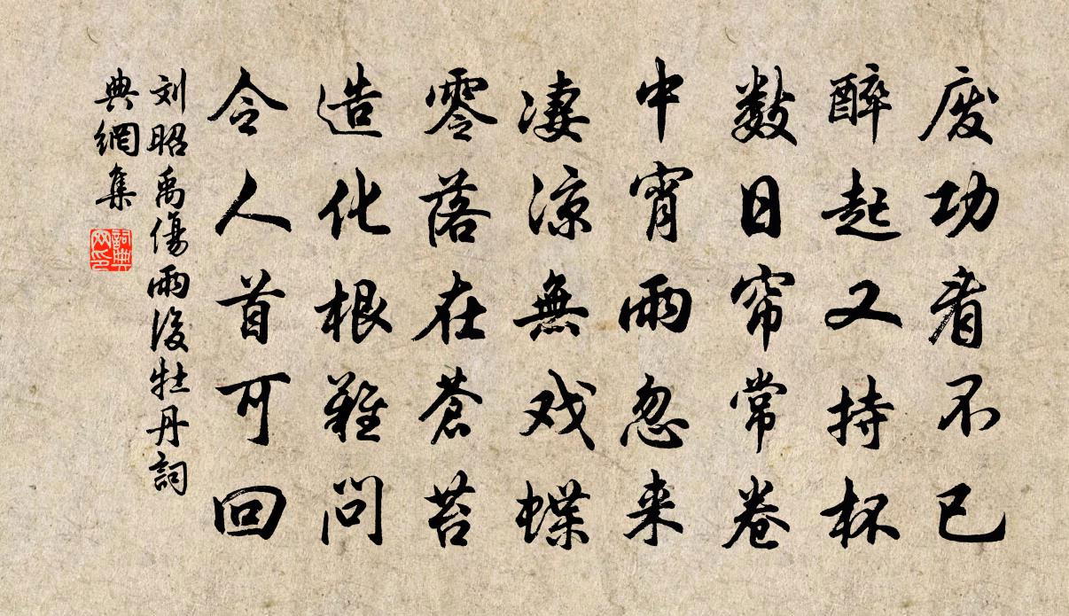 詩詞名句歷史字典書法欣賞書法字典國語詞典說文解字康熙字典古漢語字典標 題 作 者 詩 句 傷雨後牡丹作者:劉昭禹 朝代:唐代傷雨後牡丹原文廢功看不已,醉起又持杯。數日簾常卷,中宵雨忽來。淒涼無戲蝶,零落在蒼苔。造化根難問,令人首可回。詩詞問答問:傷雨後牡丹的作者是誰?答:劉昭禹問:傷雨後牡丹寫於哪個朝代?答:唐代問:傷雨後牡丹是什麼體裁?答:五律劉昭禹傷雨後牡丹書法欣賞傷雨後牡丹書法作品注釋全唐詩:卷886-39詩詞推薦蕭宅二三子贈答詩二十首蛺蝶請客盧仝〔唐代〕粉末為四體,春風為生涯。願得紛飛去,與君為眼花。和仲鹹詩六首之三和自詠王禹偁〔宋代〕玉經炎火竹經霜,卻把剛腸變酒腸。庾信悲哀休作賦,接輿歌曲且佯狂。更諳喪亂災為福,蘊蓄才華有若亡。孤宦潭溪十詠悠然堂劉子翬〔宋代〕吾廬猶未完,作意創此堂。悠然見南山,高風邈相望。賓至聊共娛,無賓自徜徉。修竹宴客東園黃庚〔宋代〕二月春光潑眼深,攜樽宴客小亭東。酒當半醉半醒處,春在輕寒輕暖中。拂檻柳添吟鬢綠,壓闌花妒舞衣紅。晚來譏劉秘監獻佞固灶劉黻〔宋代〕白玉堂中翰墨師,忍令奏牘玷塗碑。向時剛道梅花累,今累梅花自不知。目昏頗廢觀書以詩記其始時年七十九矣陸游〔宋代〕少時業詩書,慕古不自量,晨暮間弦誦,左右紛朱黃。積書山崇崇,探義海茫茫。同志三四人,辯論略相當。落筆湛處士枸杞架歌皎然〔唐代〕天生靈草生靈地,誤生人間人不貴。獨君井上有一根,始覺人間眾芳異。拖線垂絲宜曙看,裴回滿架何珊珊。春風南秦雪白居易〔唐代〕往歲曾為西邑吏,慣從駱口到南秦。三時雲冷多飛雪,二月山寒少有春。我思舊事猶惆悵,君作初行定苦辛。任賴王昭君曹勛〔宋代〕好惡由來各在人,況憑圖像覓天真。君王視聽能無壅,延壽何知敢妄陳。西江月張榘〔宋代〕春事三分之二,落花庭院輕寒。翠屏圍夢寶熏殘。窗外流鶯聲亂。睡起猶支雪腕,覺來慵整雲鬟。閒拈樂府憑闌乾念奴嬌石孝友〔宋代〕悶紅顰翠,惜流年、忍對艷陽時節。白玉樓成人去後,兩地音塵都絕。鸞鑑分飛,夢雲零亂,歡意今衰颯。墨痕紅影論吟邵雍〔宋代〕性在體內,影在形外。必往體隨,形行影會。體性不存,形影安在。影外之言,曾何足怪。呈陸嚴州五首趙蕃〔宋代〕簿領古白下,檄書走臨川。陳詩道所懷,奈此巍巍然。臨分得聞見,語以故有連。此意亦厚矣,乖離今十年。安仁挹仙亭吳芾〔宋代〕區區終日困塵勞,長恨仙山去路遙。豈謂一朝供顧挹,坐令逸氣出層霄。寄陳石窗林石田老友顧逢〔宋代〕典刑惟二老,利祿等鴻毛。士行貧中見,詩名犯後高。苦心親筆硯,冷眼看兒曹。肥馬輕裘輩,多應笑弊袍。春日郊外蘇籀〔宋代〕蔥路桃溪浩莽春,彤甍栱桷曜芳晨。衣如方士客閒劇,園號儀同勢絕倫。梓幄桂旂端解賦,橘藩筱塢孰為鄰。畦畦脫京口出巷難文天祥〔宋代〕不時徇鋪路縱橫,小隊戎衣自出城。天假漢兒燈一炬,旁人只道是官行。水調歌頭(賦松菊堂)辛棄疾〔宋代〕淵明最愛菊,三徑也栽松。何人收拾,千載風味此山中。手把離騷讀遍,自掃落英餐罷,杖屨曉霜濃。皎皎太獨立秦淮鄭獬〔宋代〕秦氏無過一再傳,欲圖萬里據秦川。漢家只在芒山下,卻謂金陵五百年。袷享八首真宗〔宋代〕上天眷命,佑我丕基。翼翼皇祖,不耀其輝。積厚流長,福祿攸宜。祀事孔時,曾孫篤之。名句推薦唱罷秋墳愁未歇,春叢認取雙棲蝶。納蘭性德《蝶戀花·辛苦最憐天上月》 同來望月人何處?風景依稀似去年。趙嘏《江樓舊感 / 江樓感舊》 歷覽千載書,時時見遺烈。陶淵明《癸卯歲十二月中作與從弟敬遠》 寒氣先侵玉女扉,清光旋透省郎闈。李商隱《對雪二首》 帝里重清明,人心自愁思。孟浩然《清明即事》 丹陽城南秋海陰,丹陽城北楚雲深。王昌齡《芙蓉樓送辛漸二首》 痴心做處人人愛,冷眼觀時個個嫌。馮夢龍《喻世明言·卷三》 利人乎即為,不利人乎即止。墨子《墨子·32章 非樂(上)》 千錘萬鑿出深山,烈火焚燒若等閒。于謙《石灰吟》 相逢成夜宿,隴月向人圓。杜甫《宿贊公房》
