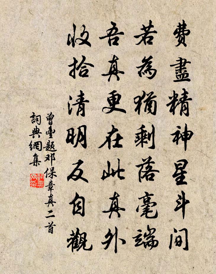 詩詞名句歷史字典書法欣賞書法字典國語詞典說文解字康熙字典古漢語字典標 題 作 者 詩 句 題鄧保章真二首作者:曾豐 朝代:宋代題鄧保章真二首原文費盡精神星斗間,若為猶剩落毫端。吾真更在此真外,收拾清明反自觀。詩詞問答問:題鄧保章真二首的作者是誰?答:曾豐問:題鄧保章真二首寫於哪個朝代?答:宋代曾豐題鄧保章真二首書法欣賞題鄧保章真二首書法作品詩詞推薦江城子尹鶚〔唐代〕裙拖碧,步飄香,織腰束素長。鬢雲光,拂面瓏璁,膩玉碎凝妝。寶柱秦箏彈向晚,弦促雁,更思量。於中好楊無咎〔宋代〕梅花摘索穿疏竹。蔭紋禽、喜歡相逐。坐中已自清堪掬。更瀟灑、人如玉。新聲愛度周郎曲。捧霞杯、再三相囑。書壁釋宗振〔宋代〕住在千峰最上層,年將耳順任騰騰。免教名字掛人齒,甘作今朝百拙僧。又戲題下岩黃庭堅〔宋代〕往往攜家來托宿,裙襦參錯佛衣巾。未嫌滿院油頭臭,蹋破苔錢最惱人。漳州白蓮僧宗要見遺紙扇每扇各書一首蔡襄〔宋代〕野老尋山翦白雲,欲將清吹助南薰。不堪便面張京兆,恰稱能書王右軍。陳淮水孫元晏〔唐代〕文物衣冠盡入秦,六朝繁盛忽埃塵。自從淮水乾枯後,不見王家更有人。醉落魄/一斛珠曾覿〔宋代〕情深恨切。憶伊誚沒些休歇。百般做處百廝愜。管是前生,曾負你冤業。臨岐不忍匆匆別。兩行珠淚流紅頰。關山墨君十詠霜節王銍〔宋代〕春花秋月不同時,高節偏於墨色宜。莫遣世間丹綠筆,等閒俗卻歲寒枝。省闈試士洪咨夔〔宋代〕東風蓆帽快行催,渾為天家造士來。捧詔九霄雲氣濕,分題五色日華開。揀金沙裹須精鑒,脫穎囊中盡異材。容受送內弟汪莊仲赴浙西倉幕樓鑰〔宋代〕家食八經秋,茲焉嘉宦遊。往依王仲賓,況事薛居州。寄信憑鴻羽,題詩記虎丘。雲飛親舍近,時望海東頭。澗舖嶺道中四首趙蕃〔宋代〕芋畝疑如蜀,山田更似閩。只看無廢地,寧復有閒民。次南安務前水亭趙介叔韻曹勛〔宋代〕茲亭楚風煙,晴嵐獻斜疊。我來及秋杪,黃花舞紅葉。主人喜清論,曠覽意並愜。明年西郊春,公當來日涉。送陳景明尚書赴召四首黃公度〔宋代〕薄宦跕鳶城,歸來夢乍驚。壯圖空老大,樸學誤平生。有客嘲楊子,無人薦禰衡。鹽車逢伯樂,作意一長鳴。依韻和正老自嘆之什二首強至〔宋代〕妙年為學恥迂疏,直欲聲光擅八區。已是宦情嗟澹泊,可堪世態較錙銖。不調台鼎行吾道,便翼天兵戮汝孥。出入呂與叔挽章四首秦觀〔宋代〕追惟獻歲發春間,和我新詩憶故山。今日始知詩是讖,魂兮應已度函關。寄徐巽秀才歐陽修〔宋代〕瑤花飛雪盪離愁,鷤鴃驚風下綠疇。睢苑樹荒誰共客,楚江楓老獨悲秋。千重錦浪翻如箭,萬疊春山翠入樓。章陌南劍道中桂倪思〔宋代〕道傍岩桂老成行,翠葉經冬不著霜。想見秋清風月裹,綴金粟顆剩輸香。葉致遠置洲田以詩言志次其韻二首王安石〔宋代〕吟嘆君詩久掉頭,知君興不負滄洲。土山欲為羊曇賭,且可專心學奕秋。景祐以後樂章六首真宗〔宋代〕內輔先獻,夙昭去列。保祐之勞,茲惠其德。榮養有終,芳風無極。享獻閟宮,載懷悽惻。春雪有感呈王正叔束徽之王令〔宋代〕彼雪晚何淫,乘時橫此臨。必將滋及物,自合大為霖。也道春來好,何余臈後陰。冬冥誠不道,蒼帝亦何心。俗口名句推薦裳裳者華,其葉湑兮。佚名《裳裳者華》 譽人不增其美。王充《論衡·卷八·藝增篇》 將受命之日則忘其家,臨軍約束則忘其親,援枹鼓之急則忘其身。司馬遷《史記·七十列傳·司馬穰苴列傳》 滄海月明珠有淚,藍田日暖玉生煙。李商隱《錦瑟》 絲絲楊柳絲絲雨。春在溟濛處。蔣捷《虞美人·梳樓》 松樹千年終是朽,槿花一日自為榮。白居易《放言五首·其五》 命由我作,福自己求。袁黃《了凡四訓·立命之學》 千山鳥飛絕,萬徑人蹤滅。柳宗元《江雪》 著葉滿枝翠羽蓋,開花無數黃金錢杜甫《秋雨嘆三首》 未覺池塘春草夢,階前梧葉已秋聲。朱熹《偶成》