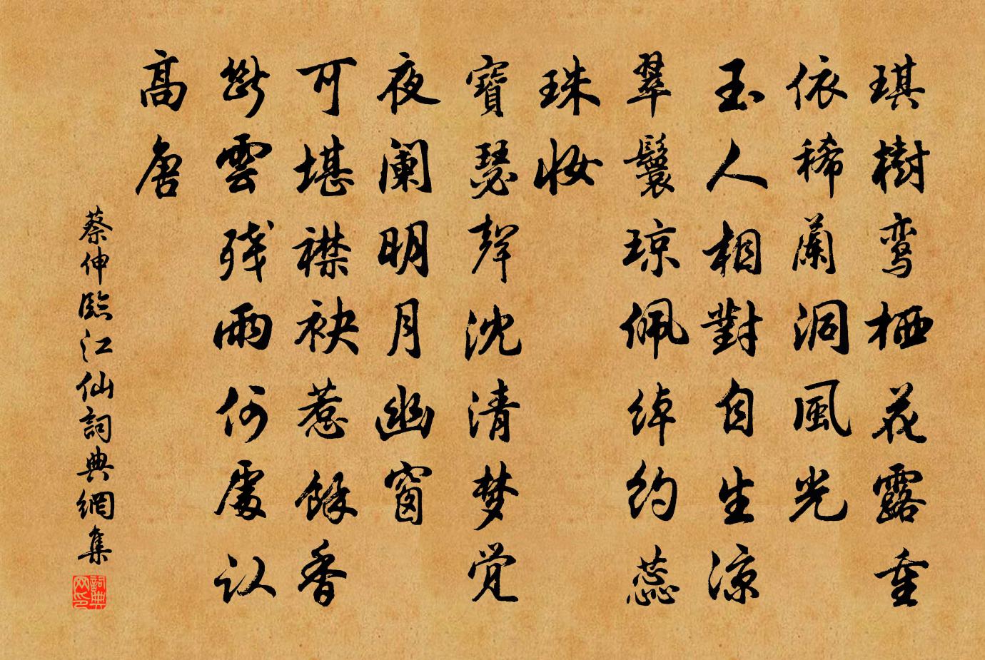 詩詞名句歷史字典書法欣賞書法字典國語詞典說文解字康熙字典古漢語字典標 題 作 者 詩 句 臨江仙作者:蔡伸 朝代:宋代臨江仙原文琪樹鸞棲花露重,依稀蘭洞風光。玉人相對自生涼。翠鬟瓊佩,綽約蕊珠妝。寶瑟聲沈清夢覺,夜闌明月幽窗。可堪襟袂惹餘香。斷雲殘雨,何處認高唐。詩詞問答問:臨江仙的作者是誰?答:蔡伸問:臨江仙寫於哪個朝代?答:宋代問:臨江仙是什麼體裁?答:詞蔡伸臨江仙書法欣賞臨江仙書法作品詩詞推薦為向子諲寫卦影並題狄偁〔宋代〕水畔幡竿險,分符得異恩。潮回波似鏡,聊以寄君身。和東坡先生梅花三首晁補之〔宋代〕梅花落盡上饒村,腸斷子規啼月魂。慰人獨有白玉蕊,不到窗前只醉昏。坐壚環瓮不舉首,浮花浪蕊空滿園。海山暮春林壑圖唐寅〔明代〕逶迤十里平溪路,滴瀝三重下漱泉。為底時來策黎杖,春衣要試浴沂天。遺懷杜甫〔唐代〕愁眼看霜露,寒城菊自花。天風隨斷柳,客淚墮清笳。水淨樓陰直,山昏塞日斜。夜來歸鳥盡,啼殺後棲鴉。偈頌三十首釋印肅〔宋代〕化藏經語,結般若因,度有緣眾。一卷一千,共亦不共,才出頭來,便得受用。此經無價,擬議不中。除非自肯,十離詩。鷹離鞲薛濤〔唐代〕爪利如鋒眼似鈴,平原捉兔稱高情。無端竄向青雲外,不得君王臂上擎。水龍吟(上巳)李彌遜〔宋代〕化工收拾芳菲,暈酥翦彩迎春禊。江山影里,泰階星聚,重尋古意。曲水流觴,晚林張宴,竹邊花外。倩飛英襯地茂陵封禪壇王奕〔宋代〕祥符天子舊明堂,二丈豐碑宿草荒。人世已非壇更是,摩挲老淚濕斜陽。寄傅君倚同年黃庭堅〔宋代〕有情清江水,東下投豫章。故人江上居,不寄書一行。相思對明月,談笑如清光。向風長嘆息,孤雁起寒塘。傾寫浣溪沙·小院閒窗春色李清照〔宋代〕小院閒窗春已深,重簾未卷影沉沉。倚樓無語理瑤琴。(春已深 一作:春色深)遠岫出雲催薄暮,細風吹雨弄輕寒食雨二首蘇軾〔宋代〕自我來黃州,已過三寒食。年年欲惜春,春去不容惜。今年又苦雨,兩月秋蕭瑟。臥聞海棠花,泥污胭脂雪。暗中春晚陸游〔宋代〕五十六翁身百憂,年來轉覺此生浮。山川信美故鄉遠,天地無情雙鬢秋。社後燕如歸客至,春殘花不為人留。一觴日本琳上人請贊釋師範〔宋代〕頭拄天,腳踏地。大宋國裹鼻孔,日本國裹出氣。覺琳持此歸故鄉,大似婆斯入鬧市。偈頌三十首釋印肅〔宋代〕自從達解本心光,陳見解者希相許。今蒙大士墜名香,妙明寂照揮倫楮。清風匝地意何窮,自這賢儒誰伴侶。自傷蟬梅堯臣〔宋代〕柳上一聲蟬,沙頭千里船。行經朝雨後,思亂暑風前。物趣時時改,人情忽忽遷。感新猶感舊,更復幾多年。送傅守歸劉宰〔宋代〕仕至二千石,富貴有足樂。官為諫大夫,亦足究所學。蘭階擢珠樹,金閏聊棣萼。何妨赤松游,不負黃石約。哭待制許先生員興宗〔宋代〕平生一靈台,機智得深屏。出使星移天,歸朝月生嶺。上書肺肝露,不事頰舌逞。事狀嚴歷歷,九原忽甦醒。送江陵泉少府赴任,便呈衛荊州岑參〔唐代〕神仙吏姓梅,人吏待君來。渭北草新出,江南花已開。城邊宋玉宅,峽口楚王台。不畏無知己,荊州甚愛才。洞溪絕句三首韓元吉〔宋代〕桃李欲開天雨雪,二月山城無奈寒。賴爾狐裘來送質,更須樽酒放愁寬。贈別華岳〔宋代〕惆悵長亭嘆別離,送君東去望西歸。落花也似知人意,沾定春衫不肯飛。名句推薦冠蓋滿京華,斯人獨憔悴。杜甫《夢李白二首·其二》 敗葉填溪水已冰,夕陽猶照短長亭。納蘭性德《浣溪沙·敗葉填溪水已冰》 過能改,歸於無。倘掩飾,增一辜。李毓秀《弟子規·信》 知音少,弦斷有誰聽。岳飛《小重山·昨夜寒蛩不住鳴》 宜如臨深淵,如履薄冰,戰戰慄栗,日慎一日。范曄《後漢書·本紀·光武帝紀上》 不因俊俏難為友,正為風流始讀書。曹雪芹《紅樓夢·第七回》 白水明田外,碧峰出山後。王維《新晴野望》 命將征西極,橫行陰山側。李白《塞上曲》 江海不擇小助,故能成其富。韓非及後人《韓非子·大體》 人一能之,己百之。人十能之,己千之。子思《中庸·第二十章》
