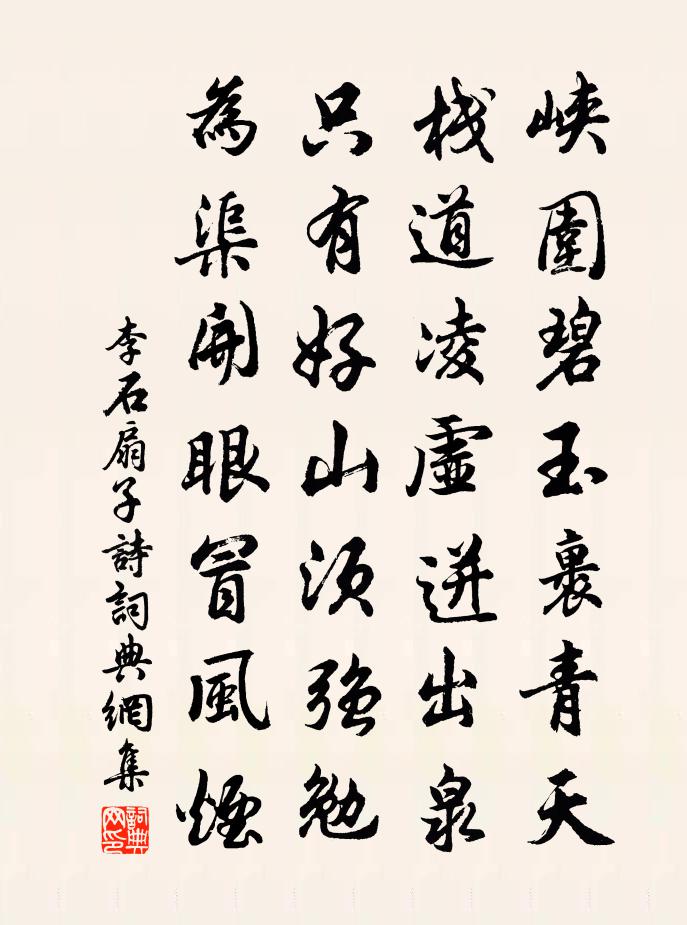 詩詞名句歷史字典書法欣賞書法字典國語詞典說文解字康熙字典古漢語字典標 題 作 者 詩 句 扇子詩作者:李石 朝代:宋代扇子詩原文峽圍碧玉裹青天,棧道凌虛迸出泉。只有好山須強勉,為渠開眼冒風煙。詩詞問答問:扇子詩的作者是誰?答:李石問:扇子詩寫於哪個朝代?答:宋代李石扇子詩書法欣賞扇子詩書法作品詩詞推薦江鄰幾學士寄酥梨梅堯臣〔宋代〕興平烹瓊乳,鹹陽摘冰枝。秦女點山日,張公開谷時。刻破玉漿壺,泛融金酒卮。適從關中寄,不見博士卑。次韻聰父見遺二首張元乾〔宋代〕十年遷客北歸時,旁海相逢嘆渺瀰。枝上煙光忙蛺蝶,尊中風味奪酴醿。老來詩思真枯井,別後心情似亂絲。喜故題證道寺唐彥謙〔唐代〕彎環青徑斜,自是野僧家。滿澗洗岩液,插天排石牙。爐寒余柏子,架靜落藤花。記得逃兵日,門多貴客車。鄭華文輓詞樓鑰〔宋代〕兄弟忝同登,論交最有情。頹波知勁節,徹底嘆真清。正爾尋煙好,胡然喪老成。抱痾難執紼,揮涕望佳城。初出藍田路作白居易〔唐代〕停驂問前路,路在秋雲里。蒼蒼縣南道,去途從此始。絕頂忽盤上,眾山皆下視。下視千萬峰,峰頭如浪起。朝經正月五日以送伴借官侍宴集英殿十口號楊萬里〔宋代〕已賜儀鸞錦坐蒲,起來再立聽傅臚。君王欲勸群臣酒,宣示天杯一滴無。送人潤州尋兄弟齊己〔唐代〕君話南徐去,迢迢過建康。弟兄新得信,鴻雁久離行。木落空林浪,秋殘漸雪霜。閒遊登北固,東望海蒼蒼。含笑花徐月溪〔宋代〕瓜香濃欲爛,蓮莟碧初勻。含笑知何處,低頭似愧人。監簿楊倜得第南歸惠詩因和元韻贈其行陳襄〔宋代〕楚客多年擇畔吟,文窮尤見用功深。尺書屢貢賓王府,斗粟寧酬事道心。長鋏由來歌舊館,鳴騶從此別中林。寄言頌古一百首釋智愚〔宋代〕拔樹鳴條浩浩風,雨雲翻覆在其中。千波萬浪驚天地,到海方知信不通。郊廟朝會歌辭建隆乾德朝會樂章二十八首佚名〔宋代〕治定資神武,功成沒睿文。貢輪庭實旅,朝會羽備分。偃革千年運,垂衣萬乘君。孰知堯舜力,明德日升聞。鷓鴣天鄭少微〔宋代〕誰折南枝傍小叢。佳人豐色與梅同。有花無葉真瀟灑,不問胭脂借淡紅。應未許,嫁春風。天教雪月伴玲瓏。池塘寓興洪咨夔〔宋代〕下蟲}識人意,切切悲流年。最憐重開桂,抱寒為人妍。題韓運鹽竹隱堂絕句三首陸游〔宋代〕鄴下王孫今勝流,相逢三伏凜生秋。未嘗一日可無竹,似是前身王子猷。挽胡季昭用王盧溪韻羅疸〔宋代〕虎豹摩牙闖九關,人心節義不踰閑。監門鄭合資能無,折檻朱雲若是班。賴有名留千古重,不容身在眾邪間。忠臣【仙呂】賞花時_長江風送客馬致遠〔元代〕長江風送客馮客蘇卿先配成,愁殺風流雙縣令。撲簌簌淚如傾,淒涼愁損,相伴著短檠燈。【麼】愁恨厭厭魂夢驚吳櫻桃白居易〔唐代〕含桃最說出東吳,香色鮮濃氣味殊。洽恰舉頭千萬顆,婆娑拂面兩三株。鳥偷飛處銜將火,人摘爭時蹋破珠。可惜偶侍郡侯游群玉浪吟二絕聊記歲月時淳佑乙巳趙與泳〔宋代〕此景元來已不凡,高人那更說塵寰。清幽爽塏舒情思,頻賞無非吏事閒。寄同年朱景淵通判八首劉宰〔宋代〕古人重結交,一諾輕千金。嗟我與夫子,論交歲月深。一別三十年,兩鬢霜雪侵。願言益自強,雁來時寄音。楊謹仲和頃者三詩見貽複次韻六首趙蕃〔宋代〕功名誤黑頭,晚臥此山幽。落拓揚執戟,浮沉馬少游。豆芻千里駿,菸草五湖鷗。早晚相從去,高深日縱搜。名句推薦女兒年幾十五六,窈窕無雙顏如玉。蕭衍《東飛伯勞歌》 功不可以虛成,名不可以偽立班固《漢書·傳·敘傳上》 幸災不仁,乘危不武張廷玉《明史·列傳·卷一百三十六》 天闕象緯逼,雲臥衣裳冷杜甫《游龍門奉先寺》 世有伯樂,然後有千里馬。千里馬常有,而伯樂不常有。韓愈《雜說四·馬說》 極陽以殺,極陰以生佚名《黃帝四經·經法·四度》 念寒蛩殘夢,歸鴻心事,那聽江村夜笛。吳文英《瑞鶴仙·秋感》 寒英坐銷落,何用慰遠客。柳宗元《早梅》 佳節又重陽,玉枕紗廚,半夜涼初透。李清照《醉花陰·薄霧濃雲愁永晝》 啼鶯舞燕,小橋流水飛紅。白樸《天淨沙·春》