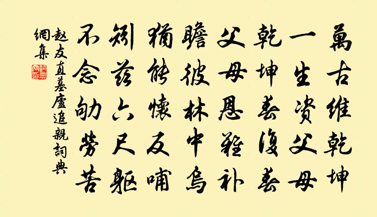 詩詞名句歷史字典書法欣賞書法字典國語詞典說文解字康熙字典古漢語字典標 題 作 者 詩 句 墓廬追親作者:趙友直 朝代:宋代墓廬追親原文萬古維乾坤,一生資父母。乾坤春復春,父母恩難補。瞻彼林中烏,猶能懷反哺。矧茲六尺軀,不念劬勞苦。詩詞問答問:墓廬追親的作者是誰?答:趙友直問:墓廬追親寫於哪個朝代?答:宋代趙友直墓廬追親書法欣賞墓廬追親書法作品詩詞推薦同劉季游登天柱岡四首楊萬里〔宋代〕穿青度碧白雲中,山正奇時路忽窮。引道老農辭我去,與君更上最高峰。行香子王詵〔宋代〕金井先秋,梧葉飄黃。幾回驚覺夢初長。雨微煙淡。疏雨池塘。漸蓼花明,菱花冷,藕花涼。幽人已慣,枕單衾冷初春置酒河上得前忠武記室饒廷評書因成感詠宋庠〔宋代〕故歡清潩上,今醉濁河邊。素領添新髮,春風似去年。暖雲邙北樹,芳草鞏陰田。感舊情何極,重看記室版。七夕仇遠〔宋代〕歲歲今宵乞巧樓,疏星如弈月如鉤。莫將寒信侵房屋,肯把閒情問女牛。兒笑無書空曬腹,婦言有酒可澆愁。鵲慵入澤王河口梅堯臣〔宋代〕遠水路已別,古汊未窮源。定知前山雨,瀑泳至且渾。暗生秋草下,稍復夏潦痕。更去待月上,猶應可到門。和王弱翁七首彭龜年〔宋代〕霜螯百鎰重,人世一身多。我意已悽慘,如君風味何。泊舟無錫雨止遂游惠山楊萬里〔宋代〕天教老子不空回,船泊山根雨頓開。歸去江西人問我,也曾一到惠山來。重陽日寄浙東諸從事李郢〔唐代〕野人多病門長掩,荒圃重陽菊自開。愁里又聞清笛怨,望中難見白衣來。元瑜正及從軍樂,甯戚誰憐叩角哀。紅旆華亭百詠蓮巢許尚〔宋代〕記得荷香里,蛾眉唱採蓮。千年龜欲總,不見葉田田。送楊康功守蘇秦觀〔宋代〕公於萬事輕,獨嗜山水重。寓直西掖垣,滄洲長入夢。廣陵一都會,廚酒萬斯瓮。每嘆闕登臨,持此將焉用。比持飛龍篇曹植〔魏晉〕晨游泰山。雲霧窈窕。忽逢二童。顏色鮮好。乘彼白鹿。手翳芝草。我知真人。長跪問道。西登玉台。金樓復道。乙巳十月朔開爐三首范成大〔宋代〕石湖今日開爐,兩壁仍安畫圖。萬事篆煙曲幾,百年毳衲團蒲。酬樂天書懷見寄元稹〔唐代〕新昌北門外,與君從此分。街衢走車馬,塵土不見君。君為分手歸,我行行不息。我上秦嶺南,君直樞星北。秦嶺駐馬坡羅必元〔宋代〕一登偉觀眇山河,下有將軍駐馬坡。不是胸中兵十萬,長江天險誤人多。次韻馬少伊、郁舜舉寄示同游石湖詩卷七首范成大〔宋代〕蕪城老蘚不知春,忽有柴門月色新。芝草琅玕無鎖鑰,自無超俗扣門人。句李良臣〔宋代〕似是兄弟姓則殊。重到惠山李紳〔唐代〕碧峰依舊松筠老,重得經過已白頭。俱是海天黃葉信,兩逢霜節菊花秋。望中白鶴憐歸翼,行處青苔恨昔游。還向贈胡居士耿湋〔唐代〕孔融過五十,海內故人稀。相府恩猶在,知君未拂衣。減字木蘭花朱敦儒〔宋代〕年衰人老。矍鑠支離君莫笑。白日青天。我自心情勝少年。超凡入妙。遊戲神通隨意到。酒聖詩仙。舞棹虛空駕鐵擬行路難鮑照〔南北朝〕今年陽初花滿林。明年冬末雪盈岑。推移代謝紛交轉。我君邊戍獨稽沉。執袂分別已三載。邇來寂淹無分音。朝悲名句推薦唯見鴻雁飛,令人傷懷抱。高適《登百丈峰二首》 人攀明月不可得,月行卻與人相隨。李白《把酒問月·故人賈淳令予問之》 知者順時而謀,愚者逆理而動范曄《後漢書·列傳·朱馮虞鄭周列傳》 雲里帝城雙鳳闕,雨中春樹萬人家。王維《奉和聖制從蓬萊向興慶閣道中留春雨中春望之作應制》 溪雲初起日沉閣,山雨欲來風滿樓。許渾《鹹陽城東樓 / 鹹陽城西樓晚眺 / 西門》 年年歲歲望中秋,歲歲年年霧雨愁。曾幾《癸未八月十四日至十六夜月色皆佳》 十年無夢得還家,獨立青峰野水涯。謝枋得《武夷山中》 神女生涯原是夢,小姑居處本無郎。李商隱《無題·重幃深下莫愁堂》 良賈深藏若虛,君子盛德容貌若愚。司馬遷《史記·七十列傳·老子韓非列傳》 記得年時臨上馬,看人眼淚汪汪。如今不忍更思量。劉彤《臨江仙·千里長安名利客》