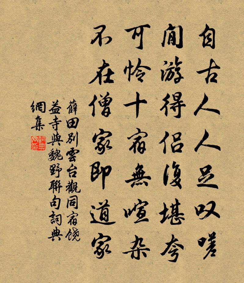 詩詞名句歷史字典書法欣賞書法字典國語詞典說文解字康熙字典古漢語字典標 題 作 者 詩 句 別雲台觀同宿饒益寺與魏野聯句作者:薛田 朝代:宋代原文自古人人足嘆嗟,閒游得侶復堪夸。可憐十宿無喧雜,不在僧家即道家。詩詞問答問:《別雲台觀同宿饒益寺與魏野聯句》的作者是誰?答:薛田問:該詩寫於哪個朝代?答:宋代書法欣賞別雲台觀同宿饒益寺與魏野聯句書法作品詩詞推薦秋日犍為道中(一作途中感懷)崔塗〔唐代〕久客厭岐路,出門吟且悲。平生未到處,落日獨行時。芳草不長綠,故人無重期。那堪更南渡,鄉國已天涯。高宗祀明堂前朝享太廟二十一首真宗〔宋代〕明哲煌煌,照臨無疆。丕承先志,嘉靖多方。朝延尊榮,民庶樂康。珍符來應,錫茲重光。維夫君兮桂舟一首送梁正受歸汶陽晁補之〔宋代〕維君兮桂舟,酌余酒兮攬君留。君何為兮此野,菊菲菲兮蜨下。韡韡兮煌煌,爛金敷兮襲余堂。茱萸兮芙蓉,眾芳雜曲歌辭。竹枝顧況〔唐代〕帝子蒼梧不復歸,洞庭葉下荊雲飛。巴人夜唱竹枝後,腸斷曉猿聲漸稀。春秋戰國門秦武陽周曇〔唐代〕丱歲徒聞有壯名,及令為副誤荊卿。是時環柱能相副,誰謂燕囚事不成。題歸雁圖徐照〔宋代〕浙水平天淨如掃,客雁飛來秋事早。短篷吹雪荻花風,影落深叢山欲曉。汀蕪無綠鮮飆香,一農聲影空瀟湘。有人答張籍因以代書白居易〔唐代〕憐君馬瘦衣裘薄,許到江東訪鄙夫。今日正閒天又暖,可能扶病暫來無?衛卿叔自青暘寄詩一卷以飲酒果核殽味烹茶齋葛立方〔宋代〕客居貧病醫無方,忍飢面作瞿曇黃。楓葉蕭蕭風陣長,東廂曝背資滄涼。鄰家有酒難偷嘗,草書正藉公孫娘。家家郡檄子肅檢視旱田以詩寄之趙蕃〔宋代〕是邦且熟無多收,況於水旱相為憂。使君奏課避非實,檄公按視臨田疇。民聞公來相告語,活國憂民公自許。平時東坡八首蘇軾〔宋代〕廢壘無人顧,頹垣滿蓬蒿。誰能捐筋力,歲晚有償勞。獨有孤旅人,天窮無所逃。端來拾瓦礫,歲旱土不膏。崎嶇寒食王禹偁〔宋代〕寒食江都郡,青旗賣楚醪。樓台藏綠柳,籬落露紅桃。妓女穿輕屐,笙歌泛小舠。史君慵不出,愁坐讀離騷。次韻張進彥見寄二首王之道〔宋代〕坐想雲煙走筆端,夜喔佳制老忘寒。一時思致追長慶,千載風流識建安。接武尚稽班玉筍,昂霄終合待金鑾。自憐德壽宮慶壽口號十篇楊萬里〔宋代〕天父晨興未出房,君王忍冷立風廊。忽然鳴蹕珠簾卷,萬歲聲傳震八荒。次韻碩夫池亭賞蓮李彌遜〔宋代〕胡床塵尾揮長柄,風和入坐花容靚。乍開還合晚照中,修竹佳人倚春暝。此間此景樂最深,世路好惡君酌斟。下車詠桃种放〔宋代〕習習香薰薄薄煙,杏遲梅早不同妍。山齋盡日無鸞□,只與幽人伴醉眠。送張仲山守唐安二首李流謙〔宋代〕六十專城發未斑,更於何地覓三山。不妨談笑催科里,正賴清涼熱惱間。到日紅梅留臘在,公餘翠榴酌春慳。胡床句邵伯溫〔宋代〕自昔充城號奧區,蜀人喚作小成都。偈頌一百二十三首釋普度〔宋代〕雨滌炎威,秋雲自在。一片兩片拄杖頭,或卷或舒林木外。白璧明珠,泥團土塊。放去收來顆顆圓,填溝塞壑無人布袋贊釋紹曇〔宋代〕馱布袋,握藤枝。一肚皮惡毒,好使你門知。轉腦回頭望阿誰,髯公知此意,冷笑賊風吹。伏波將軍廟林概〔宋代〕尉佗尺檄黃關閉,天欲亡秦盛漢家。一日將軍通戰棹,何曾五嶺限中華。名句推薦小知不可使謀事,小忠不可使主法。韓非及後人《韓非子·飾邪》 窮則獨善其身,達則兼善天下。孟子《孟子·盡心章句上·第九節》 君子能勤小物,故無大患。司馬光《資治通鑑·周紀·周紀一》 落日暴風雨,歸路繞汀灣蘇舜欽《水調歌頭·滄浪亭》 聖人之治民也,先治者強,先戰者勝。韓非及後人《韓非子·心度》 地冷葉先盡,谷寒雲不行。李白《冬日歸舊山》 今夕何夕,見此良人?佚名《綢繆》 衰柳寒蟬一片愁,誰肯教白衣送酒?盧摯《沉醉東風·重九》 綠萼添妝融寶炬,縞仙扶醉跨殘虹曹雪芹《詠紅梅花得“紅”字》 驚風飄白日,忽然歸西山曹植《贈徐幹詩》