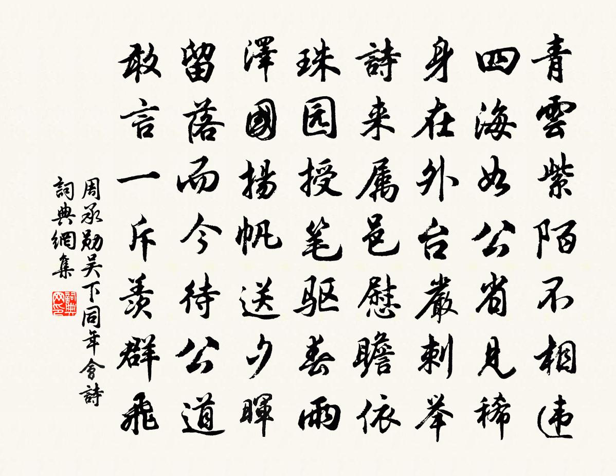 詩詞名句歷史字典書法欣賞書法字典國語詞典說文解字康熙字典古漢語字典標 題 作 者 詩 句 吳下同年會詩作者:周承勛 朝代:宋代吳下同年會詩原文青雲紫陌不相違,四海如公省見稀。身在外台嚴刺舉,詩來屬邑慰瞻依。珠園授筆驅春雨,澤國揚帆送夕暉。留落而今待公道,敢言一斥羨群飛。詩詞問答問:吳下同年會詩的作者是誰?答:周承勛問:吳下同年會詩寫於哪個朝代?答:宋代周承勛吳下同年會詩書法欣賞吳下同年會詩書法作品詩詞推薦裝太和米綱徐似道〔宋代〕一鞭加爾膚,萬刃劃吾腹。就令猛於虎,何忍食子肉。世無冷鑊湯,邑盡活地獄。頌十玄談一色釋印肅〔宋代〕鷺鶿立雪非同色,鏡裹色空誰間隔。不是青黃黑白紅,上下東西及南北。為樂提刑壽二首衛涇〔宋代〕繡衣持斧按蠻荊,三見門弧喜氣盈。孟子能令棠粟發,不疑更使漢刑平。好將兩手摩銅狄,長對三秋正玉衡。聞道寄楊茂卿校書姚合〔唐代〕去年別君時,同宿黎陽城。黃河凍欲合,船入冰罅行。君為使滑州,我來西入京。丈夫不泣別,旁人嘆無情。到京琴友李呂〔宋代〕金玉聲清圓,鸞鳳勢翔舞。重是古人風,勿效兒女語。次韻知郡安撫九日南樓宴集范成大〔宋代〕斯民鄒魯更豐年,雅道淒涼見此賢。萬隴登禾新霽色,千村鳴柝舊寒煙。鏘金絕世詩情妙,倚劍凌空隸墨鮮。珍重讀《杜工部集》二首貫休〔唐代〕造化拾無遺,唯應杜甫詩。豈非玄域橐,奪得古人旗。日月精華薄,山川氣概卑。古今吟不盡,惆悵不同時。甫也送許壽下第歸東山李頻〔唐代〕吾君設禮闈,誰合學忘機。卻是高人起,難為下第歸。出關心縱野,避世事終稀。莫更今秋夕,相思望少微。東平官舍汪元量〔宋代〕曉鞭驛馬入東州,瘦骨稜嶒怯素秋。天地不仁人去國,江山如待客登樓。市沽魯酒難為醉,座咽胡笳易得愁。日暮題灞西駱隱居許渾〔唐代〕志凌三蜀客,心愛五湖人。拚死酒中老,謀生書外貧。掃花眠石榻,搗藥轉溪輪。往往乘黃牸,鹿裘烏角巾。與二弟過溪至廣教蘭若梅堯臣〔宋代〕溪水今尚淺,涉馬不及韉。岸口出近郭,野徑通平田。行行渡小橋,決決響細泉。萬木蔭古殿,一燈明象筵。長廊衢州近城果園楊萬里〔宋代〕未到衢州五里時,果林一望蔽江湄。黃柑綠橘深紅柿,樹樹無風縋脫枝。送元錫、楊凌韋應物〔唐代〕荒林翳山郭,積水成秋晦。端居意自違,況別親與愛。歡筵慊未足,離燈悄已對。還當掩郡閣,佇君方此會。見樂天詩元稹〔唐代〕通州到日日平西,江館無人虎印泥。忽向破檐殘漏處,見君詩在柱心題。宮詞宋白〔宋代〕樓前宣赦制金雞,大禮新成彩仗歸。萬歲聲高天地喜,慶雲飛上袞龍衣。寄王承可朱翌〔宋代〕籍甚王郎子,揚州一再逢。至今清夜夢,猶在笑談中。想見芙蓉句,空懷楊柳風。著鞭來不晚,聲價動諸公。送餘姚知縣陳最寺丞謝絳〔宋代〕愧君來款關,話別憩林間。不待風銷暑,聊因酒發顏。滄洲即欲往,清躅暫容攀。居者羨行者,寄聲思越山。臨江仙(贈賀子忱二侍妾二首)王之望〔宋代〕霓作衣裳冰作在,鉛華不涴天真。臨風幾待逐行雲。自從留得住,不肯系仙裙。對客揮毫驚滿座,銀鉤蠆尾爭新。題曲水閣劉述〔宋代〕面勢俯岩隈,雕軒映水開。雲從棟間出,人自鑒中來。櫂楫歌聲度,漸裳禊事迥。東山如未起,好住小蓬萊。九日侍宴應制崔國輔〔唐代〕運偶千年聖,時傳九日神。堯樽列鐘鼓,漢闕辟鉤陳。金籙三清降,瓊筵五老巡。始驚蘭佩出,復詠柏梁新。雲雁名句推薦臣子恨,何時滅!駕長車,踏破賀蘭山缺。岳飛《滿江紅·寫懷》 臨難不顧生,身死魂飛揚阮籍《詠懷其五十三》 飲馬渡秋水,水寒風似刀。王昌齡《塞下曲四首》 百王之無變,足以為道貫。一廢一起,應之以貫,理貫不亂。不知貫,不知應變。荀子《荀子·天論》 半夜倚喬松,不覺滿衣雪。孟郊《苦寒吟》 寒食後,酒醒卻咨嗟。蘇軾《望江南·超然台作》 沅水通波接武岡,送君不覺有離傷。王昌齡《送柴侍御》 是法平等無有高下。鳩摩羅什譯《金剛經·淨心行善》 法莫如顯,而術不欲見韓非及後人《韓非子·難三》 無邊落木蕭蕭下,不盡長江滾滾來。杜甫《登高》