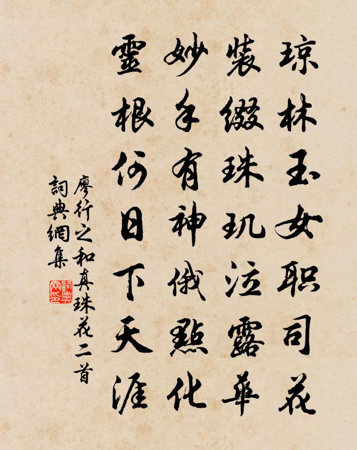 詩詞名句歷史字典書法欣賞書法字典國語詞典說文解字康熙字典古漢語字典標 題 作 者 詩 句 和真珠花二首作者:廖行之 朝代:宋代和真珠花二首原文瓊林玉女職司花,裝綴珠璣泣露華。妙手有神俄點化,靈根何日下天涯。詩詞問答問:和真珠花二首的作者是誰?答:廖行之問:和真珠花二首寫於哪個朝代?答:宋代廖行之和真珠花二首書法欣賞和真珠花二首書法作品詩詞推薦白須蒲壽宬〔宋代〕月照當襟雪,終剪施摩詰。我作白須行,而得養生術。郡中即事白居易〔唐代〕漫漫潮初平,熙熙春日至。空闊遠江山,晴明好天氣。外有適意物,中無繫心事。數篇對竹吟,一杯望雲醉。行攜登嵩山十首 醒心泉蘇轍〔宋代〕上山苦饑渴,中道得寒泉。舉瓢石竇響,入口煩痾痊。洑流去不見,落澗聲鏘然。莫歸復相值,相從下平川。丙申重九前後得今日都無病一句成十首方回〔宋代〕今日都無病,重陽酒滿樽。淺斟聊慰意,高枕恐消魂。杜老萸難得,陶家菊尚存。鄰人送糕果,遙憶小兒孫。出東城門見牧牛曾豐〔宋代〕出逢春客放牛天,浩嘆微官久自纏。回首未能收白牯,歸家猶可養烏犍。增新曲相對聯句何遜〔南北朝〕酒闌日隱樹。上客請調弦。嬌人挾瑟至。逶迤未肯前。舊愛今何在。新聲徒自憐。有曲無人聽。徙倚高樓前。徘徊滿庭芳劉克莊〔宋代〕涼月如冰,素濤翻雪,人世依約三更。扁舟乘興,莫計水雲程。忽到一洲奇絕,花無數、多不知名。渾疑是,芙蓉踏雲行 赴劉公齋馬鈺〔元代〕玉液瓊漿,調和玉屑。便教玉案堆冰雪。須憑玉杖作良工。捍成玉餅輕輕疊。驀聽金聲,金刀細切。金爐裡面烹無新城塔山對雨二首一晁補之〔宋代〕山外圓天一鏡開,山頭雲起似浮埃。松吟竹舞水紋亂,坐見溪南風雨來。游峨眉十一首馮時行〔宋代〕緬想如天遠,由來路不賒。快穿靈運屐,徑造普賢家。仰睇雲霄遠,回觀錦繡華。老難持淨戒,細細酌流霞。長信怨王昌齡〔唐代〕奉帚平明金殿開,暫將團扇暫徘徊。玉顏不及寒鴉色,猶帶昭陽日影來。任氏行白居易〔唐代〕燕脂漠漠桃花淺,青黛微微柳葉新。北山晚步衛宗武〔宋代〕遠岫煙光合,天寒欲斂昏。棲鴉依古木,歸艇入前村。岸隔山藏寺,潮生水到門。川原渾似舊,並立暗銷魂。句元絳〔宋代〕花陰轉午清風細,玉燕釵頭艾虎輕。新栽竹白居易〔唐代〕佐邑意不適,閉門秋草生。何以娛野性?種竹百餘莖。見此溪上色,憶得山中情。有時公事暇,盡日繞欄行。勿言高宗祀明堂前朝享太廟二十一首真宗〔宋代〕昭哉皇祖,駿發其祥。雕戈圭瓚,盛烈載揚。天錫寮符,分熾而昌。神聖應期,赫然垂光。酬李侍御書記秋夕雨中病假見寄孟郊〔唐代〕秋風繞衰柳,遠客聞雨聲。重茲阻良夕,孤坐唯積誠。果枉移疾詠,中含嘉慮明。洗滌煩濁盡,視聽昭曠生。未覺次韻夏日洪咨夔〔宋代〕乍晴雲更黑,頓冷日如青。飽飯真成蠹,幽居又見螢。燈光翻露柱,琴疊舞黃庭。猛作逃儒去,沉酣幾個醒。郊行遣興釋文珦〔宋代〕節序易推遷,行行感暮年。麥雲黃冒隴,柳浪綠浮川。倦鳥猶知返,飄蓬最可憐。故鄉無舊業,何計賦歸田。廣明初都人語佚名〔唐代〕黃賊打黑賊。名句推薦夕陽牛背無人臥,帶得寒鴉兩兩歸。張舜民《村居·水繞陂田竹繞籬》 白雲江上故鄉,月下風前吟處。子蘭《秋日思舊山》 前村後壟桑柘深,東鄰西舍無相侵。貫休《春晚書山家屋壁二首》 騮馬新跨白玉鞍,戰罷沙場月色寒。王昌齡《出塞二首》 所向泥活活,思君令人瘦。杜甫《九日寄岑參》 暗柳啼鴉,單衣佇立,小簾朱戶。周邦彥《瑣窗寒·寒食》 馬嘶經戰地,雕認打圍山。王鎡《塞上曲》 一年將盡夜,萬里未歸人。戴叔倫《除夜宿石頭驛》 烹羊宰牛且為樂,會須一飲三百杯。李白《將進酒》 聖人恃道化而不恃智巧。列子及其弟子《列子·說符》