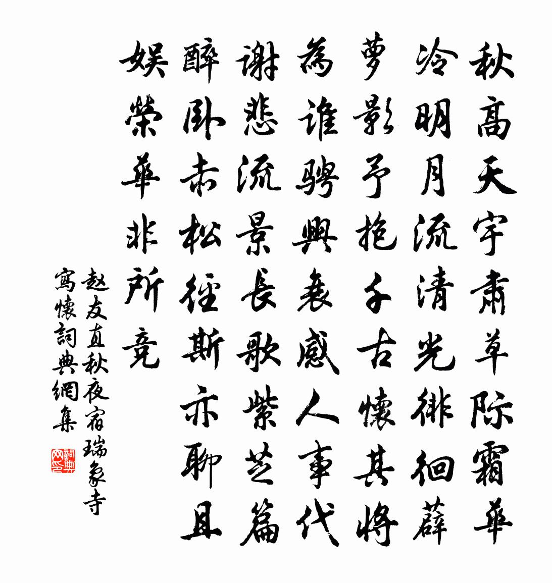 詩詞名句歷史字典書法欣賞書法字典國語詞典說文解字康熙字典古漢語字典標 題 作 者 詩 句 秋夜宿瑞象寺寫懷作者:趙友直 朝代:宋代秋夜宿瑞象寺寫懷原文秋高天宇肅,草際霜華冷。明月流清光,徘徊薜蘿影。予抱千古懷,其將為誰騁。興衰感人事,代謝悲流景。長歌紫芝篇,醉臥赤松徑。斯亦聊且娛,榮華非所競。詩詞問答問:秋夜宿瑞象寺寫懷的作者是誰?答:趙友直問:秋夜宿瑞象寺寫懷寫於哪個朝代?答:宋代趙友直秋夜宿瑞象寺寫懷書法欣賞秋夜宿瑞象寺寫懷書法作品詩詞推薦又次申教授直宿三首傅察〔宋代〕皎皎虛堂帶月清,金風入律露華明。潘郎寓直生秋興,韓子長歌憶短檠,驚鵲繞枝巢未穩,幽蟲臨砌隱餘聲。卻嫌南柯子侯善淵〔元代〕不曉身中寶,寧知物外篇。不通真教亂狂顛。指望蓬萊,仰臥摸青天。欲識鉛中汞,須知汞里鉛。兩般顛倒自如然金菊對芙蓉(重陽)辛棄疾〔宋代〕遠水生光,遙山聳翠,霽煙深鎖梧桐。正零瀼玉露,淡盪金風。東籬菊有黃花吐,對映水、幾簇芙蓉。重陽佳致,句陶弼〔宋代〕荔枝林下千金絡,菡萏池中十畫船。送王天常太祝詩強至〔宋代〕雨洗春枝冷,鶯愁晚更啼。感時雙淚落,送客片帆西。淮隰逢鴒羽,京塵縱馬蹄。有才無殿課,安穩步通閨。席間詠琴客崔珏〔唐代〕七條弦上五音寒,此藝知音自古難。唯有河南房次律,始終憐得董庭蘭。四明月胡仲弓〔宋代〕夏月如循吏,見乾皆懽顏。當此列日余,和氣一夜還。龔黃久不作,元在青雲間。欲往從之游,天高恐難攀。題伯時畫觀魚僧黃庭堅〔宋代〕橫波一網腥城市,日暮江空煙水寒。當時萬事心已死,猶恐魚作故時看。頌古十九首釋慧暉〔宋代〕非男女相獨閒閒,正體堂堂孰可攀。一句不傳千聖眼,九天風靜月彎彎。莆門陳東野輓詞戴栩〔宋代〕碧海雲邊為小隱,暮年世味等空濛。笑看朝友題銜闊,愛共鄰翁話歲豐。書述南軒兒自注,詩參東野字應同。一丘道裝吟邵雍〔宋代〕道家儀用此巾衣,師外曾聞更拜誰。何故堯夫須用拜,安知人不是吾師。次韻吉老十小詩黃庭堅〔宋代〕佳人斗南北,美酒玉東西。夢鹿分真鹿,無雞應木雞。句張耒〔宋代〕淮山二十里,秀色已在戶。舟車走梁宋,煙樹引吳楚。送文甫兄歸番陽二首馬廷鸞〔宋代〕少小追隨子佩表,如今相視鬢絲橫。式相好矣天倫重,歸去來兮世念輕。目送飛鴻雲縹緲,身憐病鶴影伶仃。聖恩朝中措(壽章君舉)洪咨夔〔宋代〕滂葩七十二灘春。鍾瑞石麒麟。流水行雲才思,光風霽月精神。金蕉進酒,斑衣起舞,喜氣津津。群玉峰頭環珮,書懷四首胡宏〔宋代〕含笑花開洲上,忘憂草發台邊。底事當憂莫忘,忘時便是無天。雜詩二十七首曹勛〔宋代〕方塘倒影青天淨,幽么生 * 蔭濃。春去得閒觀物化,吹涼醒睡喜支筇。次韻陶節推問疾項安世〔宋代〕酒病詩狂失已多,之人未棄肯來過。悔將蟲篆疲鎪刻,旋講熊經學按摩。容我力湔盧駱體,與君同赴閔顏科。瑤琴寓天台水南四首林憲〔宋代〕夔皋不著書,周召不決科。端坐廟堂上,四海臻泰和。此道固如是,後來文藝多。嗒然空山中,獨抱明良歌。白鷺李嘉祐〔唐代〕江南淥水多,顧影逗輕波。落日秦雲里,山高奈若何。名句推薦無奈朝來寒雨,晚來風。李煜《相見歡·林花謝了春紅》 因思杜陵夢,鳧雁滿回塘。溫庭筠《商山早行》 遊人日暮相將去,醒醉喧譁。歐陽修《採桑子·清明上巳西湖好》 烽火連三月,家書抵萬金。杜甫《春望》 知人者智,自知者明。老子《老子·道經·第三十三章》 回看射鵰處,千里暮雲平。王維《觀獵》 天將降大任於是人也,必先苦其心志,勞其筋骨,餓其體膚,空乏其身,行拂亂其所為。孟子《孟子·告子章句下·第十五節》 燕歸花謝,早因循、又過清明。納蘭性德《紅窗月·燕歸花謝》 造物無言卻有情,每於寒盡覺春生。張維屏《新雷》 蘭溪三日桃花雨,半夜鯉魚來上灘。戴叔倫《蘭溪棹歌》