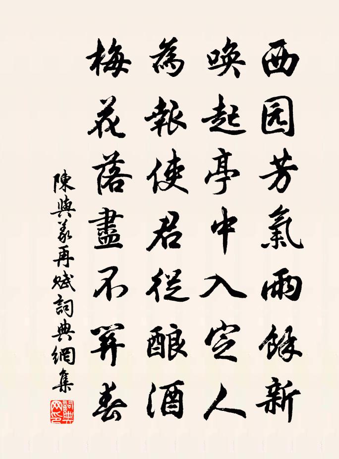 詩詞名句歷史字典書法欣賞書法字典國語詞典說文解字康熙字典古漢語字典標 題 作 者 詩 句 再賦作者:陳與義 朝代:宋代再賦原文西園芳氣雨余新,喚起亭中入定人。為報使君從釀酒,梅花落盡不關春。詩詞問答問:再賦的作者是誰?答:陳與義問:再賦寫於哪個朝代?答:宋代問:陳與義的名句有哪些?答:陳與義名句大全陳與義再賦書法欣賞再賦書法作品詩詞推薦探菊二首方回〔宋代〕心最憐渠旱菊苗,蕊青如粟間如椒。小勞汲井何妨事,有酒吾當著酒澆。贈杜鼎升張及〔宋代〕家本樊川老蜀都,世家冠劍豈寒儒。筆耕尚可儲三載,酒戰猶能敵百夫。僻愛舜琴湘水弄,每懸孫畫醉仙圖。孟光同永叔子聰游嵩山賦十二題其十二峻極寺梅堯臣〔宋代〕山高路已窮,倏爾逢蘭若。落日老僧閒,支頤古松下。緩步入禪庭,苔蒼但蕭灑。與王郎昆仲及兒子邁,遶城觀荷花,登峴山亭蘇軾〔宋代〕苕水如漢水,鱗鱗鴨頭青。吳興勝襄陽,萬瓦浮青冥。我非羊叔子,愧此峴山亭。悲傷意則同,歲月如流星。從我南柯子馬鈺〔元代〕無使名過實,常教實若虛。藏機隱密恰如愚。閒問心王,何處用功夫。性做長生寶,身為大藥爐。煉丹須要飲醍醐晨起雪作趙蕃〔宋代〕苦寒不成眠,哀哉何時旦。擁衣聽雞鳴,有類巢木鸛。窗明若彷彿,自起尋宿炭。殘爐星銷盡,束緼分鄰爨。頻年句歐陽彬〔唐代〕無錢將乞樊知客,名紙生毛不為通。桑柘殘陽里,兒孫落葉中。郊行即事程顥〔宋代〕芳原綠野恣行事,春入遙山碧四圍。興逐亂紅穿柳巷,困臨流水坐苔磯。莫辭盞酒十分勸,只恐風花一片飛。況是六月八日遷寓侍郎橋方回〔宋代〕梧桐樓外雨蕭蕭,客里遷居意不聊。淨土偶鄰羅漢洞,閒人肯羨侍郎橋。蠹魚書少家何窘,行李船輕路匪遙。此□長相思·其一李白〔唐代〕長相思,在長安。絡緯秋啼金井闌,微霜淒淒簟色寒。孤燈不明思欲絕,卷帷望月空長嘆。美人如花隔雲端!上有洞庭題詠十一首小湖寺王阮〔宋代〕去年禱雨旃檀林,慈雲賜我三日霖。今年包山小湖寺,更得因緣禮大士。小湖氣象似寶陁,怪石列岸騰嵯峨。近山妻初授邑號告身白居易〔唐代〕弘農舊縣授新封,鈿軸金泥誥一通。我轉官階常自愧,君加邑號有何功?花箋印了排窠濕,錦卷裝來耀手紅。倚得和士友傅勉之喜雨韻李曾伯〔宋代〕老生本不學軍旅,來護荊州國門戶。慚無善政格休徵,未能雨十與風五。今年甫幸登麥喜,入夏又以槁苗苦。驕陽蝶戀花晏殊〔宋代〕南雁依稀回側陣。雪霽牆陰,偏覺蘭牙嫩。中夜夢余消酒困。爐香卷穗燈生暈。急景流年都一瞬。往事前歡,未免讀潘郎文卷張耒〔宋代〕霜鬢我獨謫宦,蝟須子合封侯。老拙何勞咄咄,疏慵且復悠悠。韓奕佚名〔先秦〕奕奕梁山,維禹甸之,有倬其道。韓侯受命,王親命之,纘戎祖考,無廢朕命。夙夜匪解,虔共爾位,朕命不易。憶平泉山居,贈沈吏部一首(中書作)李德裕〔唐代〕昔聞羊叔子,茅屋在東渠。豈不念歸路,徘徊畏簡書。乃知軒冕客,自與田園疏。歿世有遺恨,精誠何所如。嗟予頌古五十三首釋文禮〔宋代〕南泉水牯忘鞭索,南北東西共一家。王稅及時都納了,牧童橫笛遠山斜。投王饒州日勤四首趙蕃〔宋代〕福星誰遣出虛危,帝念鄱人因數飢。試問公來若為政,皆言吏瘠與民肥。減字木蘭花(安人生日)張綱〔宋代〕思堂醇酎。滿酌金杯爭獻壽。記取年時。頭白成雙唱舊詞。莫言秋晚。五日小春 * 綻。折一枝來。綸誥金花要並名句推薦新葉初冉冉,初蕊新霏霏。謝朓《詠落梅》 吾生也有涯,而知也無涯。莊子《莊子·內篇·養生主原文》 聖人苟可以強國,不法其故;苟可以利民,不循其禮。商鞅《商君書·更法》 老人七十仍沽酒,千壺百瓮花門口。岑參《戲問花門酒家翁》 鳳凰台上鳳凰游,鳳去台空江自流。李白《登金陵鳳凰台》 朝來入庭樹,孤客最先聞。劉禹錫《秋風引》 碧野朱橋當日事,人不見,水空流。秦觀《江城子·西城楊柳弄春柔》 朝真暮偽何人辨,古往今來底事無。白居易《放言五首·其一》 圓荷浮小葉,細麥落輕花。杜甫《為農》 山荒聊可田,錢鎛還易辦。王守仁《謫居糧絕請學於農將田南山詠言寄懷》
