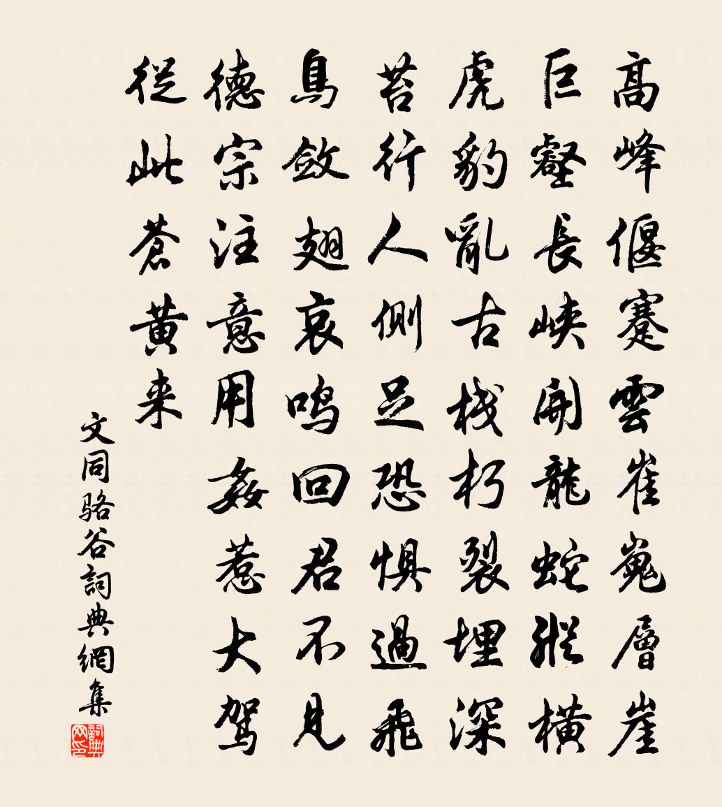 詩詞名句歷史字典書法欣賞書法字典國語詞典說文解字康熙字典古漢語字典標 題 作 者 詩 句 駱谷作者:文同 朝代:宋代駱谷原文高峰偃蹇雲崔嵬,層崖巨壑長峽開。龍蛇縱橫虎豹亂,古棧朽裂埋深苔。行人側足恐懼過,飛鳥斂翅哀鳴回。君不見德宗注意用奸惹,大駕從此蒼黃來。詩詞問答問:駱谷的作者是誰?答:文同問:駱谷寫於哪個朝代?答:宋代文同駱谷書法欣賞駱谷書法作品詩詞推薦見雪陳著〔宋代〕馮夷老手妙莊嚴,一色工夫一夜添。統卷山河還太極,平拋珠玉到窮閻。瘦吟相諗梅寒苦,渴飲何妨秫凍甜。黃竹相和歌辭。飲馬長城窟行王建〔唐代〕長城窟,長城窟邊多馬骨。古來此地無井泉,賴得秦家築城卒。征人飲馬愁不回,長城變作望鄉堆。蹄蹤未乾人去望海潮譚處端〔元代〕全真大道,無為清淨,重重障礙堪嗟。每嘆自緣,招且不免,閒遊雲水他*。無念謗誹邪。願人人早悟,急景浮華悟南柯 勸世尹志平〔元代〕著假求仙果,迷真覓佛心。*香禮拜恐徒尋。不斷無明,空惹業根深。苦口如良藥,忠言似美金。人逢善者作知音荊門病中寄懷鄉人歐陽侍郎彬齊己〔唐代〕誰會荊州一老夫,夢勞神役憶匡廬。碧雲雁影紛紛去,黃葉蟾聲漸漸無。口淡莫分餐氣味,身羸但覺病肌膚。可憐中和節賜百官燕集因示所懷李适〔唐代〕至化恆在宥,保和茲息人。推誠撫諸夏,與物長為春。仲月風景暖,禁城花柳新。芳時協金奏,賜宴同群臣。絲竹菩薩蠻趙長卿〔宋代〕新晴庭戶春陰薄。東風不度重簾幕。第幾小蘭房。雛鶯初弄黃。悄寒春未透。不解尋花柳。只恐漸春深。愁生求友超覽亭周牧〔宋代〕翠微深處著亭台,抖擻紅塵雙眼開。嵐影剩添杯色好,泉聲不帶市喧來。竹間啼鳥破山寂,天際孤舟界浪回。占斷送龔章判官之衛州·新及第司馬光〔宋代〕幾硯昔年游,於今成十秋。松堅終發石,魚變即辭流。近郡無飛檄,清時不借籌。淇園春竹美,軍宴日椎牛。松窗用杜句為韻和以棋酒為意十首曹勛〔宋代〕擣香復篩辣,兵廚瀉芳酒。天宇澄清瀾,山中寄聲否。壽范漕吳泳〔宋代〕福星一點夜堂深,藻泮花泉共照臨。歌詠春風曾點瑟,體當生意宓君琴。喬松已作參天色,寸草猶持報主心。但翼淮河舟中曉起看雪二首楊萬里〔宋代〕梅花腦子撒成雲,明月珠胎屑作塵。愛水舞來飛就影,怯風斜去卻回身。真成一臘逢三白,並把三冬慱一春。開放禽言十詠郭公姚勉〔宋代〕郭公古時仁國余,姓名尚掛春秋書。問其故國何丘墟,知善不用惡不除。今人皆知笑亡郭,胸中亦自鏡善惡。不知寄王補之王安石〔宋代〕平居相值晚,況復道塗留。今我思揮麈,逢君為艤舟。人情方慕貴,吾道合歸休。吏責真難塞,聊為泮水游。點絳唇 送董彥才西上王惲〔元代〕楊柳青青,玉門關外三千里。秦山渭水。未是消魂地。坦臥東床,恐減風雲氣。功名際。願君著意。莫*春閨淚。夜合花孫惟信〔宋代〕風葉敲窗,露蛩吟瓮,謝娘庭院秋宵。鳳屏半掩,釵花映燭紅搖。潤玉暖,膩雲嬌。染芳情、香透鮫綃。斷魂留夢白石道者棲於洪岩以石為糧先朝敬愛之賜予之吳芾〔宋代〕高僧隱青山,宴坐咀白石。不知幾何年,人猶訪遺蹟。顧我頑鈍姿,但知能肉食。回首仰高風,捫心有慚色。和子瞻東陽水樂亭歌蘇轍〔宋代〕君不見武安前堂立曲旃,官高得厚多憂患。又不見夏侯好妓貧無力,簾箔為衣人莫識。兩人操行雖不同,辛苦經營鵲橋仙劉一止〔宋代〕春風真箇,取將花去,酬我清陰滿院。名園清晝漏簽遲,未肯負、酒朋歌伴。使君情在,暮雲合處,臥看碧峰峨弁春女怨蔣維翰〔唐代〕白玉堂前一樹梅,今朝忽見數花開。兒家門戶尋常閉,春色因何入得來。名句推薦父母教,須敬聽。父母責,須順承。李毓秀《弟子規·入則孝》 喜得故人同待詔,擬沽春酒醉京華。高啟《清明呈館中諸公》 子規啼徹四更時,起視蠶稠怕葉稀。謝枋得《蠶婦吟》 君知妾有夫,贈妾雙明珠。張籍《節婦吟·寄東平李司空師道》 風雨牢愁無著處,那更寒蛩四壁。文天祥《酹江月·和友驛中言別》 月兒彎彎照九州,幾家歡樂幾家愁。佚名《月兒彎彎照九州》 強龍不壓地頭蛇。吳承恩《西遊記·第四十五回》 亂石穿空,驚濤拍岸,捲起千堆雪。蘇軾《念奴嬌·赤壁懷古》 莫買沃洲山,時人已知處。劉長卿《送方外上人/送上人》 形相雖惡而心術善,無害為君子也。荀子《荀子·非相》