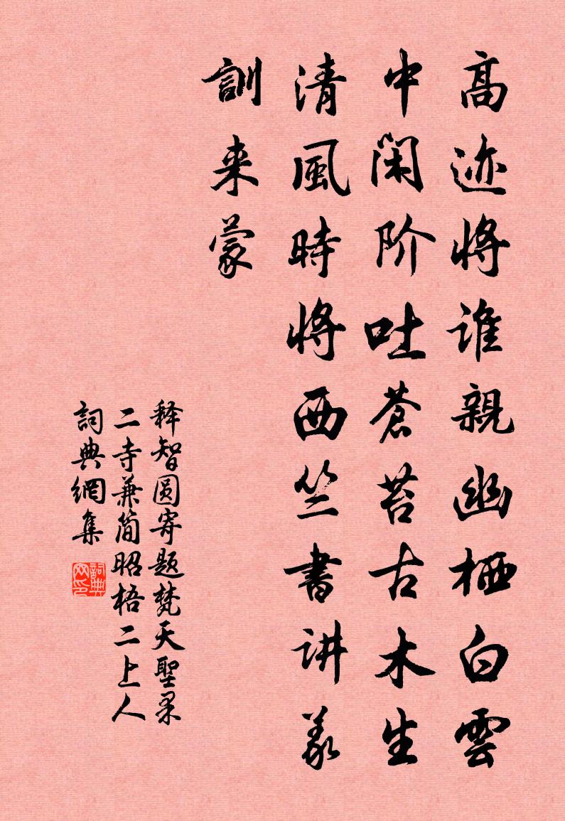 詩詞名句歷史字典書法欣賞書法字典國語詞典說文解字康熙字典古漢語字典標 題 作 者 詩 句 寄題梵天聖果二寺兼簡昭梧二上人作者:釋智圓 朝代:宋代原文高跡將誰親,幽棲白雲中。閒階吐蒼苔,古木生清風。時將西竺書,講義訓來蒙。詩詞問答問:《寄題梵天聖果二寺兼簡昭梧二上人》的作者是誰?答:釋智圓問:該詩寫於哪個朝代?答:宋代書法欣賞寄題梵天聖果二寺兼簡昭梧二上人書法作品詩詞推薦經武功舊宅韋應物〔唐代〕茲邑昔所游,嘉會常在目。歷載俄二九,始往今來復。戚戚居人少,茫茫野田綠。風雨經舊墟,毀垣迷往躅。門臨別陶副使歸南海王昌齡〔唐代〕南越歸人夢海樓,廣陵新月海亭秋。寶刀留贈長相憶,當取戈船萬戶侯。二蘇文登趨闕二帖贊岳珂〔宋代〕文字之祥,劂有原委。父師昆弟,以及諸子。文兮斜川,道兮潁水。以文貫道,一家濟美。施及翰林,特遊戲耳。秦門范增周曇〔唐代〕智士寧為暗主謨,范公曾不讀兵書。平生心力為誰盡,一事無成空背疽。詠蠶戴表元〔宋代〕物亦有仁者,蠶功不可量。將身甘鼎鑊,與世作衣裳。過棧蒼雲濕,登山白雪香。未知龍種似,猶與馬群妨。題李公麟山莊圖其四雲薌閣蘇轍〔宋代〕清溪便種稻,秋晚連雲熟。不待見新舂,西風薌自足。偈頌一百零四首釋紹曇〔宋代〕丈夫膝下有黃金,爭肯與他人作禮。須彌燈王,腳頭腳底。折丹桂元好問〔金代〕秋風秋露清秋節。秋雨過,秋香初發。二仙生日好秋天,氣節與、秋霜爭裂。秋宵開宴群仙列。秋娘唱、秋雲低遏句柴中行〔宋代〕想得彭園富春色。題滿氏申申亭王令〔宋代〕申申亭者名自誰,河東丈人身銘之。方其作亭自休息,固欲申暢名其題。雖然自奉頗幽樂,豈敢兼忽當世為。若日葛屨佚名〔先秦〕糾糾葛屨,可以履霜?摻摻女手,可以縫裳?要之襋之,好人服之。好人提提,宛然左辟,佩其象揥。維是褊心,與李文舉登夢野亭張耒〔宋代〕樽俎相逢散百憂,雖非吾 * 登樓。天邊雲送荊王雨,江上楓雕宋玉秋。華發不堪懷故國,清杯相與散牢愁。清談偈頌一百二十三首釋崇岳〔宋代〕傾盡寶山寶,全身入荒草。若是鳳凰兒,不向那邊討。仲春既晴復雨曾豐〔宋代〕東君無力破天慳,紅紫遭時得志難。多可幸然風借暖,少恩傷是雨遺寒。云云無謂鶯情沮,僕僕何之蝶意闌。爛賞夏日從子淵侄借茉莉一盆戴復古〔宋代〕舉眼驚如許,衰懷強自安。愛涼臨水坐,遣病借花看。物物同天地,人人各肺肝。從來涇與渭,混作一流難。初發彭城有感寄子瞻蘇轍〔宋代〕秋晴卷流潦,古汴日向乾。扁舟久不解,畏此行路難。此行亦不遠,世故方如山。我持一寸刃,巉絕何由刊。念昔春晚圃田道中三首晃沖之〔宋代〕灑酣馳馬笑彎弓,便擬長驅向虜中。但恐老儒無骨相,不堪劍履畫南宮。冬末自長沙游桂嶺留獻所知杜荀鶴〔唐代〕家隔重湖歸未期,更堪南去別深知。前程笑到山多處,上馬愁逢歲盡時。四海內無容足地,一生中有苦心詩。朱門謁韓祠陳知柔〔宋代〕斯文何罪竄南荒,來謁孤祠淚數行。恐有遺書藏壞壁,豈無哀賦吊沅湘。精神不受氛煙蔽,道義長涵日月光。西壁武昌銅劍歌(並敘)蘇軾〔宋代〕供奉官鄭文,嘗官於武昌。江岸裂,出古銅劍,文得之以遺余。冶鑄精巧,非鍛冶所成者。雨餘江清風卷沙,雷公名句推薦回日樓台非甲帳,去時冠劍是丁年溫庭筠《蘇武廟》 無有定法如來可說。鳩摩羅什譯《金剛經·無得無說》 相思本是無憑語,莫向花箋費淚行。晏幾道《鷓鴣天·醉拍春衫惜舊香》 詩言志,歌永言,聲依永,律和聲。佚名《尚書·虞書·舜典》 醉里秋波,夢中朝雨,都是醒時煩惱。時彥《青門飲·寄寵人》 公子南橋應盡興,將軍西第幾留賓。杜審言《春日京中有懷》 別後不知君遠近。觸目淒涼多少悶。歐陽修《玉樓春·別後不知君遠近》 憑君莫話封侯事,一將功成萬骨枯。曹松《己亥歲感事》 殊方日落玄猿哭,舊國霜前白雁來。杜甫《九日五首·其一》 秋陰時晴漸向暝,變一庭淒冷周邦彥《關河令·秋陰時晴漸向暝》