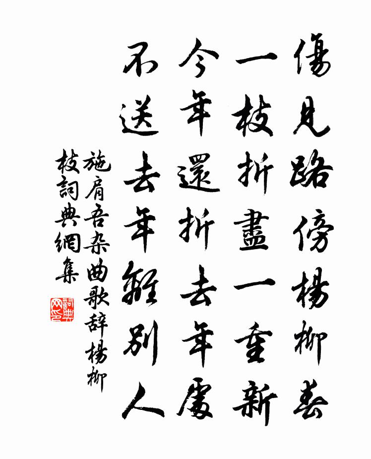 詩詞名句歷史字典書法欣賞書法字典國語詞典說文解字康熙字典古漢語字典標 題 作 者 詩 句 雜曲歌辭楊柳枝作者:施肩吾 朝代:唐代雜曲歌辭楊柳枝原文傷見路傍楊柳春,一枝折盡一重新。今年還折去年處,不送去年離別人。詩詞問答問:雜曲歌辭楊柳枝的作者是誰?答:施肩吾問:雜曲歌辭楊柳枝寫於哪個朝代?答:唐代問:雜曲歌辭楊柳枝是什麼體裁?答:樂府施肩吾雜曲歌辭楊柳枝書法欣賞雜曲歌辭楊柳枝書法作品注釋全唐詩:卷28_13詩詞推薦滿庭芳鄭達可〔宋代〕肥綻梅紅,嫩翻荷綠,微涼時起青萍。人間福艾,都屬老人星。累建高牙大纛,循良治、是處彬彬。棠陰里,豐碑感懷方岳〔宋代〕曩昔行藏已熟籌,最為一策是無求。看人面孔有何好,如此頭顱只麽休。草草園廬山北住,匆匆歲月水東流。莫因書劉景文所藏王子敬帖絕句蘇軾〔宋代〕家雞野鶩同登俎,春蚓秋蛇總入奩。君家兩行十二字,氣壓鄴侯三萬簽。送戴秀才李中〔唐代〕已是殊鄉客,送君重慘然。河橋乍分首,槐柳正鳴蟬。短棹離幽浦,孤帆觸遠煙。清朝重文物,變化莫遷延。用吳祠書正月晦韻洪咨夔〔宋代〕攬春群玉寫芳懷,次第安排到藥苔。但得斯文留脈在,須教我輩放眉開。疏風細雨桃花過,竹屋柴門燕子來。老去讀放翁詩作方回〔宋代〕放翁六十二,起家守嚴陵。三稔即只召,禮闈直青綾。虛翁四十九,外補當兵興。七稔始受代,萬死脫怨憎。放翁書林十景詩謝枋得〔宋代〕朔風吹折寒梅枝,嚴凝凍合彤雲痴。華峰幾立亘今古,堆累積聚皆昏迷。楊花飛舞盈三尺,蜨翅交加呈六了。朝陽送防秋將張籍〔唐代〕白首征西將,猶能射戟支。元戎選部曲,軍吏換旌旗。逐虜招降遠,開邊舊壘移。重收隴外地,應似漢家時。頌古五首釋原妙〔宋代〕閒放出這隻牛兒,頭角分明舉似誰。若向尾巴尖上會,新羅鷂子過多時。答崔載華戴叔倫〔唐代〕文案日成堆,愁眉拽不開。偷歸瓮間臥,逢個楚狂來。朝中措高士談〔元代〕琅琊山色最清雄。心賞待衰翁。路轉峰迴如畫,新亭半濕青紅。風流賓從,清閒歲月,且共從容。莫笑尊前老大,答鄭生歌佚名〔唐代〕溯青山兮江之隅,拖湘波兮褭綠裾。荷拳拳兮情未舒,匪同歸兮將焉如。冰玉堂林庚〔宋代〕柳凹放出一山來,堂闖秋壺恰剪裁。門冷和他公事少,吟清添我宦情灰。非無景物皆天與,只許梅花帶雪開。泉石用字謎王安石〔宋代〕一月又一月,兩月共半邊。上有可耕之田,下有長流之川。一家有六口,兩口不團圓。江南春陳與義〔宋代〕雨後江上綠,客悉隨眼新。桃花十里影,搖盪一江春。朝風迎船波浪惡,暮風送船無處泊。江南雖好不如歸,老藹丁督護曲趙文〔宋代〕丁督護,聽我語。欲從君,臂不羽。嫁時所結髮,剪之隨君去。西塞山懷古劉禹錫〔唐代〕王濬樓船下益州,金陵王氣黯然收。千尋鐵鎖沈江底,一片降幡出石頭。人世幾回傷往事?山形依舊枕寒流。從今東七寺方信孺〔宋代〕慈度天王更覺華,蒼龍東角梵王家。普慈化樂成塵土,興聖猶兼覺性夸。已亥雜詩 220龔自珍〔清代〕皇初任土乃作貢,卅七畝山可才眾。媼神笑予無貧法,丹徒陸生言可用。題四皓廟劉滄〔唐代〕石壁蒼苔翠靄濃,驅車商洛想遺蹤。天高猿叫向山月,露下鶴聲來廟松。葉墮陰岩疏薜荔,池經秋雨老芙蓉。雪髯名句推薦染柳煙濃,吹梅笛怨,春意知幾許。李清照《永遇樂·落日熔金》 清江一曲柳千條,二十年前舊板橋。劉禹錫《楊柳枝 / 柳枝詞》 為近都門多送別,長條折盡減春風。白居易《青門柳》 彩舟載得離愁動。無端更借樵風送。賀鑄《菩薩蠻·彩舟載得離愁動》 君子之道,暗然而日章;小人之道,的然而日亡。子思《中庸·第三十三章》 扁舟昨泊,危亭孤嘯,目斷閒雲千里。吳潛《鵲橋仙·扁舟昨泊》 流丸止於甌臾,流言止於知者。荀子《荀子·大略》 做弄得、酒醒天寒,空對一庭香雪。張炎《疏影·梅影》 羌笛何須怨楊柳,春風不度玉門關。王之渙《涼州詞二首·其一》 阿香秋夢起嬌啼,玉女傳幽素。吳文英《燭影搖紅·越上霖雨應禱》