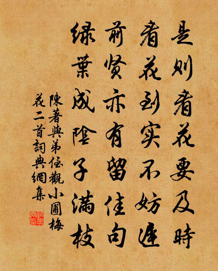 詩詞名句歷史字典書法欣賞書法字典國語詞典說文解字康熙字典古漢語字典標 題 作 者 詩 句 與弟侄觀小圃梅花二首作者:陳著 朝代:宋代與弟侄觀小圃梅花二首原文是則看花要及時,看花到實不妨遲。前賢亦有留佳句,綠葉成陰子滿枝。詩詞問答問:與弟侄觀小圃梅花二首的作者是誰?答:陳著問:與弟侄觀小圃梅花二首寫於哪個朝代?答:宋代陳著與弟侄觀小圃梅花二首書法欣賞與弟侄觀小圃梅花二首書法作品詩詞推薦念奴嬌(贈妓善作墨梅)辛棄疾〔宋代〕江南盡處,墮玉京仙子,絕塵英秀。彩筆風流,偏解寫、姑射冰姿清瘦。笑殺春工,細窺天巧,妙絕應難有。丹青寄坐夏僧項斯〔唐代〕坐夏日偏長,知師在律堂。多因束帶熱,更憶剃頭涼。苔色侵經架,松陰到簟床。還應煉詩句,借臥石池傍。紹興祭風師六首佚名〔宋代〕物之流形,甚畏瘥差。八風平矣,嘉生以遂。絲縷之積,有量斯幣。惟本之報,匪物之貴。時熱少客,因詠所懷白居易〔唐代〕冠櫛心多懶,逢迎興漸微。況當時熱甚,幸遇客來稀。濕灑池邊地,涼開竹下扉。露床青篾簟,風架白蕉衣。院靜中秋和姜主簿韻程公許〔宋代〕中秋月白古來慳,孤坐寒窗思黯然。懶近舞腰花十八,恨無珠履客三千。約潘丈及小喻登樓玉台觀木香酴醾陳宓〔宋代〕春前桃李謾紛紛,梅後冰標獨有君。莫將今日推明日,要看三分到七分。和丹岩入屋韻衛宗武〔宋代〕得廬莫恨太婆娑,繚以芳蘅葺以荷。徙舍借車家具少,架書充棟手編多。且甘窮巷飲瓢樂,須有文朋載酒過。他日端午帖子太上皇后閣周必大〔宋代〕水晶宮闕淨無塵,姑射神仙綽有真。寶錄自應表萬善,冰台安用結雙人。舟過橫塘有感劉宰〔宋代〕平波淺草橫塘路,曾挽扁舟沖急雨。朱顏綠鬢氣催嵬,欲斥九關揮玉女。萬古功我付汗青,九天光寵生門戶。邯鄲我愛淳安好陳曄〔宋代〕我愛淳安好,精能樂眾工。群羊亡飲豫,大武護功隆。推此心俱善,貤生石可礱。浮游博六子,裒手亦從風。青玉案 贈染何先生馬鈺〔元代〕無涯火院常籠罩。似醉夢,難分曉。賣弄惺惺非耍俏。爭財競氣,戀妻男,算到底,終須掉。譬似無常坑窖了。便再到小園見落花有感宋庠〔宋代〕雨餘春色太匆匆,已有殘英滿地紅。先落後開應定分,一般遲日一般風。次黃司戶紅糟韻四首項安世〔宋代〕主人廚中魚尾紅,把酒一笑相為容。燕脂煉就玉雪汁,琥珀光透琉璃鍾。酒酣萬事忽驚散,捽耳頓足歌年豐。連缸送棋客陸龜蒙〔唐代〕滿目山川似勢棋,況當秋雁正斜飛。金門若召羊玄保,賭取江東太守歸。楊知府贊釋智朋〔宋代〕丹成於太初之先,道濟乎後地之極。負勛名閥閱之寄,忘生長富貴之習。時行時止,無固無必。操須彌之筆,亦難梅花釋文珦〔宋代〕梅如姑射仙,桃李終難並。雪底暗傳香,泉邊孤照影。清聲聞麗譙,至味入鐘鼎。愛者雖繁多,知名獨和靖。隱顯淥羅晴晝古汴高士〔宋代〕第一岩前景若何,江流瀲灩漾晴羅。遊仙道士無縈擊,也共白雲棲一窩。對食有感陸游〔宋代〕杯酌以助氣,匕筋以充腹;沾醉與屬饜,其害等嗜欲。歠醨有餘歡,食淡百味足;養生所甚惡,旨酒及大肉。老翁贈宋小著四錫〔宋代〕紫皇御天方視事,將擇靈官補仙吏。金波古殿寒星簾,虹節蜺旌觀就試。白皙仙人皆雪衣,衣冠森列蟾蜍墀。寶盤中秋無月和曾儀吉制乾吳潛〔宋代〕見說瓊樓忒煞寒,雲衣特地護霄端。也應齒髮十分老,自是嫦娥一笑難。此夜不妨留客醉,明年未卜共誰看。歸與名句推薦酒債尋常行處有,人生七十古來稀。杜甫《曲江二首》 採蓮時,小娘紅粉對寒浪。溫庭筠《荷葉杯·鏡水夜來秋月》 今宵樓上一尊同。雲濕紗窗。辛棄疾《一剪梅·中秋元月》 吳王好劍客,百姓多創瘢;楚王好細腰,宮中多餓死。司馬光《資治通鑑·漢紀·漢紀三十八》 淇則有岸,隰則有泮。佚名《氓》 家有千口,主事一人。佚名《增廣賢文·下集》 恭敬不如從命。曹雪芹《紅樓夢·第六十二回》 林下春晴風漸和,高崖殘雪已無多。王守仁《春晴》 流芳未及歇,遺掛猶在壁。潘安《悼亡詩三首》 絕代有佳人,幽居在空谷。杜甫《佳人》