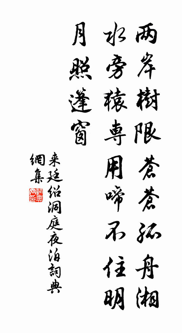 詩詞名句歷史字典書法欣賞書法字典國語詞典說文解字康熙字典古漢語字典標 題 作 者 詩 句 洞庭夜泊作者:來廷紹 朝代:宋代洞庭夜泊原文兩岸樹限蒼蒼,孤舟湘水旁。猿專用啼不住,明月照篷窗。詩詞問答問:洞庭夜泊的作者是誰?答:來廷紹問:洞庭夜泊寫於哪個朝代?答:宋代來廷紹洞庭夜泊書法欣賞洞庭夜泊書法作品詩詞推薦和姜邦傑春坊續麗人行楊萬里〔宋代〕玉人自惜如花面,不許黃鸝鸚鵡見。若令畫史識傾城,寫遍人間屏與扇。春光嬾困扶不起,吹殘玉笙也慵理。是誰題塵外亭洪皓〔宋代〕千歲歸來化鶴仙,作亭猶是舊山川。登臨迥出紅法外,笑傲仍居碧海邊。坐想三清元不遠,回觀五濁祗堪憐。鵬摶蔣洋道中望太姥山四首陳嘉言〔唐代〕絕巘雲霄外,嵯峨杳靄間。雲將山岫濕,鶴伴月華閒。流水溪溪靜,琪花樹樹殷。攀躋猶未得,清夢繞禪關。登嵩山十首 石徑蘇轍〔宋代〕蒼壁上參天,微徑隨流水。聱牙石齒亂,紛薄黃葉委。牽攀不得上,顛仆幾將止。勉強終此行,更老知難至。夏日嘆二首蘇籀〔宋代〕群空冀北食場稭,蹙踏崔嵬憩鶴台。泉石係心終眇邈,炎蒸爍體從恢胎。蒂懷寓眼勤呵咄,專氣怡神願力陪。公館夜行船高觀國〔宋代〕翦水天風吹醉醒。高樓外、凍雲愁凝。袖口香寒,歌喉春暖,不管雁邊寒緊。瓊屑瑤花飛碎影。應須待、玉田千頃西江月 平山堂蘇軾〔宋代〕三過平山堂下,半生彈指聲中。十年不見老仙翁。壁上龍蛇飛動。欲弔文章太守,仍歌楊柳春風。休言萬事轉頭空紹興中興上復古詩張嵲〔宋代〕天監我宋,受命以人。咋為亂階,以啟聖人。皇帝嗣位,其仁如春。萬邦欣載,共惟帝臣。垂衣高拱,惟務儉勤。聽航船歌十首方回〔宋代〕家住斜塘大戶邊,時荒米貴欠他錢。從此駕船歸不得,無錢且駕小航船。統漢峰下(一作過降戶至統漠烽)李益〔唐代〕統漢峰西降戶營,黃河戰骨擁長城。只今已勒燕然石,北地無人空月明。淳熙十二年加上太上皇帝太上皇后尊號十一首佚名〔宋代〕聖明太上,天子有尊。玉坐高拱,慈顏睟溫。震禁嘉承,朝弁昈分。盛禮縟典,邃古未聞。雜詠一百首蒙恬劉克莊〔宋代〕絕漠功雖大,長城怨亦深。但知傷地脈,不悟失人心。獻臣學士與余通書因成感詠宋庠〔宋代〕夫君班揚儔,抱槧群玉府。久讀未見書,躬抽擊年譜。墜緒獲先秦,亡篇出東魯。上泝三皇墳,旁探百家語。怪牒卓牌兒/卓牌子万俟詠〔宋代〕東風綠楊天,如畫出、清明院宇。玉艷淡泊,梨花帶月,胭脂零落,海棠經雨。單衣怯黃昏,人正在、珠簾笑語。題彭澤盧明府新樓張祜〔唐代〕碧落新樓迥,清池古樹閒。先賢盡為宰,空看縣南山。吳山仁王寺周弼〔宋代〕山寺憑高夕未昏,上皇曾此定乾坤。甌閩散驛緣江島,龕赭收潮入海門。細雨亂花唐輦道,淡煙疏柳漢營屯。何時北園登高即事呈諸同僚蔡襄〔宋代〕江雲寒薄不成霜,九月登高菊未黃。飛鏑有聲弓已力,小槽分溜酒初嘗。秋容行見丹楓老,竄意難勝紫陌長。曾是滿江紅 和吳此民送春韻張野〔元代〕九十韶光,驚又見、刺桐花落。春去也、愁人情緒,不禁離索。桃*霏霏紅雨暗,柳堤漠漠香綿薄。恨東風、一夜採桑子晏幾道〔宋代〕心期昨夜尋思遍,猶負殷勤。齊斗堆金,難買丹誠一寸真。須知枕上尊前意,占得長春。寄語東鄰,似此相看有幾寄韓玉璵二首董嗣杲〔宋代〕郭北下湖枕蒼綠,書屋奈此五月溽。涼台水榭自柳陰,獨斂修程困羈束。心心岩峰不得住,瀑聲縈迴夢不足。世故名句推薦愛人者人恆愛之,敬人者人恆敬之。孟子《孟子·離婁章句下·第二十八節》 秋風生渭水,落葉滿長安。賈島《憶江上吳處士》 日長唯鳥雀,春遠獨柴荊。杜甫《春遠 / 春運》 閒鷺棲常早,秋花落更遲。錢起《谷口書齋寄楊補闕》 賤禮義而貴勇力,貧則為盜,富則為賊。荀子《荀子·樂論》 犬吠水聲中,桃花帶露濃。李白《訪戴天山道士不遇》 身同而懼同,以其至畏而刑之,其人固屈。來俊臣《羅織經·問罪卷第十》 長江悲已滯,萬里念將歸。王勃《山中》 三湘愁鬢逢秋色,萬里歸心對月明。盧綸《晚次鄂州》 滿目山河增感慨,一時風景寄遨遊。姜塘《摘星樓九日登臨》