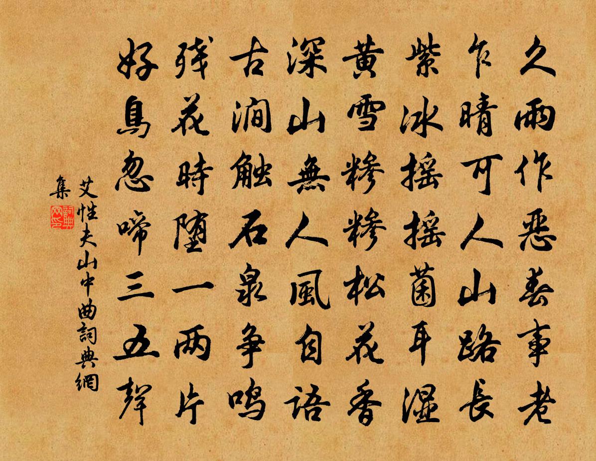 詩詞名句歷史字典書法欣賞書法字典國語詞典說文解字康熙字典古漢語字典標 題 作 者 詩 句 山中曲作者:艾性夫 朝代:宋代山中曲原文久雨作惡春事老,乍晴可人山路長。紫冰搖搖菌耳濕,黃雪糝糝松花香。深山無人風自語,古澗觸石泉爭鳴。殘花時墮一兩片,好鳥忽啼三五聲。詩詞問答問:山中曲的作者是誰?答:艾性夫問:山中曲寫於哪個朝代?答:宋代問:山中曲是什麼體裁?答:七古艾性夫山中曲書法欣賞山中曲書法作品詩詞推薦湘口送友人李頻〔唐代〕中流欲暮見湘煙,葦岸無窮接楚田。去雁遠沖雲夢雪,離人獨上洞庭船。風波盡日依山轉,星漢通霄向水連。零落題赤松鄭剛中〔宋代〕世謂仙易得,漢武吾所知。終老坐迷妄,海上求安期。世謂仙難得,二王等兒嬉。安期自來顧,一笑相與歸。難易送羅制參李流謙〔宋代〕平生願識韓,一見屣履迎。自揣何所持,徒有汗背驚。下士公盛德,事賢我真情。西南大幕府,控制七十城。自公乙卯端午十絕劉克莊〔宋代〕不喜追風驃,尤憎競渡船。寧為之反殿,怕著祖生先。醉後贈人白居易〔唐代〕香球趁拍迴環匼,花盞拋巡取次飛。自入春來未同醉,那能夜去獨先歸。曉過丹陽縣五首楊萬里〔宋代〕朝來稍敢出船門,霜熟依然冷逼人。刮地風來何處避,可憐岸筱猛回身。分得台字走筆胡仲弓〔宋代〕白雲最深處,屐齒破蒼苔。借榻尋僧話,攜樽領客來。禽聲喧竹塢,日影過花台。長嘯下山去,猶傾鑿落杯。閒中自詠陸游〔宋代〕小艇上時皆綠水,短筇到處即青山。二十四考中書令,不換先生半日閒。秋夜感遇十首以孤村一犬吠殘月幾人行為韻陸游〔宋代〕我夢遊異境,烏帽跨小蹇,桑麻夾阡陌,山川曠何遠!俗有太古風,蕭散到雞犬。鐘鳴忽驚覺,所造恨猶淺。石花洞石應孫〔宋代〕我試問陽和,洞間誰是主。盡日立東風,百花無一語。觀物丘葵〔宋代〕春蒲發華滋,潮漲失沙嘴。好風自西來,吹皺一江水。何的掉孤舟,撐入春浦裹。不見舟中人,一陣鷗飛起。見菊花呈諸名勝張九成〔宋代〕勿謂重陽把一枝,嗟予何限古人思。靈均自著離騷日,元亮長歌歸去時。未曉只疑猶泫露,開門忽見滿疏籬。要呼宿揚子津,寄潤州長山劉隱士孟浩然〔唐代〕所思在建業,欲往大江深。日夕望京口,煙波愁我心。心馳茅山洞,目極楓樹林。不見少微隱,星霜勞夜吟。雜記五言十首劉克莊〔宋代〕不必桮棬性,安能桎梏身。誰知千載下,有個葛天民。贈陳孝子庸梅堯臣〔宋代〕康州水邊龍母墳,草樹蒙蒙起風雨。五色五蛇時往來,野鼠不穴墳上土。嗟哉異類猶厚親,豈彼人兮忘恃怙。果生神弦范成大〔宋代〕雙娥一去三千秋,粉篁春淚凝古愁。神鼉悲鳴老龍怨,水為翻瀾云為留。素空逗露晚花泣,神官行水鱗僮濕。潮聲車螯二首王安石〔宋代〕車螯肉之羽,恃殼保厥身。自非身有求,不敢微啟唇。尚恐擉者得,泥沙常埋墂。往往湯火間,身盡殼空存。維海秋懷十首微雲淡河漢疏雨滴梧桐為韻楊冠卿〔宋代〕呼船下平湖,山如髻鬟瞰。物華逼搖落,水明天淡淡。中藏今古愁,歲月不可勘。為語羊征南,聲名本來暫。題傳記范成大〔宋代〕莫將彩筆寄朝雲,紅淚羅巾隔路塵。說與東風無限恨,倩風吹斷去年春。戲和舍弟船場探春二首黃庭堅〔宋代〕雨余禽語催天曉,月上梨花放夜闌。莫聽遊人待妍暖,十分傾酒對春寒。名句推薦天生我材必有用,千金散盡還復來。李白《將進酒》 古今有為之士,皆不輕為之士,鄉黨好事之人,必非曉事之人。王永彬《圍爐夜話·第一三七則》 日長唯鳥雀,春遠獨柴荊。杜甫《春遠 / 春運》 記少年、駿馬走韓盧,掀東郭。辛棄疾《滿江紅·和范先之雪》 治世不一道,便國不必法古。商鞅《商君書·更法》 五月天山雪,無花只有寒。李白《塞下曲六首·其一》 羅幕輕寒,燕子雙飛去。晏殊《蝶戀花·檻菊愁煙蘭泣露》 瞿塘嘈嘈十二灘,此中道路古來難。劉禹錫《竹枝詞九首·其七》 故園渺何處,歸思方悠哉。韋應物《聞雁》 悅其名而喪其實。尹文《尹文子·大道上》