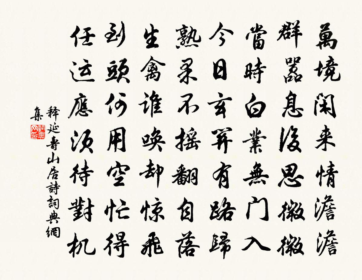 詩詞名句歷史字典書法欣賞書法字典國語詞典說文解字康熙字典古漢語字典標 題 作 者 詩 句 山居詩作者:釋延壽 朝代:宋代山居詩原文萬境閒來情澹澹,群囂息後思微微。當時白業無門入,今日玄關有路歸。熟果不搖翻自落,生禽誰喚卻驚飛,到頭何用空忙得,任運應須待對機。詩詞問答問:山居詩的作者是誰?答:釋延壽問:山居詩寫於哪個朝代?答:宋代釋延壽山居詩書法欣賞山居詩書法作品詩詞推薦梨嶺遇雨黃景說〔宋代〕黑風吹雨又黃昏,雞犬數處何處村。身在嶺雲飛處濕,不關別淚濺成痕。聲聲慢(梅)趙佶〔宋代〕欺寒沖暖,占早爭春,江梅已破南枝。向晚陰凝,偏宜映月臨池。天然瑩肌秀骨,笑等閒、桃李芳菲。勞夢想,似攝守漢陽次韻項平父餞行之句曹彥約〔宋代〕我計短於頭觸篷,公才高似目飛鴻。已馳騅馬雄西楚,尚引蜉蝣綴國風。願伯明年終惠我,以曹為解可無公。欲持自御史左授山陽丞魏求己〔唐代〕朝升照日檻,夕次下烏台。風竿一眇邈,月樹幾裴回。翼向高標斂,聲隨下調哀。懷燕首自白,非是為年催。絕句謝小邵寄柑脯晁說之〔宋代〕曲肖歐文詩隱秀,山頭仙馭勢爭飛。須知柑脯勝麟脯,更使荷衣笑錦衣。惜芳時 詠紫燕王哲〔元代〕我觀紫燕泥巢壘。便下卵、朝朝抱子。雛兒餵大辭窠起。背父母、分飛去離。為人養小還如爾。明知得、攀緣越熾夜遊宮(句景亭)張孝祥〔宋代〕聽話危亭句景。芳郊迥、草長川永。不待崇岡與峻岭。倚欄桿,望無窮,心已領。萬事浮雲影。最曠闊、鷺閒鷗靜北園雜詠陸游〔宋代〕西村林外起炊煙,南浦橋邊系釣船。樂歲家家俱自得,桃源未必是神仙。和王覺民簡褒山因上人棗嶺魏欣然二首王之道〔宋代〕君來逾半月,未果一尊同。湖水寒應碧,山梨雨自紅。何時過北牖,今日轉西風。相去無他地,孤城杖屨中。漢宮春黃公紹〔宋代〕身到瑤池。正□永芙蓉,跕素鸞飛。綠雲淡籠波面,鴛影差差。青冥世界,向龍宮、湧出江妃。凝望久,夜涼如水昌園葛紹體〔宋代〕昌園梅樹占山林,山淺村深煙日昏。薄暮東風幾籬落,雪濤隱約萬龍奔。致齋太一宮楊億〔宋代〕漢帝祈年館,威神法太微。赤章修祕祝,盤石拂仙衣。雉雊靈光發,鸞歌彩霧霏。霓旌飄夕吹,瑤草泛春暈。瓊悄走珠石方信孺〔宋代〕底事明珠解去來,當時合蒲已堪猜。賈胡不省何年事,老石江頭空綠苔。李無玷自左正言出守永州召為吏曹外郎尚阻敘李復〔宋代〕初伏青蒲拜皂囊,忽驅五馬下瀟湘。入承上合尚書牒,分掌中銓吏部郎。焚藁舊垣猶寂寞,拱樞列宿頓輝光。聞歸鹿伯可郎中園池雜詠竹塢樓鑰〔宋代〕幾年種竹未成叢,一日歸來翠掃空。盡好閉門高枕臣,從今日日是清風。自彭蠡湖初入江張九齡〔唐代〕江岫殊空闊,雲煙處處浮。上來群噪鳥,中去獨行舟。牢落誰相顧,逶迤日自愁。更將心問影,於役復何求。鷓鴣天張孝祥〔宋代〕月地雲階歡意闌。仙姿不合住人間。驂鸞已恨車塵遠,泣鳳空餘燭影殘。情脈脈,淚珊珊。梅花音信隔關山。只應次東坡先生蠟梅韻楊萬里〔宋代〕梅花已自不是花,永魂謪墮玊皇家。小不餐火更餐蠟,化作黃姑瞞造物。後山未覺坡先知,東坡勾引後山詩。金花采蘋佚名〔先秦〕於以采蘋?南澗之濱。於以采藻?於彼行潦。於以盛之?維筐及筥。於以湘之?維錡及釜。於以奠之?宗室牖下。予宿承德日夜苦霪雨擬金筌賦六韻呈陳居中李新〔宋代〕黑雲{外走內參}{外走內覃}陳巋麓,女媧補天伴天哭。結愁起坐函丈間,祠禴除門繡黃犢。書冊入眼萬花纈,名句推薦小樓昨夜又東風,故國不堪回首月明中。李煜《虞美人·春花秋月何時了》 各照隅隙,鮮觀衢路。姚察、姚思廉《梁書·列傳·卷五十》 最愛蘆花經雨後,一蓬煙火飯魚船。林逋《詠秋江》 孤鴻號外野,翔鳥鳴北林。阮籍《詠懷八十二首·其一》 大禹理百川,兒啼不窺家李白《公無渡河》 欲知卻老延齡藥,百草摧時始起花。蘇軾《趙昌寒菊》 想文君望久,倚竹愁生步羅襪。姜夔《八歸·湘中送胡德華》 和羞走,倚門回首,卻把青梅嗅。李清照《點絳唇·蹴罷鞦韆》 嗟余聽鼓應官去,走馬蘭台類轉蓬。李商隱《無題·昨夜星辰昨夜風》 同來望月人何處?風景依稀似去年。趙嘏《江樓舊感 / 江樓感舊》