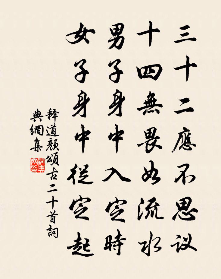 詩詞名句歷史字典書法欣賞書法字典國語詞典說文解字康熙字典古漢語字典標 題 作 者 詩 句 頌古二十首作者:釋道顏 朝代:宋代頌古二十首原文三十二應不思議,十四無畏如流水。男子身中入定時,女子身中從定起。詩詞問答問:頌古二十首的作者是誰?答:釋道顏問:頌古二十首寫於哪個朝代?答:宋代釋道顏頌古二十首書法欣賞頌古二十首書法作品詩詞推薦造袁州浮橋語釋印肅〔宋代〕普庵教化修浮橋,信心自肯大豐饒。解脫皆因不思議,度人無量永趙遙。秀江千古源何極,非乾今日與明朝。一生挽山居劉侯官王義山〔宋代〕雪坡仙去又山居,凋謝堪為世道悲。師魯僅存遺集在,樂天無限故人思。追懷把酒論文日,忍讀停雲對雨詩。千里送無為宰趙渙冰仲王之道〔宋代〕百里寄一令,於民為最親。休戚咳唾間,詎可非其人。趙侯古循吏,當世無等倫。朅來宰濡須,舊政俱更新。雖無聞祥應廟優戲甚盛二首劉克莊〔宋代〕空巷無人盡出嬉,燭光過似放燈時。山中一老眠初覺,棚上諸君鬧未知。游女歸來墜一珥,鄰翁看罷感牽絲。可憐送僧元暠東遊劉禹錫〔唐代〕寶書翻譯學初成,振錫如飛白足輕。彭澤因家凡幾世,靈山預會是前生。傳燈已悟無為理,濡露猶懷罔極情。從此州將和丁內翰寄題延州龍圖新開柳湖五闋宋祁〔宋代〕昔人楊柳詠依依,曾與征夫說戍期。看盡春條君莫嘆,湖邊雨雪是歸時。和姚令威春陰四絕王之望〔宋代〕休對風光感物華,且將春酒趁春賒。一聲杜宇芳菲晚,只有荼蘼芍藥花。逍遙詠宋太宗〔宋代〕神丹妙道故延年,豈是凡流識大仙。老子尚猶能諱事,軒皇不許亂相傳。誰知造化功夫力,罕見今生度宿緣。猛虎六友詩寄林景雲留壽國林道初俞季淵高友劉黻〔宋代〕高友住山中,無心涉塵圃。山中有明月,明月照棲鷺。幽人眠不成,披衣起閒步。相得靜無際,勿訝秦官污。禪人並化主寫真求贊釋正覺〔宋代〕精神矍爍,化工模邈。我轉一機,誰持六鑒。是非生奪璧之謀,黑白戰爛柯之著。霽闊而河橫,潭空而月落。留題江亭釋紹嵩〔宋代〕晚涼閒步向江亭,山色偏於晚有情。采索平時牆婉娩,飛花滿眼句縱橫。五峰遙拱千岩秀,四水縈紆十里程。鵲噪南唐伶人獻先主詞佚名〔宋代〕惟願普天多瑞慶,柳條結絮鵝雙生。送汲鵬賈島〔唐代〕淮南臥理後,復逢君姓汲。文采非尋常,志願期卓立。深江東泛舟,夕陽眺原隰。夏夜言詩會,往往追不及。自武義入松陽道中三首項安世〔宋代〕四十里欄縈一線,上侵雲物下驚湍。我行竹客源頭路,蜀道青天不作難。浣溪沙 集句石孝友〔宋代〕宿醉離愁慢髻鬟。綠殘紅豆憶前歡。錦江春水寄書難。紅袖時籠金鴨暖,小樓吹徹玉笙寒。為誰和淚倚闌乾。水調歌頭周紫芝〔宋代〕落日在煙樹,雲水兩空濛。澹霞消盡,何事依約有微紅。湖上晚來風細,吹盡一天殘雨,蒼翠濕千峰。誰遣長空月暮秋揚子江寄孟浩然劉昚虛〔唐代〕木葉紛紛下,東南日煙霜。林山相晚暮,天海空青蒼。暝色況復久,秋聲亦何長。孤舟兼微月,獨夜仍越鄉。寒笛奉使契丹二十八首 次莫州通判劉涇韻二首蘇轍〔宋代〕北國亦知岐有夷,何嘗烽火報驚危。擁亶絕漠聞嘉語,緩帶臨邊出好詩。約我一樽迎嗣歲,待君三館已多時。從今壽母生朝四首項安世〔宋代〕蓀襦蘭佩擁萱階,綠髮朱顏照酒杯。九十九洲春色里,老人星動壽筵開。和仲固春日村居即事十二絕胡寅〔宋代〕仙居何異武陵溪,泛出殘紅春水肥。擬欲泝流兼載酒,應容艇子傍苔磯。名句推薦萬里寒光生積雪,三邊曙色動危旌。祖詠《望薊門》 天下稍安,尤須兢慎,若便驕逸,必至喪敗。吳兢《貞觀政要·卷一·論政體》 一日官軍收海服,驅牛駕車食牛肉,歸來攸得牛兩角。元稹《田家詞 / 田家行》 鵝鴨不知春去盡,爭隨流水趁桃花。晁沖之《春日·陰陰溪曲綠交加》 童子解吟長恨曲,胡兒能唱琵琶篇。李忱《吊白居易》 言以足志,文以足言。左丘明《左傳·襄公·襄公二十五年》 小山重疊金明滅,鬢雲欲度香腮雪。溫庭筠《菩薩蠻·小山重疊金明滅》 富貴必從勤苦得,男兒須讀五車書。杜甫《柏學士茅屋》 十年離亂後,長大一相逢。李益《喜見外弟又言別》 閒雲潭影日悠悠,物換星移幾度秋。王勃《滕王閣序》