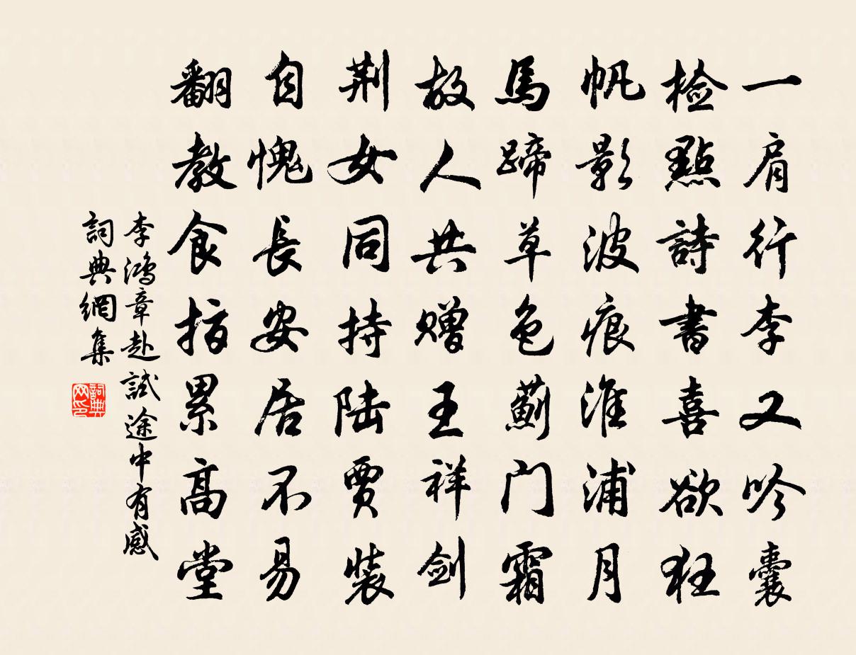詩詞名句歷史字典書法欣賞書法字典國語詞典說文解字康熙字典古漢語字典標 題 作 者 詩 句 赴試途中有感作者:李鴻章 朝代:清代赴試途中有感原文一肩行李又吟囊,檢點詩書喜欲狂。帆影波痕淮浦月,馬蹄草色薊門霜。故人共贈王祥劍,荊女同持陸賈裝。自愧長安居不易,翻教食指累高堂。詩詞問答問:赴試途中有感的作者是誰?答:李鴻章問:赴試途中有感寫於哪個朝代?答:清代問:赴試途中有感是什麼體裁?答:七律李鴻章赴試途中有感書法欣賞赴試途中有感書法作品詩詞推薦趙德安輓詩魏了翁〔宋代〕甲甲露布告誅曦,丙戌巴台已磔禧。或謂祿嬃非漢患,誰知田李遺唐危。安州得禍聞人說,荊莫上功惟我知。三十隆興天子七月十三日親享太廟先期風雨彌日及曹勛〔宋代〕萬騎如雲下太清,至尊親享在天靈。才聞初獻風雷息,皎皎涼蟾數點星。長思仙侯善淵〔元代〕道無邊。性光圓。認得龜蛇兩下纏。陰陽合地天。汞和鉛。氣神全。光迸流霞耀晃然。方知玄又玄。荊閫偶成李曾伯〔宋代〕一出嶠南道,重來國北門。詞源因老涸,心鑒以憂昏。可厭惟官事,難忘是主恩。衷懷誰共語,流得枕過痕。西江月佚名〔宋代〕要識真鉛汞,都來只一根源。烹前火候妙中玄。不是知音難辨。採取莫差時日,仍分弦後弦前。玉爐一霎火燒天。三昧諸頌釋印肅〔宋代〕空色無邊際,離垢摩尼圓。能依實相用,助發有龍天。松柏歌先秦無名〔先秦〕松邪柏邪。住建共者客邪。餞別王十一南遊劉長卿〔唐代〕望君煙水闊,揮手淚沾巾。飛鳥沒何處,青山空向人。長江一帆遠,落日五湖春。誰見汀洲上,相思愁白苹。竹任希夷〔宋代〕挺挺霜中節,沉沉日下陰。試裁蒼玉管,吹作紫鸞音。白石枕錢起〔唐代〕琢珉勝水碧,所貴素且貞。曾無白圭玷,不作浮磬鳴。捧來太陽前,一片新冰清。沈沈風憲地,待爾秋已至。璞堅小金山胡朝潁〔宋代〕天光雲影碧相涵,百頃玻璃一望間。綠水繞門迷客渡,白雲終日伴僧閒。疏鍾破曉潛虬動,老木成陰倦鳥還。喚取念奴嬌 白蓮用仲殊韻張野〔元代〕水風清暑,記平湖十里,寒生紈素。羅襪塵輕雲冉冉,彷佛凌波仙女。雪艷明秋瓊肌沁露,香滿西陵浦。蘭舟一葉雲泉吟釋文珦〔宋代〕此心長是愛雲泉,平澹相親六十年。縱使流歸滄海去,清聲只在屋頭邊。和人雜詠六首衛宗武〔宋代〕窮秋菊薦香,小春格破萼。時卉互芳菲,榮悴異今昨。憶昔競芳妍,徵逐困吟酌。老去厭浮華,雅志在林壑。奉和中書舍人賈至早朝大明宮岑參〔唐代〕雞鳴紫陌曙光寒,鶯囀皇州春色闌。金闕曉鍾開萬戶,玉階仙仗擁千官。花迎劍佩星初落,柳拂旌旗露未乾。獨有崇德道中張鎡〔宋代〕疎籬遮竹竹難遮。臥向溪流一桁斜。綠底睡鳧應自愛,起來搖翅各成花。瑤台散天花詞三首白玉蟾〔宋代〕諸天彩女一雙雙,十二樓前並捧香。太乙真人乘白鶴,雲中端簡候虛皇。句晃逈〔宋代〕三台八座九品官,名目不同而已矣。游下岩崇封院程公許〔宋代〕石扉深鎖一龕雲,未必人間只履存。持缽欲尋劉道者,鏌鋣不住刻舟痕。過林和靖祠顧逢〔宋代〕入得梅村去,煙雲鎖廢祠。我來遲幾日,花已過多時。童鶴看如活,山川變不知。遊人休著句,不比暗香詩。名句推薦明日隔山嶽,世事兩茫茫。杜甫《贈衛八處士》 夫尚賢者,政之本也。墨子《墨子·08章 尚賢(上)》 向來冰雪凝嚴地,力斡春回竟是誰?陸游《落梅》 偷彈清淚寄煙波,見江頭故人,為言憔悴如許。袁去華《劍器近·夜來雨》 北斗七星高,哥舒夜帶刀。西鄙人《哥舒歌》 過盡千帆皆不是,斜暉脈脈水悠悠。溫庭筠《望江南·梳洗罷》 媼引濃妝女,兒扶爛醉翁。范成大《寒食郊行書事》 遮莫圓明似前度,不知誰續廣寒游。慧霖《閏中秋玩月》 年年戰骨埋荒外,空見蒲桃入漢家。李頎《古從軍行》 百草千花寒食路,香車系在誰家樹。馮延巳《鵲踏枝·幾日行云何處去》