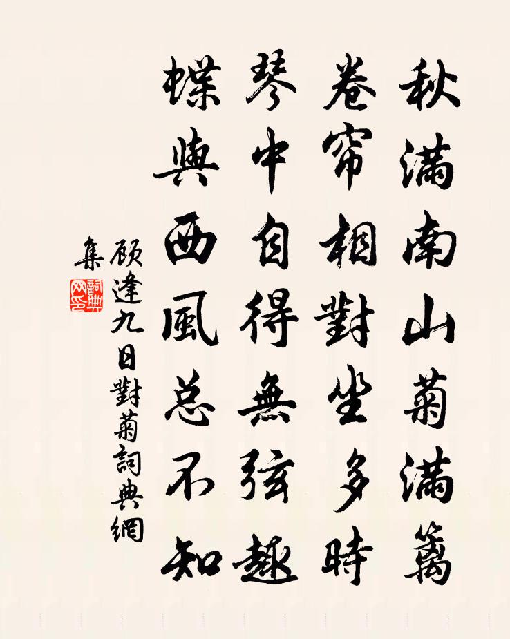 詩詞名句歷史字典書法欣賞書法字典國語詞典說文解字康熙字典古漢語字典標 題 作 者 詩 句 九日對菊作者:顧逢 朝代:宋代九日對菊原文秋滿南山菊滿籬,捲簾相對坐多時。琴中自得無弦趣,蝶與西風總不知。詩詞問答問:九日對菊的作者是誰?答:顧逢問:九日對菊寫於哪個朝代?答:宋代顧逢九日對菊書法欣賞九日對菊書法作品詩詞推薦寄司馬山人十二韻杜甫〔唐代〕關內昔分袂,天邊今轉蓬。驅馳不可說,談笑偶然同。道術曾留意,先生早擊蒙。家家迎薊子,處處識壺公。長嘯再用韻十首楊公遠〔宋代〕村深林密處,路向小橋分。屋老誅茅葺,腸枯借酒醺。廢興隨反掌,富貴等浮雲。近更澆漓甚,傷懷不忍聞。【雙調】清江引_笑靨兒盈盈喬吉〔元代〕笑靨兒盈盈斬女瘢嬌艷滿,偏稱燈前玩。歌喉夜正闌,酒力春將半,喜入臉窩紅玉暖。破花顏粉窩兒深更小,助喜道間池亭小酌劉學箕〔宋代〕一曲芳池萬柄荷,游鯈潛躣水揚波。竹孫楹風偏細,梅子江湖雨正多。凡物寓進俱意得,謂予不飲柰愁何。暫來徒卜運算元沈端節〔宋代〕烘手熨笙簧,呵凍勻酥面。閒向梅花樹下行,拜月遙相見。何處托春心,樂府流深怨。卻拈寒窗傍綺疏,恨極東風句陳瓘〔宋代〕看花出約幾時回。論語絕句一百首張九成〔宋代〕朽固難雕糞莫杇,於予材美亦何誅。欲令顧此深為戒,言語之科首宰予。送章發運楶李復〔宋代〕鄉農不寓兵,經費半非古。天下雖無事,禁虣必備武。浚郊開王畿,屹然根本固。鉤陳擁帝居,百萬環貔虎。軍聲挽姚政遠劉宰〔宋代〕尚記僑居憶故園,俄聞華屋聾榱椽。連牆大舶回前浦,皓齒清歌出廣筵。得喪已齊身外物,安閒自樂性中天。岳莊曲江獨行(自此後在翰林時作)白居易〔唐代〕獨來獨去何人識,廄馬朝衣野客心。閒愛無風水邊坐,楊花不動樹陰陰。和子由寄題孔平仲草庵次韻蘇軾〔宋代〕逢人慾覓安心法,到處先為問道庵。盧子不須從若士,蓋公當自過曹參。羨君美玉經三火,笑我枯桑困八蠶。猶喜次韻除伯源程式九日閒居追和淵明王之道〔宋代〕閒居遇重九,對酒懷陶生。陶生不可見,愛此重九名。清霜肅時令,天宇增高明。依依遠山色,隱隱賓鴻聲。泛酒道士步虛詞 八庾信〔南北朝〕北闕臨玄水。南宮生絳雲。龍泥印玉策。大火煉真文。上元風雨散。中天歌吹分。靈駕千尋上。空香萬里聞。念奴嬌(上德安王文甫生辰)石孝友〔宋代〕麥秋天氣,正玉杓斡暑,熏弦鳴律。浴佛生朝初過也,還數佳辰三日。筮水呈祥,夢熊葉慶,寶運符千一。太平朝永豐疫癘事佛人多死陳普〔宋代〕斗邑軍余種未芽,斂形還葬復千車。天行底事無差擇,偏入長齋禮佛家。即席次必強六絕句李新〔宋代〕暖霧團雲晚氣酣,柅車游女密於蠶。錦城行樂忘歸客,家在魚鳧碧水南。壓沙寺梨花黃庭堅〔宋代〕壓沙寺後千株雪,長樂坊前十里香。寄語春風莫吹盡,夜深留與雪爭光。寄上鄙句之明日,舟次梅口,南枝已有春意,范成大〔宋代〕晏溫解船去,暮夜檥船歇。橫斜隘梅村,玉蓓粲將發。城中三輔豪,指日承明謁。高懷妙康濟,未試君前笏。周南湘潭道中即事二首劉克莊〔宋代〕敗絮龍鍾擁病身,十分寒事在湘濱。若非野店黏官曆,不記今朝是立春。偈六十三首釋道寧〔宋代〕要行更行,要住即住。翻身踏破太虛空,推倒妙峰無影樹。古佛位中留不住,夜來和雨宿寒溪。名句推薦兵戈既未息,兒童盡東征。杜甫《羌村三首·其三》 世事浮云何足問,不如高臥且加餐。王維《酌酒與裴迪》 已駕七香車,心心待曉霞。李商隱《壬申七夕》 奸邪之輩,即平地亦起風波,豈知神鬼有靈,不肯聽其顛倒。王永彬《圍爐夜話·第二二則》 雪似梅花,梅花似雪。呂本中《踏莎行·雪似梅花》 紅葉晚蕭蕭,長亭酒一瓢。許渾《秋日赴闕題潼關驛樓 / 行次潼關逢魏扶東歸》 黃蘆掩映清江下,斜纜著釣魚艖。關漢卿《大德歌·冬景》 湖光秋月兩相和,潭面無風鏡未磨。劉禹錫《望洞庭》 想當年,金戈鐵馬,氣吞萬里如虎。辛棄疾《永遇樂·京口北固亭懷古》 天秋木葉下,月冷莎雞悲。李白《秋思》