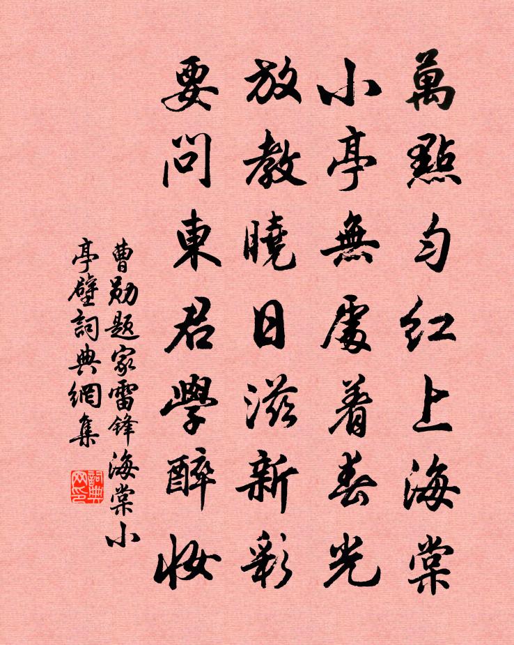 詩詞名句歷史字典書法欣賞書法字典國語詞典說文解字康熙字典古漢語字典標 題 作 者 詩 句 題家雷鋒海棠小亭壁作者:曹勛 朝代:宋代題家雷鋒海棠小亭壁原文萬點勻紅上海棠,小亭無處著春光。放教曉日滋新彩,要問東君學醉妝。詩詞問答問:題家雷鋒海棠小亭壁的作者是誰?答:曹勛問:題家雷鋒海棠小亭壁寫於哪個朝代?答:宋代曹勛題家雷鋒海棠小亭壁書法欣賞題家雷鋒海棠小亭壁書法作品詩詞推薦曉發嚴瀨舟中和戴步振韻史彌寧〔宋代〕子陵灘下放船開,老我經行知幾回。別岩舂鋤殊解事,沖煙冉冉送詩來。宿橫溪橋華岳〔宋代〕夜宿橫溪煙靄間,眉頭歸路萬山攢。連天麥浪波千頃,撲地楊花雪一團。余鏹不供春後醖,夾衾猶怯夜來寒。征夫虞美人(詠水葓花)張鎡〔宋代〕妝濃未試芙蓉臉。卻扇涼猶淺。粉輕紅裊一生嬌。風外細香時伴、濕雲飄。雙飛屬玉來還去。誰識幽閒趣。莫教疏自用韻再賦海棠舒岳祥〔宋代〕含羞滄海畔,移種蜀江乾。對此花枝重,不應詩語寒。半開須與醉,足睡更來看。說與花神道,當筵莫放殘。松江舟中四首荷葉浦時有不測末句故及之戴復古〔宋代〕垂虹五百步,太湖三萬頃。除卻岳陽樓,天下無此景。范蠡挾西施,功名付煙艇。支提禪寺徐夢發〔宋代〕來謁支提古道場,幾年袍錦韻猶香。芙蓉夢裡僧趺坐,檐蔔林中佛放光。禪語了參一宿覺,塵緣頓悟半生忙。若分南柯子/南歌子陳舜翁〔宋代〕德祖家珍熟,錢塘五月中。碧梧桐蓋翠筠籠。傾向水晶盤內、斗嘗空。絳粟成團小,清甜笑蜜濃。微酸猶解慘人容滿江紅(送王實之)劉克莊〔宋代〕天壤王郎,數人物、方今第一。談笑里、風霆驚座,雲煙生筆。落落元龍湖海氣,琅琅董相天人策。問如何、十載酹江月侯善淵〔元代〕茅庵瀟灑,靜無塵、獨坐垂簾孤僻。鎮日閒閒清澹泊,別有恬然活計。握固存真,心無雜念,忘我兼忘世。玉嬰神禪人並化主寫真求贊釋正覺〔宋代〕靜以應繁,沖以待喧。騏驥之姿,千里之奔。雲夢之量, * 之吞。斲輪之工兮擬誰授克家之學,抱瓮之朴兮將自次張昌化合溪新亭韻劉過〔宋代〕燕尾溪流上下分,中餘里許地翻平。林疏邑屋高低見,水漲航船來往輕。坡老已仙誰傑作,詩人為縣得重評。唐山送何水部蒙出牧袁州宋綬〔宋代〕梧楸初謝楚天涼,親見腰間換印囊。漁浦霧濃沈疊鼓,湓江風急下危檣。帝城雲表瞻龍首,故國星邊認劍光。退食題凌歊台莊革〔宋代〕姑孰溪邊霜葉飛,凌歊台上暮雲歸。謫仙一去不復返,悵望青山空翠微。故致政提刑少卿方公輓詞韓元吉〔宋代〕籌策沾榮譽最賢,青雲回步接英躔。請纓莫遂終軍志,投紱方期衛武年。原隰觀風頻玉節,省台聯秩近甘泉。一舟戲贈牛女舒岳祥〔宋代〕擲果久憐潘岳好,投梭不入幼輿痴。彩雲似扇羞郎面,新月如弓學婦眉。喜鵲成橋終有別,陽烏出海且教遲。如何緣識宋太宗〔宋代〕逢春酒一杯,百卉向陽開。梨花看似梅,光揚迎日彩。嫩柳引清風,黃鳥聲吹台。減字木蘭花朱敦儒〔宋代〕尋花攜李。紅漾輕舟汀柳外。小簇春山。溪雨岩雲不飽帆。相逢心醉。容易堆盤銀燭淚。痛飲何言。犀箸敲殘玉酒合肥懷古三首吳資〔宋代〕合肥一都會,世號征戰地。我來值明時,不識兵革事。代書寄淨明道人吳則禮〔宋代〕淨明端可人,日用一僧缽。覓句殊未休,平生箇中活。眷我梁宋游,茗碗屢澆潑。淮南霜露寒,轉柁何由達。讀柴桑集余觀復〔宋代〕游心太古初,得句萬物表。平生一樽酒,寂寞三逕小。有琴不張弦,正以知音少。伊予挹殘芳,道心炯相照。北窗名句推薦社下燒錢鼓似雷,日斜扶得醉翁回。范成大《春日田園雜興》 官之友,民之敵;親之友,仇之敵,敵者無常也。來俊臣《羅織經·瓜蔓卷第十二》 雲外好呼南去雁,系書先為報江鄉。齊之鸞《九日登清水營城》 上馬擊狂胡,下馬草軍書。陸游《觀大散關圖有感》 池上柳依依,柳邊人掩扉。左緯《春晚》 正是江南好風景,落花時節又逢君。杜甫《江南逢李龜年》 世事洞明皆學問,人情練達即文章。曹雪芹《紅樓夢·第五回》 昔孟母,擇鄰處。子不學,斷機杼。王應麟《三字經·全文》 第四橋邊,擬共天隨住。姜夔《點絳唇·丁未冬過吳松作》 萬壑樹參天,千山響杜鵑。王維《送梓州李使君》