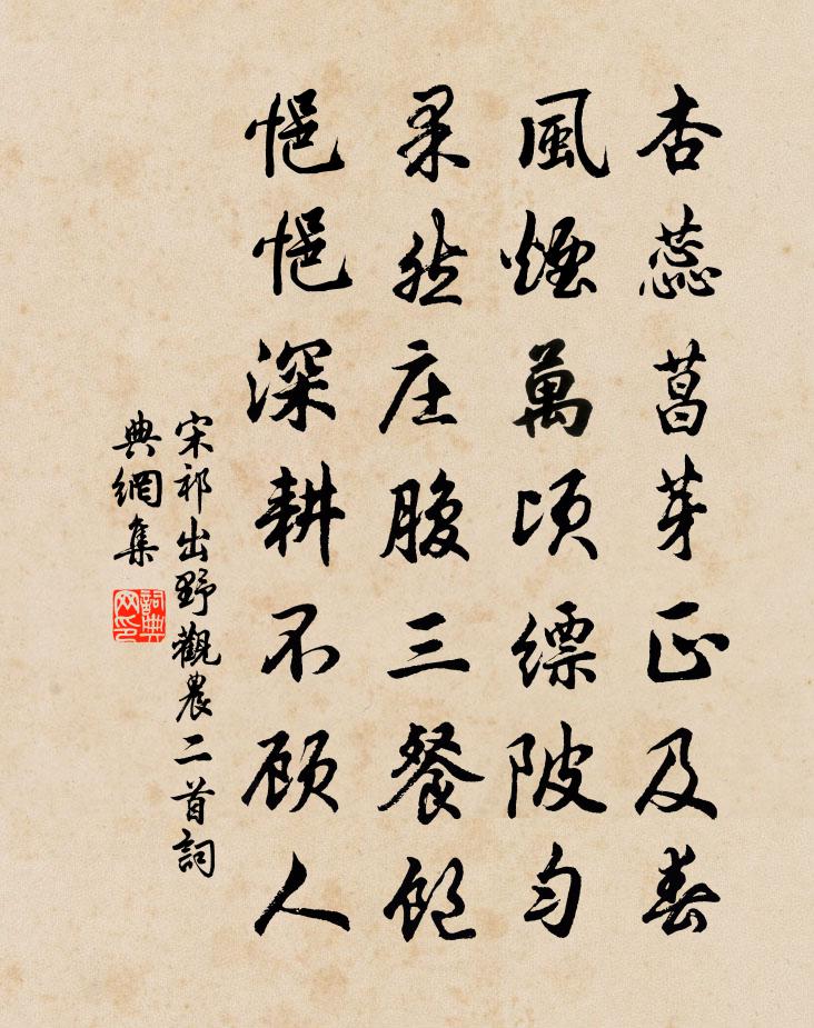 詩詞名句歷史字典書法欣賞書法字典國語詞典說文解字康熙字典古漢語字典標 題 作 者 詩 句 出野觀農二首作者:宋祁 朝代:宋代出野觀農二首原文杏蕊菖芽正及春,風煙萬頃縹陂勻。果然莊腹三餐飽,悒悒深耕不顧人。詩詞問答問:出野觀農二首的作者是誰?答:宋祁問:出野觀農二首寫於哪個朝代?答:宋代問:宋祁的名句有哪些?答:宋祁名句大全宋祁出野觀農二首書法欣賞出野觀農二首書法作品詩詞推薦恭次家大人初抵季弟海陵官舍之韻孫應求〔宋代〕食貧寧問肉如陵,且喜官曹簡事程。千里平淮隨地闊,一江遠水照水明。幾我懷古登臨意,時作搔頭諷詠聲。酬唱漁家傲歐陽修〔宋代〕八月微涼生枕簟。金盤露洗秋光淡。池上月華開寶鑑。波瀲灩。故人千里應憑檻。蟬樹無情風苒苒。燕歸碧海珠簾朝中措張掄〔宋代〕蕭蕭蘆葉暮寒生。雪厭凍雲平。密灑一篷煙火,驚鴻飛起沙汀。收綸罷釣,空江有浪,短棹無聲。便是天然圖畫,句王子俊〔宋代〕再見山城石井邊。夜泊湘江於武陵〔唐代〕北風吹楚樹,此地獨先秋。何事屈原恨,不隨湘水流。涼天生片月,竟夕伴孤舟。一作南行客,無成空白頭。次韻李季章監簿泛湖樓鑰〔宋代〕仙舟共泛滄波去,且向蘇公堤下住。西風吹就芙蓉城,青鏡閒妝兩呈露。皇家家法崇儉素,宸心但欲乘商輅。離宮詠笛詩蕭衍〔南北朝〕柯亭有奇竹。含情復抑揚。妙聲發玉指。龍音響鳳凰。句陳郁〔宋代〕游歸雲衲破,定起石床瘟。漁家傲 夫人生朝王寂〔元代〕前日河梁修禊罷。閒庭未拆鞦韆架。萱草堂深飛壽。香滿把。彩衣蘭玉森如畫。海上 * 親命駕。玄霜乞得宜春秋懷十首微雲淡河漢疏雨滴梧桐為韻楊冠卿〔宋代〕晚雲暫垂陰,零露不成滴。鄰牆幾好樹,葉下聲策策。一燈同夜闌,此抱誰與適。前身豈壁魚,甘擅文字癖。憂秋旅懷作杜牧〔唐代〕促促因吟晝短詩,朝驚穠色暮空枝。無情春色不長久,有限年光多盛衰。往事只應隨夢裡,勞生何處是閒時?眼前和晁十七晝眠張耒〔宋代〕冉冉殘春去,悠悠歸夢賒。窗圍幽幌靜,風引晝簾斜。清蔭延高柳,余紅惜晚花。山居諳靜僻,詩句是生涯。怪夢十首方回〔宋代〕萬變觀時事,誰其肉食謀。乾坤一儒腐,今古兩眉愁。白首生何益,青春逝不留。孤燈夜夜坐,曉角動軍樓。後苑賞花應製楊億〔宋代〕雲羅霞綺媚芳辰,瓊圃花開爛漫春。風遞清香隨鳳輦,波涵倒影落龍津。仙葩四照烘初日,濃艷千苞賜近臣。向晚台中里行詠佚名〔宋代〕柱下雖為史,台中未是官。何時聞必也,早晚見任端。點絳唇蔡伸〔宋代〕雲雨匆匆,洞房當日曾相遇。暫來還去。無計留春住。寶瑟重調,靜聽鶯弦語。休輕負。綺窗朱戶。好做風光主。長命洲楊修〔宋代〕梁武慈悲不鼎烹,蒙恩豢養亦虛名。狐狸口腹應潛飽,就死多於日放翁。旅中遣懷於石〔宋代〕片雲相望浙東西,回首家山路欲迷。昨夜桐江江上夢,倒隨流水上雙溪。錦帶佩吳鉤張友正〔唐代〕帶劍誰家子,春朝紫陌游。結邊霞聚錦,懸處月隨鉤。彩縷回文出,雄芒練影浮。葉依花里艷,霜向鍔中秋。的皪雜劇·爭報恩三虎下山佚名〔元代〕楔子(沖末扮宋江引僂儸上)(宋江詞雲)只因誤殺閻婆惜,逃出鄆州城,占下了八百里梁山泊,搭造起百十座水名句推薦寧做太平犬,莫做離亂人!佚名《增廣賢文·下集》 瀉水置平地,各自東西南北流。鮑照《擬行路難十八首》 成事享其功,敗事委其過,且聖人弗能逾者,概人之本然也。來俊臣《羅織經·閱人卷第一》 小樓昨夜又東風,故國不堪回首月明中。李煜《虞美人·春花秋月何時了》 內省不疚,夫何憂何懼!孔子弟子《論語·顏淵篇》 三更月。中庭恰照梨花雪。賀鑄《子夜歌·三更月》 黃華自與西風約,白髮先從遠客生。元好問《秋懷》 坐蔭從容煩暑退,清心恍惚微香觸。陸容《滿江紅·詠竹》 學而時習之,不亦說乎?佚名《論語十則》 妖嬈艷態,妒風笑月,長殢東君。李清照《慶清朝·禁幄低張》