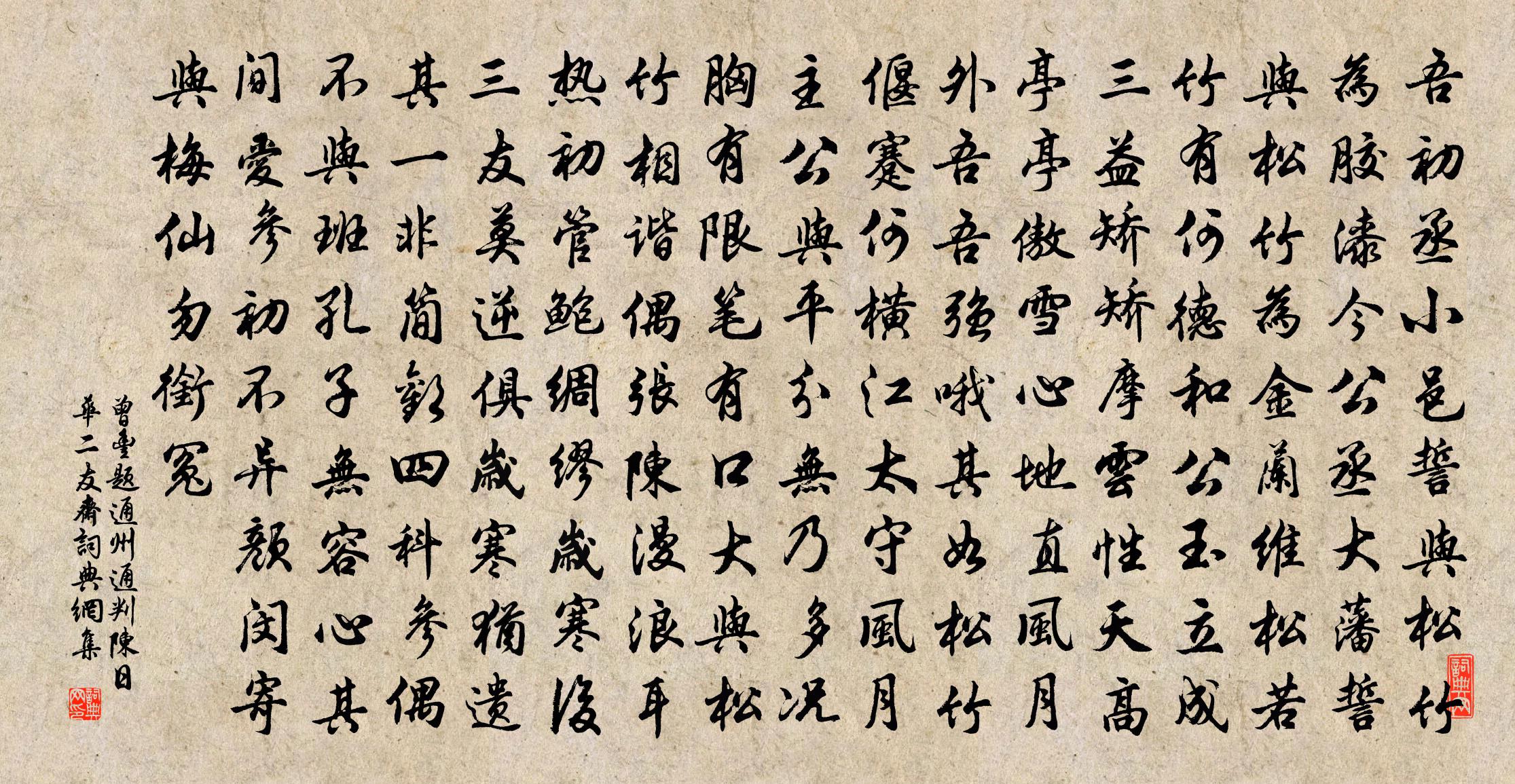 詩詞名句歷史字典書法欣賞書法字典國語詞典說文解字康熙字典古漢語字典標 題 作 者 詩 句 題通州通判陳日華二友齋作者:曾豐 朝代:宋代題通州通判陳日華二友齋原文吾初丞小邑,誓與松竹為膠漆。今公丞大藩,誓與松竹為金蘭。維松若竹有何德,和公玉立成三益。矯矯摩雲性天高,亭亭傲雪心地直。風月外吾吾強喔,其如松竹偃蹇何。橫江太守風月主,公與平分無乃多。況胸有限筆有口,大與松竹相諧偶。張陳漫浪耳熱初,管鮑綢繆歲寒後。三友莫逆俱歲寒,猶遺其一非簡歡。四科參偶不與班,孔子無容心其間。愛參初不異顏閔,寄與梅仙勿銜冤。詩詞問答問:題通州通判陳日華二友齋的作者是誰?答:曾豐問:題通州通判陳日華二友齋寫於哪個朝代?答:宋代曾豐題通州通判陳日華二友齋書法欣賞題通州通判陳日華二友齋書法作品詩詞推薦牡丹吳琚〔宋代〕牡丹乘春芳,風雨苦相妒。朝來小庭中,零落已無數。魂銷梓澤國,腸斷馬嵬路。盡日向欄乾,踟躕不能去。次韻蕭同年古意方岳〔宋代〕猗猗者芳蘭,翳翳彼幽麓。不煩漢陰人,抱瓮相灌沐。春風自桃李,急管亂繁曲。紛紛眾醉間,美此一醒獨。造化送陳判官赴綏德賈島〔唐代〕將軍邀入幕,束帶便離家。身暖蕉衣窄,天寒磧日斜。火燒岡斷葦,風卷雪平沙。絲竹豐州有,春來只欠花。大雨排悶陸游〔宋代〕地潤礎流水,氣蒸人脫裘。前知暴雨至,孰解老農憂?已酉上元詩同日立春胡仲弓〔宋代〕又是京華見上元,一番燈火奪春寒。花蛾巧剪禁風撲,彩燕新裁帶月看。客里無家愁對酒,吟邊索句夜憑欄。寄言次韻使君湖莊歌曹彥約〔宋代〕使君德量湖水寬,和氣襲人春避寒。山川自古窮絕處,鑄鐵點頑成轉丹。頻作好詩醇似酒,妃子鬥妍西子醜。人生水龍吟譚處端〔元代〕瑞雲捧出三峰,上真下化宸游地。祥雲深鎖,瓊樓寶殿,琳宮幽邃。萬頃嵐光里。依稀降、玉泉蓮水。望仙人掌上湖天暮景五首楊萬里〔宋代〕坐看西日落湖濱,不是山御不是雲。寸寸低來忽全沒,分明入水只無痕。和洪司令梅花吳泳〔宋代〕素肌香骨水為寒,曲樹斜枝木作酸。百匝繞花看未足,庭代參斗夜闌乾。句駱儒賓〔宋代〕烹羆籜龍新上籌,修來秧成尚依牆。此軒釋智愚〔宋代〕一梁對一柱,綽綽自橫陳。誰擬復誰即,溫然無故新。和陶貧士七首蘇軾〔宋代〕芙蓉雜金菊,枝葉長闌乾。遙憐退朝人,糕酒出大官。豈知江海上,落英亦可餐。典衣作重陽,徂歲慘將寒。無衣景和尚號石庵釋智愚〔宋代〕空岩為懷薜蘿門,天巧渾無斧鑒痕。花鳥不來雲自合,豎拳訊息與誰論。始生七章章八句上皇子嘉王生辰陳傅良〔宋代〕獵人愛麛麌,漁人愛鯤鮞。萬物欣自遂,況也民秉彝。家有舉桉婦,人有譍門兒。王心至於此,壽不數耆頤。沁園春(二月廿七)程東灣〔宋代〕毓德婺虛,聯輝魁宿,天啟儒英。正仲春蓂階,三留葉秀,曉來蓬矢,六掛門榮。星昴誕蕭,神嵩降甫,怎似今朝初到都下供職寄黃九張耒〔宋代〕千里不相見,勞勞復何辭。不遠一城中,耿耿令我思。僦舍酒家樓,推壚卷其旗。鼠壤敗晨炊,守翁噪群兒。馬傍六叔父生朝三首項安世〔宋代〕百摺榴花照畫筵,八千椿歷記遐年。東公西母朱顏老,玉女金童彩服鮮。梅雨漲添春色酒,麥秋黃起壽爐煙。銅壺春晚官舍呈幕中宋祁〔宋代〕萬點飛花拂路塵,行春罷後惜殘春。雨催菖葉全成甲,風播榆錢不算緡。多病已慚官綬束,長年惟共酒杯親。坐題水軒鄭谷〔唐代〕日日狎沙禽,偷安且放吟。讀書老不入,愛酒病還深。歉後為羈客,兵余問故林。楊花滿床蓆,搔首度春陰。久病陸游〔宋代〕臥疾閱三時,冥冥不自持。婢諳曾製藥,犬識舊迎醫。質貸交親厭,呻吟里巷知。有時推枕起,清嘯尚能奇。名句推薦猶喜閏前霜未下,菊邊依舊舞身輕。司空圖《白菊三首》 松竹含新秋,軒窗有餘清。崔元翰《奉和聖制中元日題奉敬寺》 相逢處,自有暗塵隨馬。周邦彥《解語花·上元》 放眼暮江千頃,中有離愁萬斛,無處落征鴻。楊炎正《水調歌頭·把酒對斜日》 封侯非我意,但願海波平。戚繼光《韜鈐深處》 誰言千里自今夕,離夢杳如關塞長。薛濤《送友人》 天外黑風吹海立,浙東飛雨過江來。蘇軾《有美堂暴雨》 欲人之處高爵祿,則以讓賢也;多財則以分貧也。墨子《墨子·49章 魯問》 可憐處處巢居室,何異飄飄托此身。杜甫《燕子來舟中作》 萋萋春草秋綠,落落長松夏寒。王維《田園樂七首·其四》