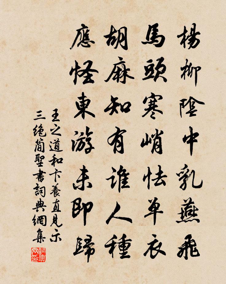 詩詞名句歷史字典書法欣賞書法字典國語詞典說文解字康熙字典古漢語字典標 題 作 者 詩 句 和卞養直見示三絕簡聖書作者:王之道 朝代:宋代和卞養直見示三絕簡聖書原文楊柳陰中乳燕飛,馬頭寒峭怯單衣。胡麻知有誰人種,應怪東遊未即歸。詩詞問答問:和卞養直見示三絕簡聖書的作者是誰?答:王之道問:和卞養直見示三絕簡聖書寫於哪個朝代?答:宋代王之道和卞養直見示三絕簡聖書書法欣賞和卞養直見示三絕簡聖書書法作品詩詞推薦鹹通十四年府試木向榮(題中用韻)鄭谷〔唐代〕園林青氣動,眾木散寒聲。敗葉牆陰在,滋條雪後榮。欣欣春令早,藹藹日華輕。庾嶺梅先覺,隋堤柳暗驚。山川送格堯臣宋祁〔宋代〕祖帟都門路,秋風滿客衣。台舟三鷁駛,官舄兩鳧飛。鄉思臨波遠,離憂傍酒微。不應緣事事,手自廢談圍。村社歌李若川〔宋代〕清曉冬冬鳴杜鼓,前村後村走兒女。田家醵錢共賽神,謝神時晴復時雨。案有餚酒爐有香,老巫禱祝躬案傍。願得呈府判兄姜特立〔宋代〕端憂傷逝者,花事欲如何。春色愁邊少,悲悰酒後多。溪桃方著臉,區木漸成窠。擬作開眉計,何當掃障魔。題古城岩鄒補之〔宋代〕依然雉堞古城基,開創由來自漢隋。南北兩門余舊日,黔黎百歲話當時。循山{左浮右虎}{左浮右虎}陳公堨,雨後月明起坐戲成舒岳祥〔宋代〕雨後月明,如醉而醒。不見其形,但見其影。我夢初回,非曙非暝。道人無言,起舞弄景。永鳥無聲,一鶴自警。寓居等慈寺感懷趙善傅〔宋代〕欽從王命寄招提,寂寂荒階綠草齊。明月夜深接佛閣,看來不比汴梁時。祭酒慈谿公以有令勸講兼示諸生感事有作區仕衡〔宋代〕按月明堂令,齋居古自稽。四時曾不忒,七政已能齊。禮向經帷奏,箋來學省題。元龜何用卜,伯起在關西。送陳守郭印〔宋代〕惟昔號能吏,在公勤嚴明。挾茲來共理,教化日流行。堂堂陳漢州,所至樹風聲。四美出天性,早擅循良名。平心寄人釋妙倫〔宋代〕去年共繞潤濱行,話盡山雲海月情。芳樹幽禽尤記得,風前時作兩三聲。菩薩蠻(初冬旅思)趙長卿〔宋代〕楓林颯颯凋寒葉。汀苹敗蓼遙相接。景物已非秋。淒涼動客愁。還家貧亦好。肯厭杯中草。香飯滑流匙。三登快樂和范元作五絕胡寅〔宋代〕閱書五行下,未勝百回讀。至道一念存,請事不遠復。同子文、材翁、子直、蕭巨、濟中元夜東園望楊萬里〔宋代〕月到東園分外光,行行坐坐間傳觴。生愁蹈碎千花影,回顧千花總不妨。哭孟東野賈島〔唐代〕蘭無香氣鶴無聲,哭盡秋天月不明。自從東野先生死,側近雲山得散行。夜坐章甫〔宋代〕枕簟遲遲睡,軒窗一一開。市收人語寂,江迥水風來。熠耀明衣袂,嬋娟到酒杯。新涼兒女健,促織已相催。再次前韻留黃縣尉二首項安世〔宋代〕郵亭別酒也須傾,底作匆匆向永明。蓮里青心猶有意,雨中紅日可無情。吾伊未了吾難出,子墨傅言子試評。回首送譚三藏入京齊己〔唐代〕阿闍梨與佛身同,灌頂難施利濟功。持咒力須資運祚,度人心要似虛空。東周路踏紅塵里,北極門瞻紫氣中。好進和寄可庵盧教諭何夢桂〔宋代〕平生浪說齊諧志,杞國有天驚墮地。不周摧折天柱傾,咄咄古今真怪事。元氣不死橋運興,千古日月長懸奔。照見西太乙宮陳朝檜宋孝宗〔宋代〕道人手種幾生前,鶴骨龍姿尚宛然。雙乾一先神物化,九朝三見太平年。忽驚華構依岩出,乞與佳名到處傳。此柏淳熙七年端午帖子詞皇帝合六首崔敦詩〔宋代〕黃道星辰移企翼,青冥風露近飛檐。翠華晚過凌虛殿,一色明珠十二簾。名句推薦晚來風起花如雪,飛入宮牆不見人。劉禹錫《楊柳枝詞九首》 誠者,不勉而中不思而得:從容中道,聖人也。子思《中庸·第二十章》 力田不如逢年,善仕不如遇合。司馬遷《史記·佞幸列傳》 誠知此恨人人有,貧賤夫妻百事哀。元稹《遣悲懷三首·其二》 暗室虧心,神目如電。徐田臣《戲文·殺狗記》 離人心上秋。吳文英《唐多令·惜別》 言不中,行不謹,辱也。王通《中說·卷一·王道篇》 喜得故人同待詔,擬沽春酒醉京華。高啟《清明呈館中諸公》 絕代有佳人,幽居在空谷。杜甫《佳人》 得寵思辱,居安思危。佚名《增廣賢文·上集》