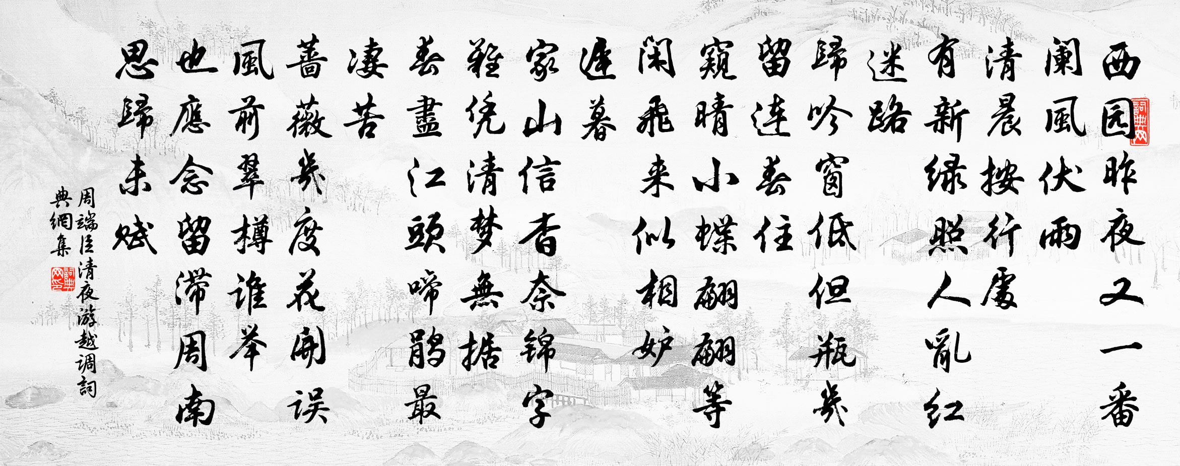 詩詞名句歷史字典書法欣賞書法字典國語詞典說文解字康熙字典古漢語字典標 題 作 者 詩 句 清夜遊(越調)作者:周端臣 朝代:宋代清夜遊(越調)原文西園昨夜,又一番、闌風伏雨。清晨按行處。有新綠照人,亂紅迷路。歸吟窗低,但瓶幾留連春住。窺晴小蝶翩翩,等閒飛來似相妒。遲暮。家山信杳,奈錦字難憑,清夢無據。春盡江頭,啼鵑最悽苦。薔薇幾度花開,誤風前、翠樽誰舉。也應念、留滯周南,思歸未賦。詩詞問答問:清夜遊(越調)的作者是誰?答:周端臣問:清夜遊(越調)寫於哪個朝代?答:宋代問:清夜遊(越調)是什麼體裁?答:詞周端臣清夜遊(越調)書法欣賞清夜遊(越調)書法作品詩詞推薦七月十二日出城張九成〔宋代〕一水去縈繞,四山來周遭。夷猶聊適意,登降自忘勞。五嶺煙雲古,三江氣象豪。此邦真蕞爾,形勝助風騷。隆興書堂自警三十五首陳淳〔宋代〕堂中鶴髮老,臞臞未能寬。泮渙而爾游,於汝其獨安。從軍行王宏〔唐代〕兒生三日掌上珠,燕頷猿肱穠李膚。十五學劍北擊胡,羌歌燕築送城隅。城隅路接伊川驛,河陽渡頭邯鄲陌。可憐和陶讀山海經十三首韻送機簡堂自景星岩再住吳芾〔宋代〕紛紛學禪者,腰包競奔走。才能脫葛藤,痴意便自負。求其道德尊,如師蓋希有。願傅上乘人,永光臨濟後。六言偈四首劉克莊〔宋代〕佛祖流傳信具,兒孫承襲付度。一個深夜攜歸,一個中路奪去。風蟬賈島〔唐代〕風蟬旦夕鳴,伴葉送新聲。故里客歸盡,水邊身獨行。噪軒高樹合,驚枕暮山橫。聽處無人見,塵埃滿甑生。自安仁至豫章途中雜興十九首趙蕃〔宋代〕已是酴醾墮玉塵,尚余芍藥殿殘春。山行寂寞那逢此,喜向僧房見斬新。寄題長溪楊恥齋梅樓樓乃其先世讀書之所陳鑒之〔宋代〕乃翁愛書書滿樓,萬軸插架堪汗牛。乃翁愛梅梅繞樓,千年老乾如蒼虬。梅護群書俗塵絕,書對梅梢滋味別。有時送林子長赴姑孰泮宮虞儔〔宋代〕綠波風駛引征帆,九萬扶搖入羽翰。詩句最憐雲不定,宦情況與月同寒。襟期莫作別時惡,出處須留晚歲看。漫道琴調相思引(越上賞花)汪元量〔宋代〕曉拂菱花巧畫眉。猩羅新翦作春衣。恐春歸去,無處看花枝。已恨東風成去客,更教飛燕舞些時。惜花人醉,頭上嘲飛卿七首段成式〔唐代〕曾見當壚一個人,入時裝束好腰身。少年花蒂多芳思,只向詩中寫取真。醉袂幾侵魚子纈,飄纓長罥鳳凰釵。知君答許覺之惠桂花椰子茶盂二首黃庭堅〔宋代〕萬事相尋榮與衰,故人別來鬢成絲。欲知歲晚在何許,唯說山中有桂枝。賦園中所有十首蘇轍〔宋代〕萱草朝始開,呀然黃鵠觜。仰吸日出光,口中爛如綺。纖纖吐須鬣,冉冉隨風哆。朝陽未上軒,粲粲幽閒女。美女簾杜衍〔宋代〕編竹狀玲瓏,庭闈盡處中。不由經緯力,安有卷舒勁。春畫曾妨燕,寒宵豈隔風。都堂重獻賦,明處憶牢籠。再答冕仲黃庭堅〔宋代〕丘壑詩書雖數窮,田園芋栗頗時豐。小桃源口雨繁紅,春溪蒲稗沒鳧翁。投身世網夢歸去,摘山鼓聲雷隱空。秋堂嫦娥奔月 / 嫦娥飛天佚名〔兩漢〕昔者,羿狩獵山中,遇姮娥於月桂樹下。遂以月桂為證,成天作之合。 逮至堯之時,十日並出。焦禾稼,殺草十疊劉克莊〔宋代〕有花多處便憑欄,插在金瓶不必看。百斛量珠真富貴,兩枝剪彩太寒酸。送宇文三赴河西充行軍司馬王維〔唐代〕橫吹雜繁笳,邊風卷塞沙。還聞田司馬,更逐李輕車。蒲類成秦地,莎車屬漢家。當令犬戎國,朝聘學昆邪。清湖春早二首方回〔宋代〕半河樓景半河天,未有行人趁早船。閒聽賣花聲自好,可須多費買藥錢。偈頌一百零九首釋可湘〔宋代〕追憶仙遊輦未還,特輸忠赤舉風幡。制開玉殿黃金鎖,最忌當頭觸聖顏。名句推薦倉稟無宿儲,徭役猶未已。韋應物《觀田家》 坐上別愁君未見,歸來欲斷無腸。蘇軾《臨江仙·送王緘》 莫買沃洲山,時人已知處。劉長卿《送方外上人/送上人》 有孫母未去,出入無完裙。杜甫《石壕吏》 至今思項羽,不肯過江東。李清照《夏日絕句》 紫燕一雙嬌語碎,翠屏十二晚峰齊,夢魂消散醉空閨。毛熙震《浣溪沙·花榭香紅煙景迷》 淚彈不盡臨窗滴。就硯旋研墨。晏幾道《思遠人·紅葉黃花秋意晚》 積薄而為厚,聚少而為多劉向《戰國策·秦四·或為六國說秦王》 沅有芷兮澧有蘭,思公子兮未敢言。屈原《九歌·湘夫人》 柳下桃蹊,亂分春色到人家。秦觀《望海潮·洛陽懷古》