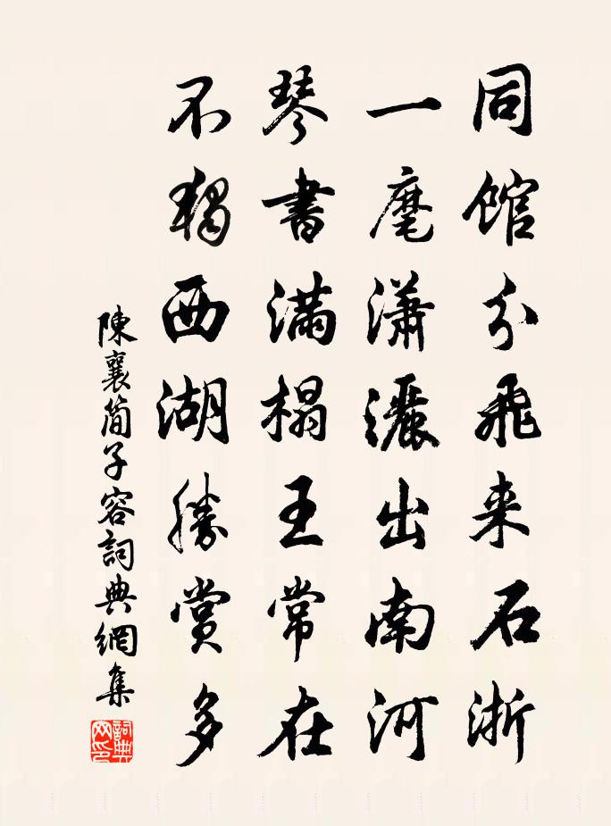 詩詞名句歷史字典書法欣賞書法字典國語詞典說文解字康熙字典古漢語字典標 題 作 者 詩 句 簡子容作者:陳襄 朝代:宋代簡子容原文同館分飛來石浙,一麾瀟灑出南河。琴書滿榻王常在,不獨西湖勝賞多。詩詞問答問:簡子容的作者是誰?答:陳襄問:簡子容寫於哪個朝代?答:宋代陳襄簡子容書法欣賞簡子容書法作品詩詞推薦後江行十絕岳珂〔宋代〕官牌夾外少人煙,商婦琵琶久斷弦。司馬青衫不須泣,江鷗對我正忻然。酬樂天寄蘄州簟元稹〔唐代〕蘄簟未經春,君先拭翠筠。知為熱時物,預與瘴中人。碾玉連心潤,編牙小片珍。霜凝青汗簡,冰透碧游鱗。水魄呈趙常德四首趙蕃〔宋代〕東南為最賤,舊說湖南北。及今身見之,價豈不江國。此行為米來,對此增嘆息。人謂使君賢,寧慮有失職。秦題孫使君池館戴表元〔宋代〕白髮使君經世材,盡間猶解暢池台。雜花屏障四時有,明月鏡奩三面開。各坐山隨人意看,正吟風遞鳥聲來。當年鷓鴣天劉秉忠〔元代〕清夜喔詩對月明。詩魂偏向月邊清。欲成小夢還驚破,無柰洋河聒枕聲。紅日曉,碧天晴。風沙撲面過雞鳴。漯陽三月三日定昆池奉和蕭令得潭字韻張說〔唐代〕暮春三月日重三,春水桃花滿禊潭。廣樂逶迤天上下,仙舟搖衍鏡中酣。常山縣項安世〔宋代〕常山縣東足可惜,山光半紫溪全碧。柳嶼陰中軋軋車,桑疇徑里青青麥。溪流終日伴人行,隔岸青山喚得譍。石季禪人並化主寫真求贊釋正覺〔宋代〕野雪發須,秋山肌膚。物齊芳蝶夢,情盡露蟬枯。跡弭水歸海,光回星轉樞。言前薦得猶封殼,喝下承當又觸途。種麥後栽補桑柘至田家憩息舒岳祥〔宋代〕桑柘疏時補,篁茅密處刪。水邊黃葉路,雨外夕陽山。一鳥自啼足,兩牛相對閒。山翁留壁記,子醜話時艱。山中見梅寄曾無疑戴復古〔宋代〕香動寒山寂寞濱,直從空谷見佳人。樹頭樹底參差雪,枝北枝南次第春。有此瑰琦在岩壑,其他草樹亦精神。移根十六觀經頌中品中生釋遵式〔宋代〕若人至心一日夜,持戒持齋無破缺。以此功德回願生,七日華敷成記莂。青玉案(用賀方回韻,有所禱而作)李之儀〔宋代〕小篷又泛曾行路。這身世、如何去。去了還來知幾度。多情山色,有情江水,笑我歸無處。夕陽杳杳還催暮。練淨湖州歌九十八首 其九十七汪元量〔宋代〕兩下金幱障御階,異香縹緲五門開。都人罷市從容立,迎接南朝駙馬來。吏人語佚名〔唐代〕不畏侯卿杖,惟畏尹卿筆。即事杜甫〔唐代〕百寶裝腰帶,真珠絡臂鞲。笑時花近眼,舞罷錦纏頭。立春日有感黃公度〔宋代〕三見春歸人未歸,天涯依舊賦春詩。一官得失不相補,萬事乘除只自知。年去年來供屈指,嶺南嶺北入支頤。柳眉卜運算元羅惜惜〔宋代〕幸得那人歸,怎便教來也。一日相思十二辰,真是情難捨。本是好因緣,又怕因緣假。若是教隨別個人,相見黃泉贈張南金二絕劉克莊〔宋代〕韓慥林開妙不傳,請君自逄小行年。公卿誰是揮金得,大半將詩準卦錢。漁家傲王以寧〔宋代〕往事閒思人共怕。十年塞上煙塵亞。百萬鐵衣馳鐵馬。都弄罷。八風斷送歸蓮社。賣藥得錢休教化。歸來醉臥蝸牛問漁叟徐凝〔唐代〕生事同漂梗,機心在野船。如何臨逝水,白髮未忘筌。名句推薦碧雲天,黃葉地,秋色連波,波上寒煙翠。范仲淹《蘇幕遮·懷舊》 歸燕識故巢,舊人看新曆。王維《春中田園作》 來日綺窗前,寒梅著花未。王維《雜詩三首 / 雜詠三首》 月有盈虧花有開謝,想人生最苦離別。張鳴善《普天樂·詠世》 無限河山淚,誰言天地寬夏完淳《別雲間》 綺席象床寒玉枕,美人何處醉黃花。汪元量《望江南·幽州九日》 請為父老歌,艱難愧深情杜甫《羌村三首·其三》 四十年來家國,三千里地山河李煜《破陣子·四十年來家國》 樹樹皆秋色,山山唯落暉。王績《野望》 一字無題外,落葉都愁。張炎《八聲甘州·記玉關踏雪事清游》