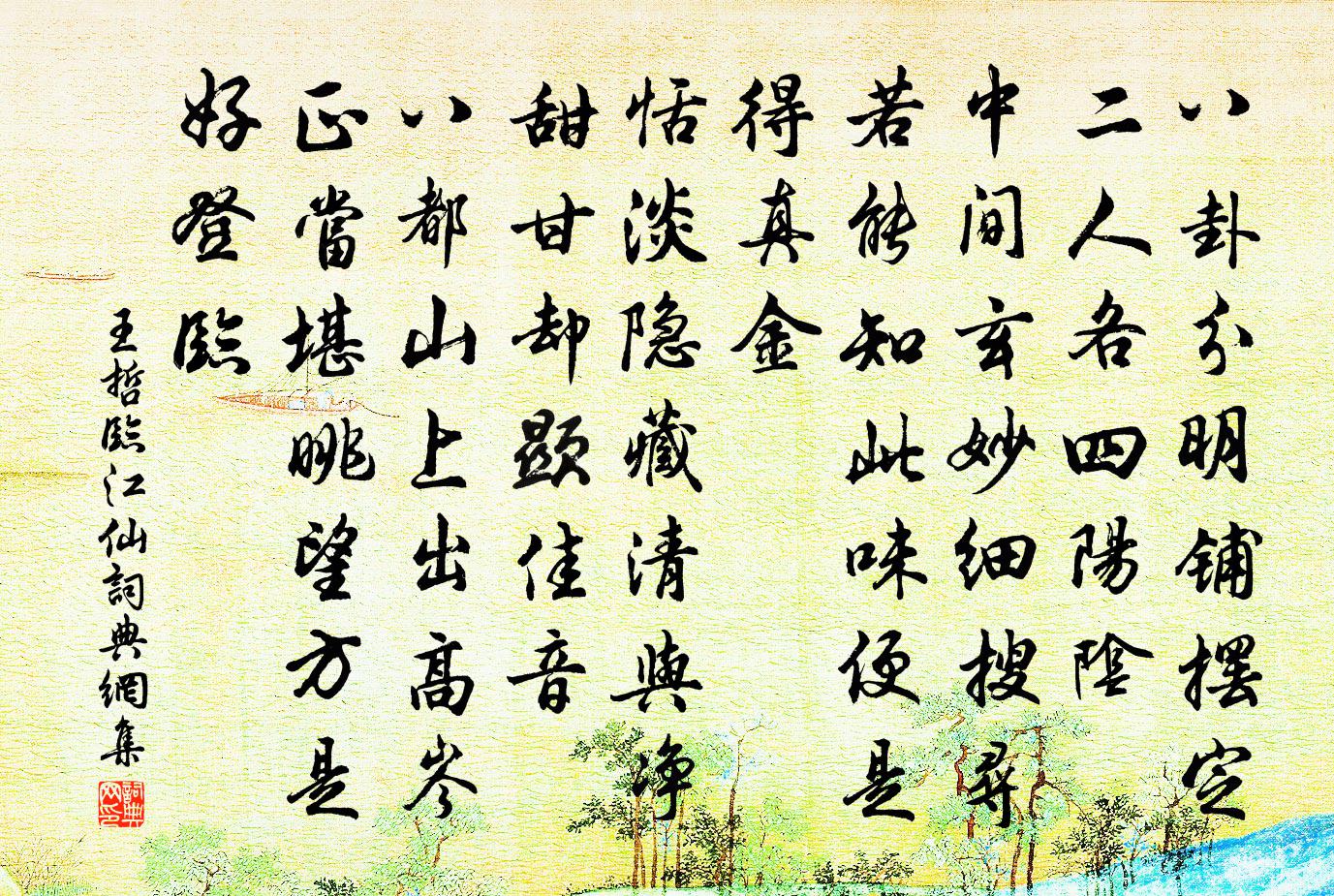 詩詞名句歷史字典書法欣賞書法字典國語詞典說文解字康熙字典古漢語字典標 題 作 者 詩 句 臨江仙作者:王哲 朝代:元代臨江仙原文八卦分明鋪擺定,二人各四陽陰。中間玄妙細搜尋。若能知此味,便是得真金。恬淡隱藏清與淨,甜甘卻顯佳音。八都山上出高岑。正當堪眺望,方是好登臨。詩詞問答問:臨江仙的作者是誰?答:王哲問:臨江仙寫於哪個朝代?答:元代問:臨江仙是什麼體裁?答:詞王哲臨江仙書法欣賞臨江仙書法作品詩詞推薦或以予辭酒為過復作長句陸游〔宋代〕陸生酒戶如蠡迮,痛酒豈能堪大白;正緣一快敗萬事,往往吐茵仍墮幘。爾來人情甚不美,似欲殺我以麴櫱。滿傾寄題鎮江寶墨堂晁說之〔宋代〕常潤特令賜吳楚,從此錢氏政相宜。江山閱世無今古,金石何年有合離。小諫縱歌文史外,侍郎決策甲兵期。只尋詠史六首司馬相如樂雷發〔宋代〕狗監無端薦薄情,鸘裘犢鼻帝鄉塵。當時最有文君恨,不識長門買賦人。鴛鴦湖棹歌 之十七朱彝尊〔清代〕西水驛前津鼓聲,原田角角野雞鳴。苔心菜甲桃花里,未到天明棹入城。 賢者之孝二百四十首老萊子林同〔宋代〕七十已中壽,人生似此希。絕憐老萊子,猶自作兒嬉。寄象山延壽無象和尚釋雲岫〔宋代〕瑞雲山裹善知識,道在東南海上行。擂鼓轉航容易事,秋風八月大潮生。史敷文輓詞樓鑰〔宋代〕學問源流遠,樂哉賢父兄。人琴亡舊曲,風木愴寒聲。深痛幾成毀,沉痾汔喪生。孝恭無可憾,猶得傍佳城。明慶寺詩江總〔隋代〕十五詩書日。六十軒冕年。名山極歷覽。勝地殊留連。幽厓聳絕壁。洞穴瀉飛泉。金河知證果。石室乃安禪。夜梵蝶戀花(和任路分荷花)趙長卿〔宋代〕憶昔臨平山下過。無數荷花,照水無纖黦。短艇直疑天上坐。醉眠花里香無那。雨浥紅妝嬌娜娜。脈脈含情,欲向乞桃竹於令尹王洋〔宋代〕小結幽棲事靜便,為無花竹不成村。在群佰里鳴弦地,成我一方濯錦園。按鼓威名知破膽,乞花詩句是招魂。桃溪叔孫通王令〔宋代〕弟子從來學未純,異時得失亦頻頻。一官所買知多少,便議先生作聖人。酒黃庭堅〔宋代〕江形圜似阮家盆,山勢岑如北海樽。戶有浮蛆春盎盎,雙松一路醉鄉門。守閘書事時已退居五首曹勛〔宋代〕坐斷天台四五年,居山心跡兩超然。誰能更看紙上語,且守自家方寸田。人事吟邵雍〔宋代〕人無取次,事莫因循。因循失事,取次壞人。人無率爾,事貴丁寧。率爾近薄,丁寧近誠。伏闕辭歸程康國〔宋代〕偶逢豺虎寢天關,事有當言恥口緘。不建侯藩控西北,別求何策保東南。幸投草野言無棄,退就山林老亦甘。束起禪人並化主寫真求贊釋正覺〔宋代〕青山之主兮體本平等,白雲之賓兮用能自然。應有餘兮神不可測,得其簡兮妙不可傳。首尾吟邵雍〔宋代〕堯夫非是愛吟詩,詩是堯夫詫劍時。當煅煉時分勁節,到磨礱處發光輝。長蛇封豕休撩亂,狡兔妖狐莫陸離。此器宿樂平縣北十里西塘楊萬里〔宋代〕破店能無漏,孤燈肯更明。中間通客路,終夜有人聲。坐又坐不得,眠來眠未成。如何故山友,抵死怨躬耕。和龔同叔春日即事五首趙善括〔宋代〕鶯簧方報暖,鳩喚未容晴。新漲長還減,痴雲暗復明。我生隨分樂,春事有餘情。聞道東湖好,相邀散策行。紅林檎近楊 * 〔宋代〕輕有鵝毛體,白如龍腦香。瓊筍綴飛桷,冰壺鑒方塘。渾如瑤台閬苑,更無茅舍蓬窗。畫閣自有梅裝。貪耍罷彈簧名句推薦那裡有鬧紅塵香車寶馬?祗不過送黃昏古木寒鴉。王磐《古蟾宮·元宵》 名聲若日月,功績如天地荀子《荀子·王霸》 迴廊一寸相思地,落月成孤倚。納蘭性德《虞美人·銀床淅瀝青梧老》 銅鑄金鏞振紀綱,聲傳海外播戎羌。曹雪芹《交趾懷古》 一疑一信相參勘,勘極而成知者,其知始真。洪應明《菜根譚·概論》 過眼年華,動人幽意,相逢幾番春換。王沂孫《法曲獻仙音·聚景亭梅次草窗韻》 力田不如逢年,善仕不如遇合。司馬遷《史記·佞幸列傳》 煢煢孑立,形影相弔。西晉·李密《陳情表》 萬里浮雲卷碧山,青天中道流孤月。李白《答王十二寒夜獨酌有懷》 善改過者,未禁其事,先明其理袁黃《了凡四訓·改過之法》